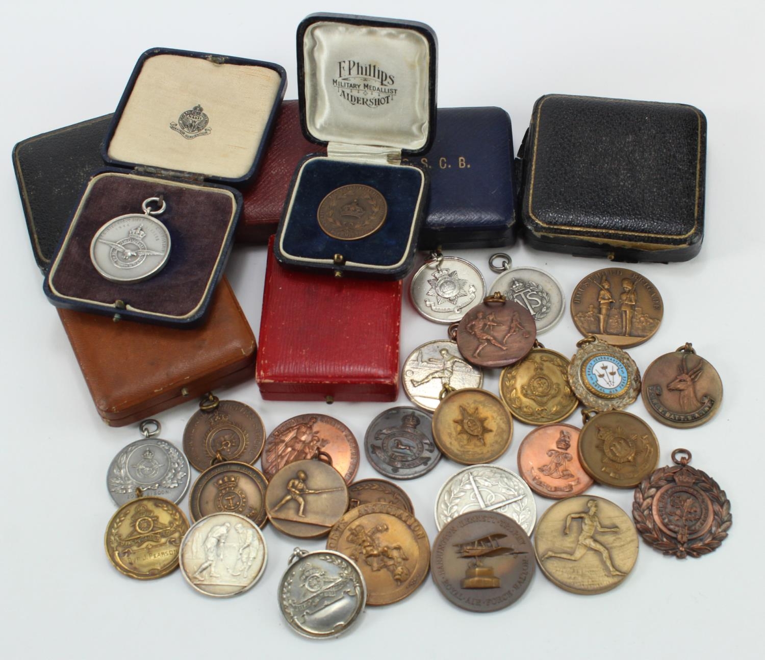 Military related sporting medals / fobs, many various types, some cased, 3x silver hallmarked noted. Sports include Hockey, shooting, football, etc. (approx 34 items)