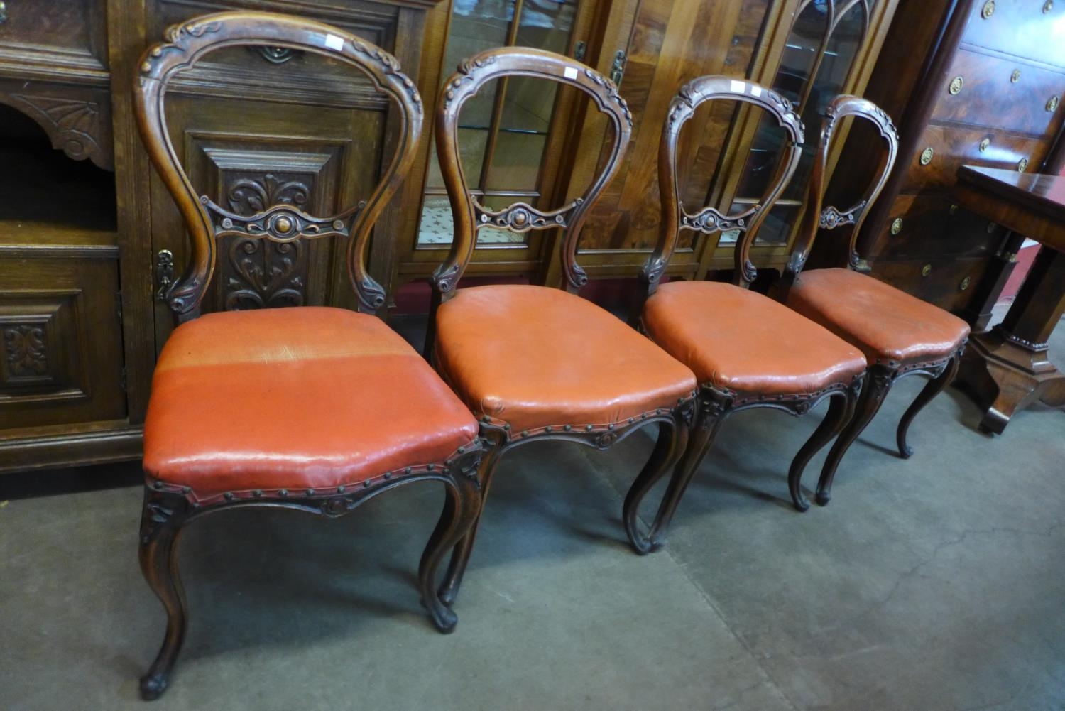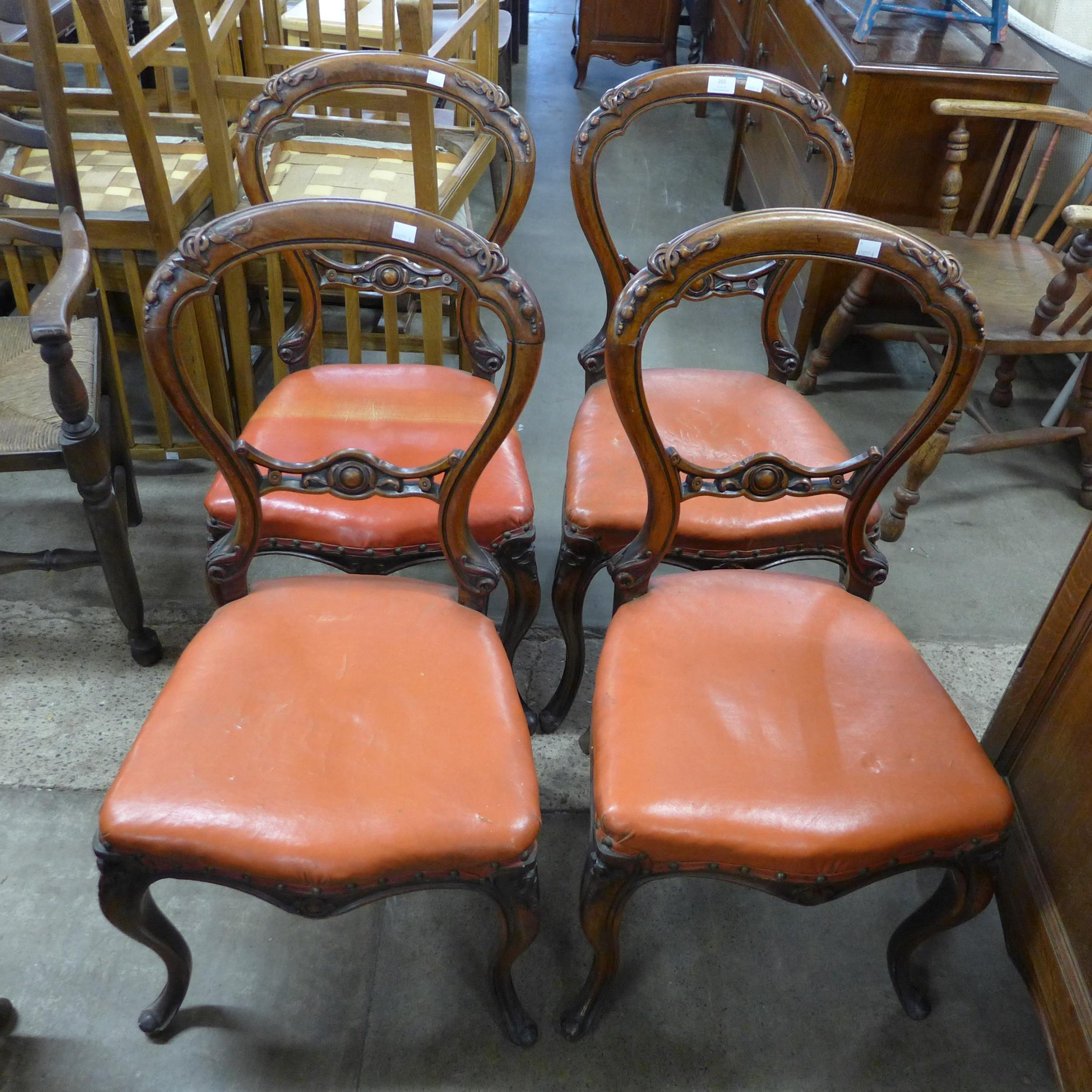 A set of four Victorian carved walnut balloon back dining chairs