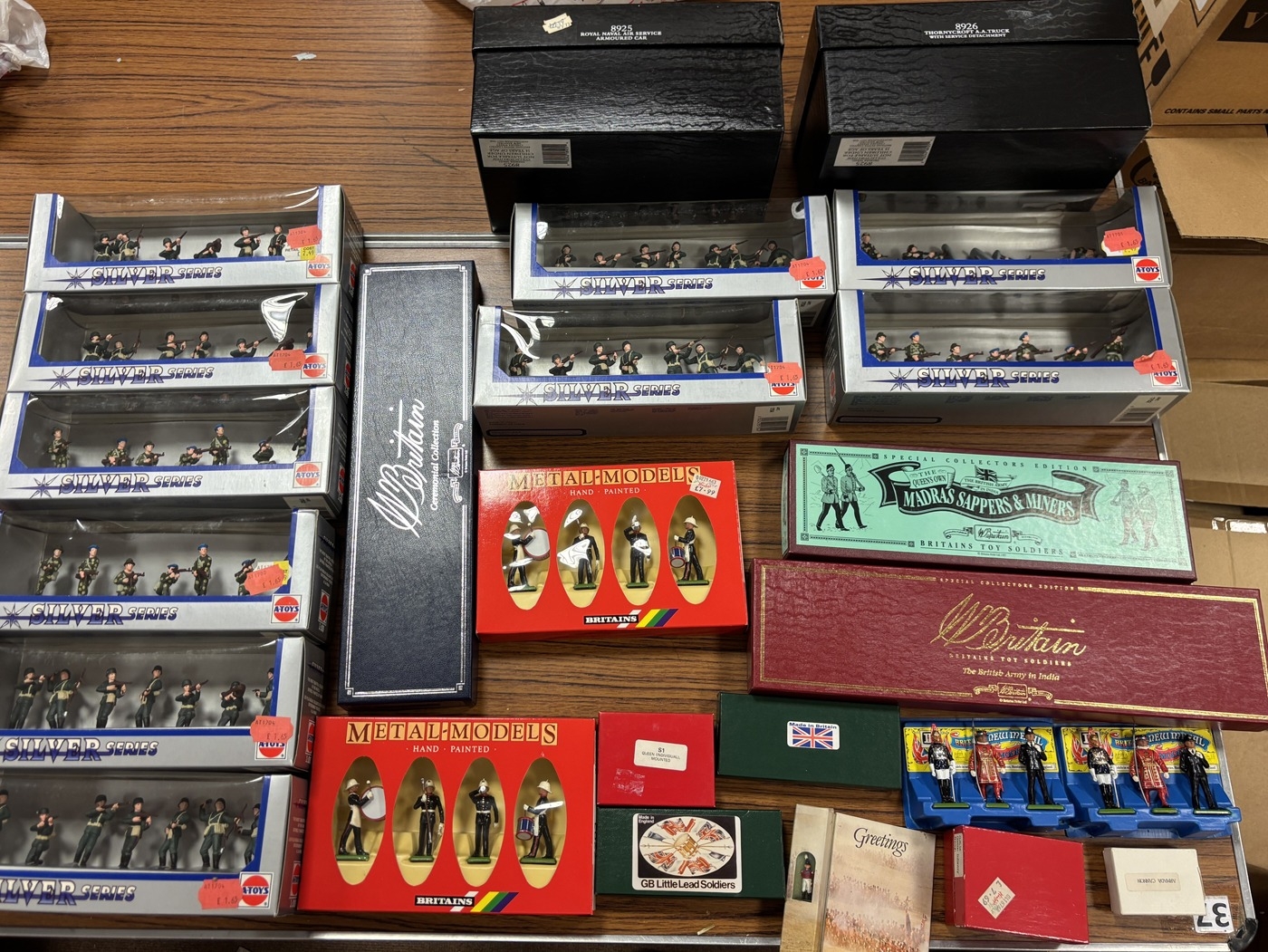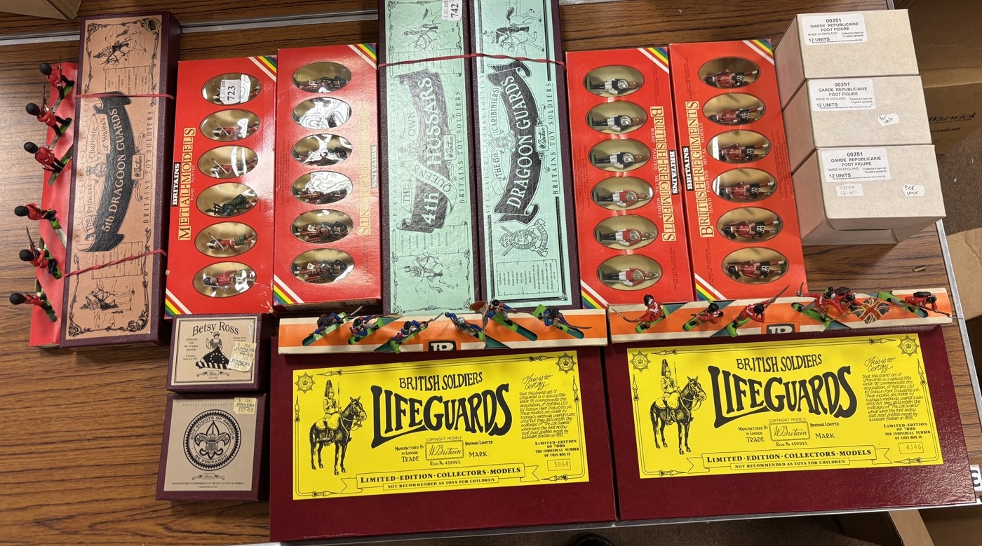 Collection of model soldiers from Napoleonic wars to WWII, generally excellent in excellent boxes, inclduing Britains No. 45993 (2), 5th Dragoon Guards, 4th Hussars, Dragoon Guards, Metal Soldiers set (6), Ceremonial Collection, Madras Sappers and Miners, The British Army in India, 8925, 8926, Atoys Silver Series (10) and further range of unboxed soldiers. Qty. 42. (2B)