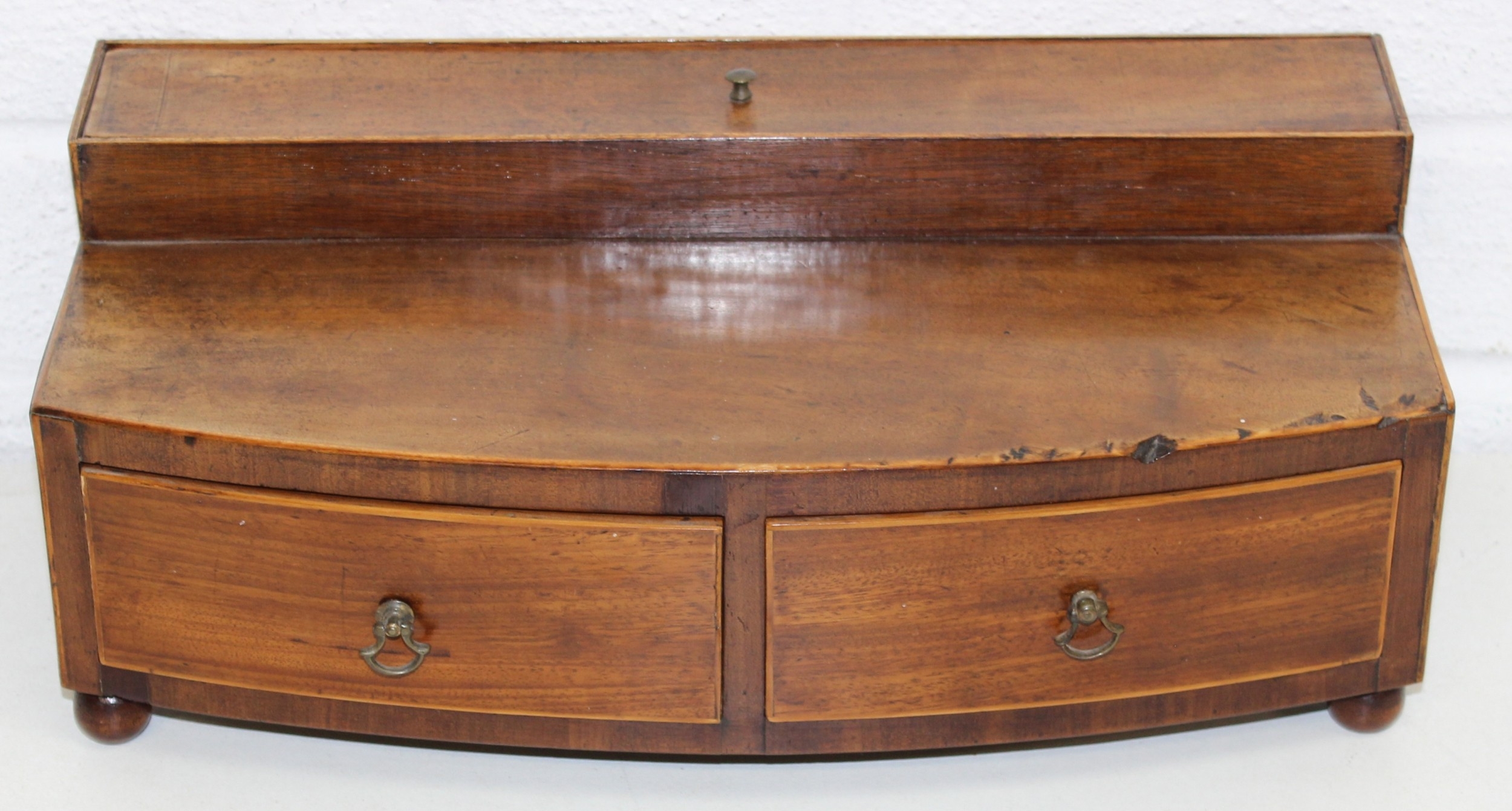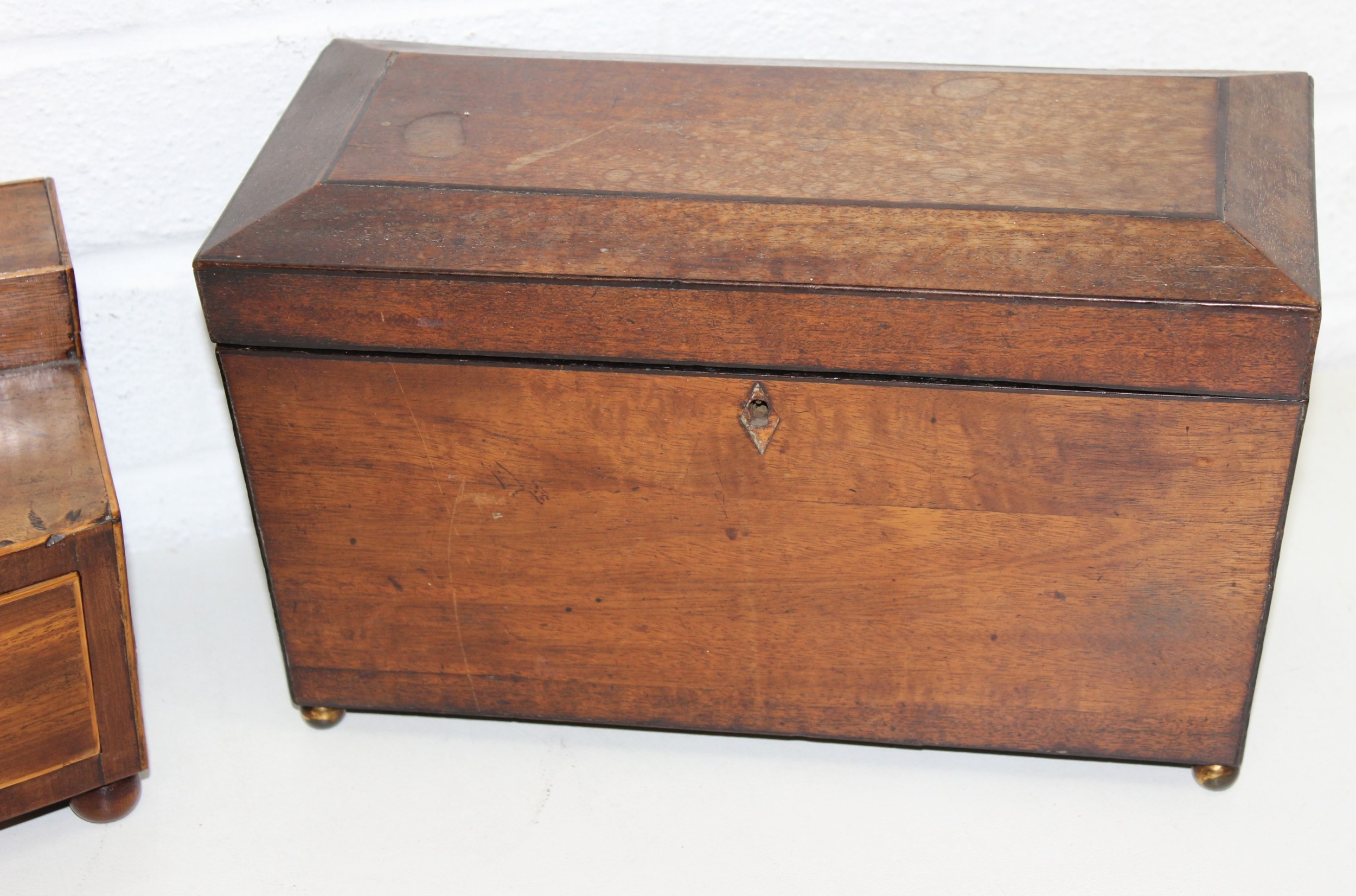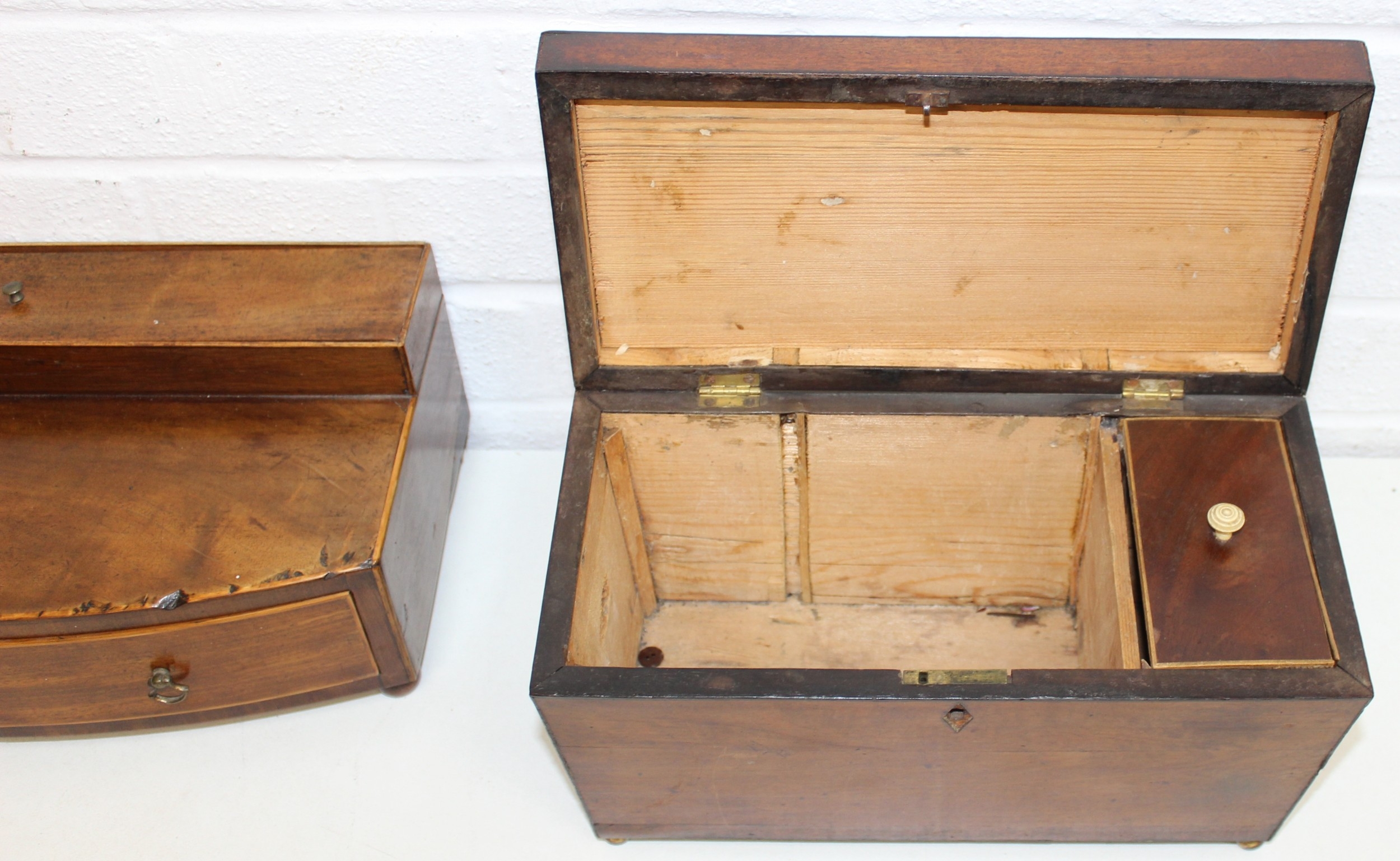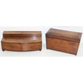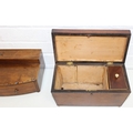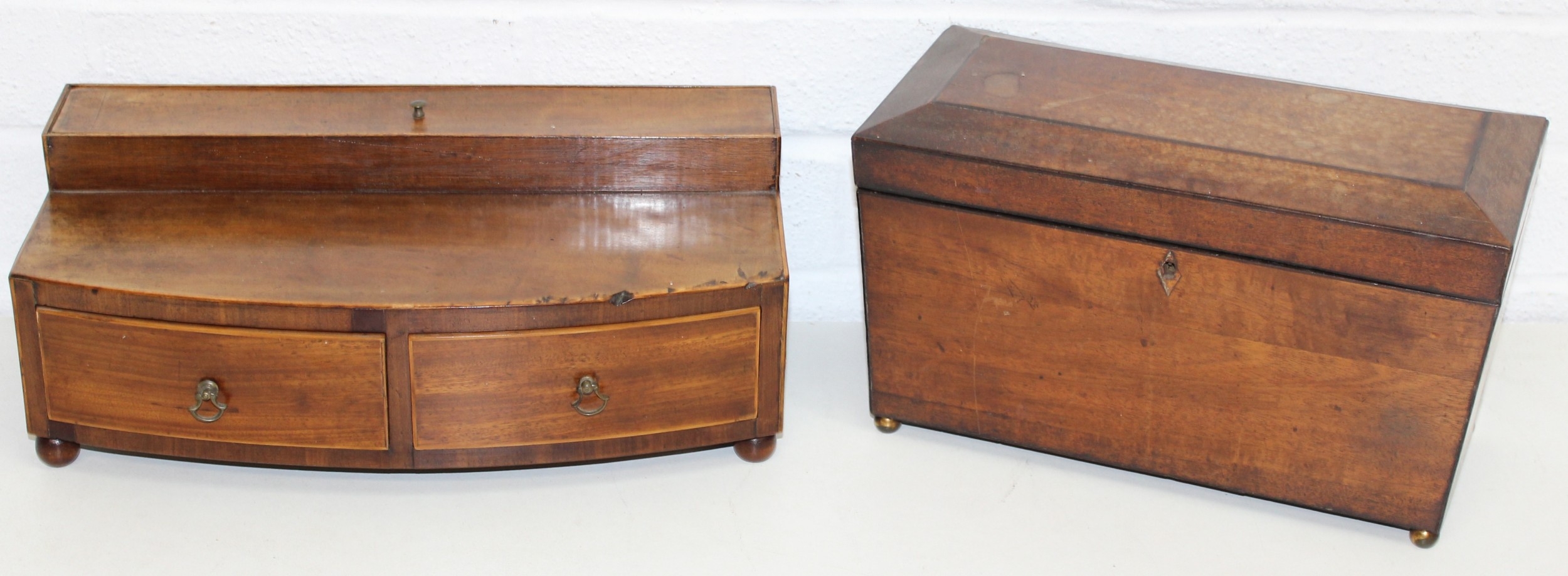A Victorian mahogany tea caddy with partial interior and a desktop stationary box with bow front, two drawers and lift up lid, 37cm wide [2]