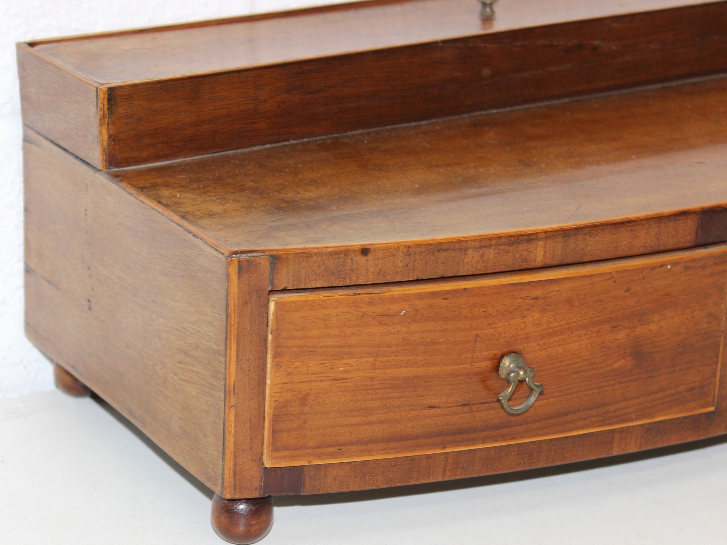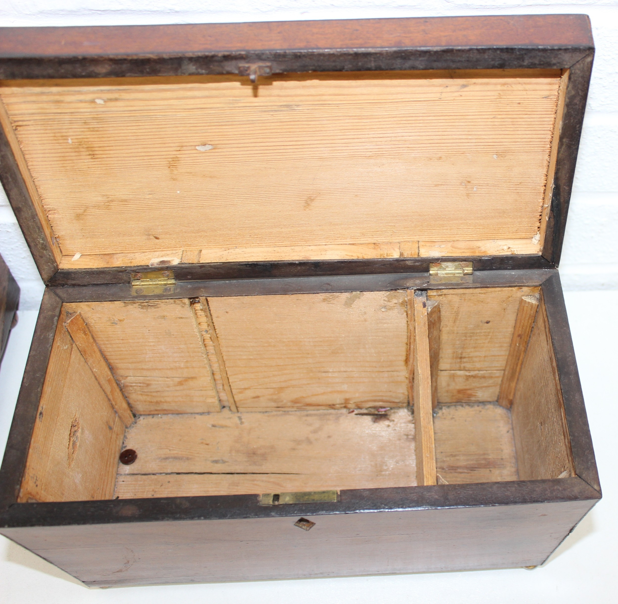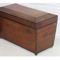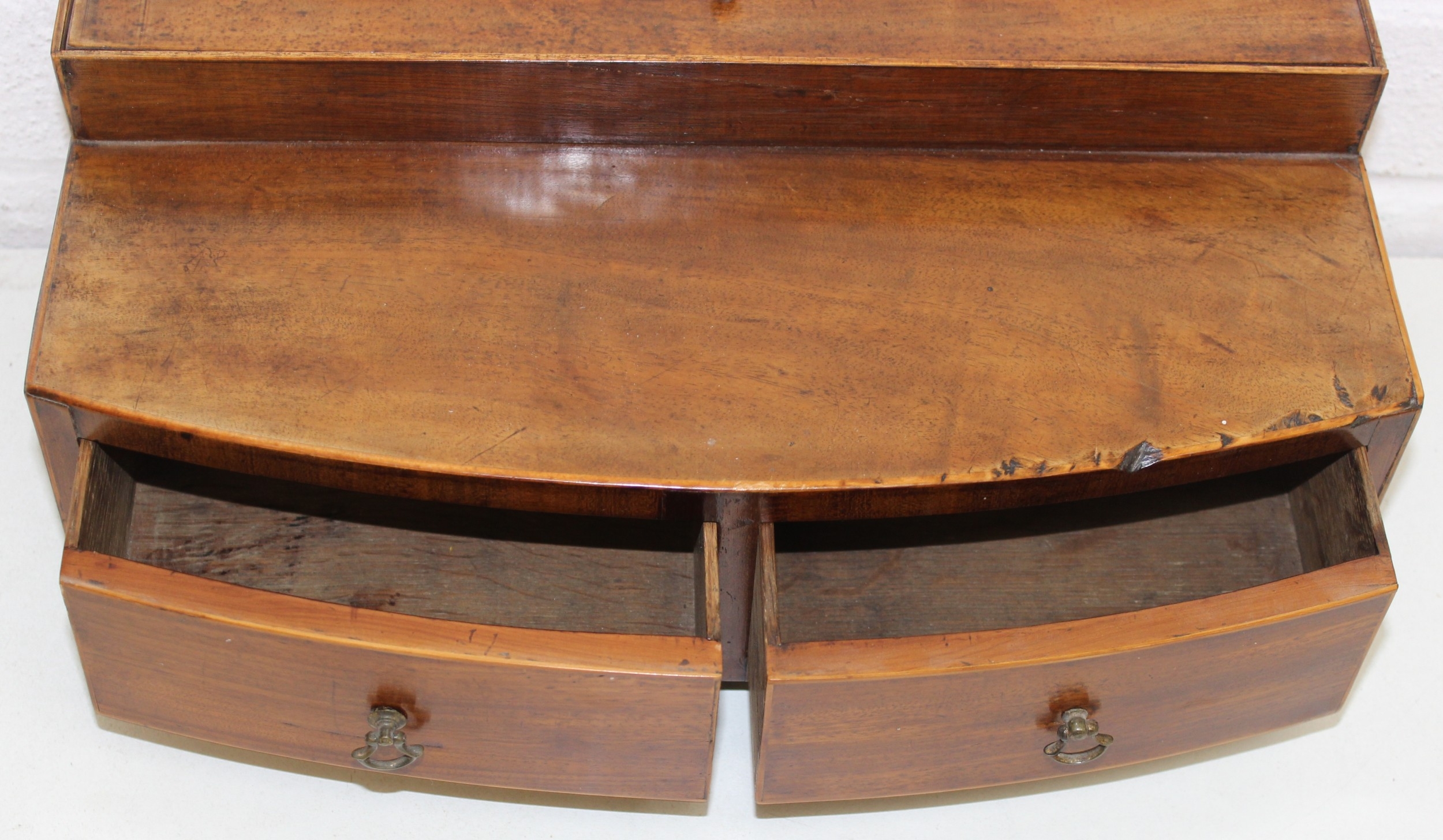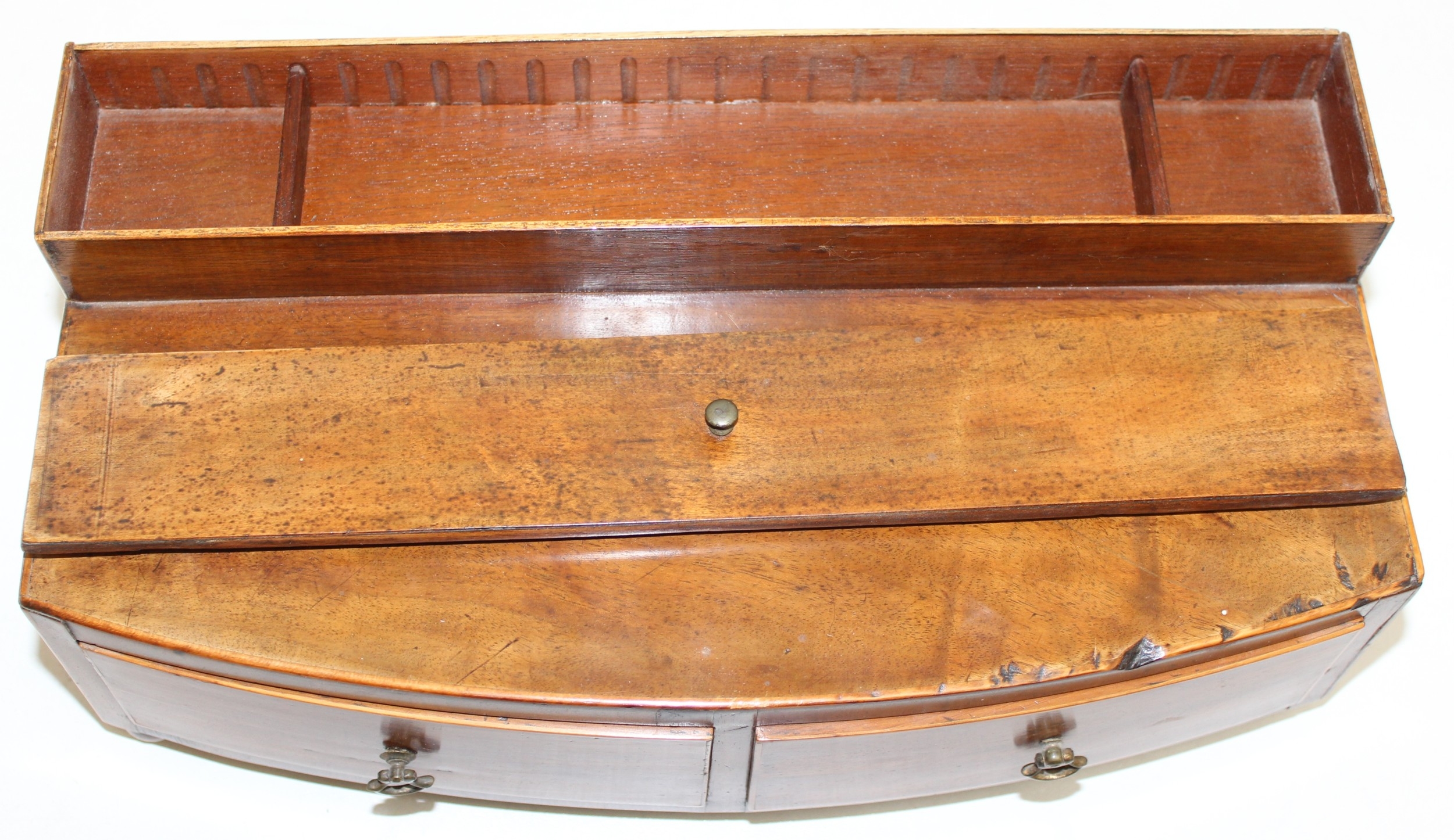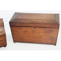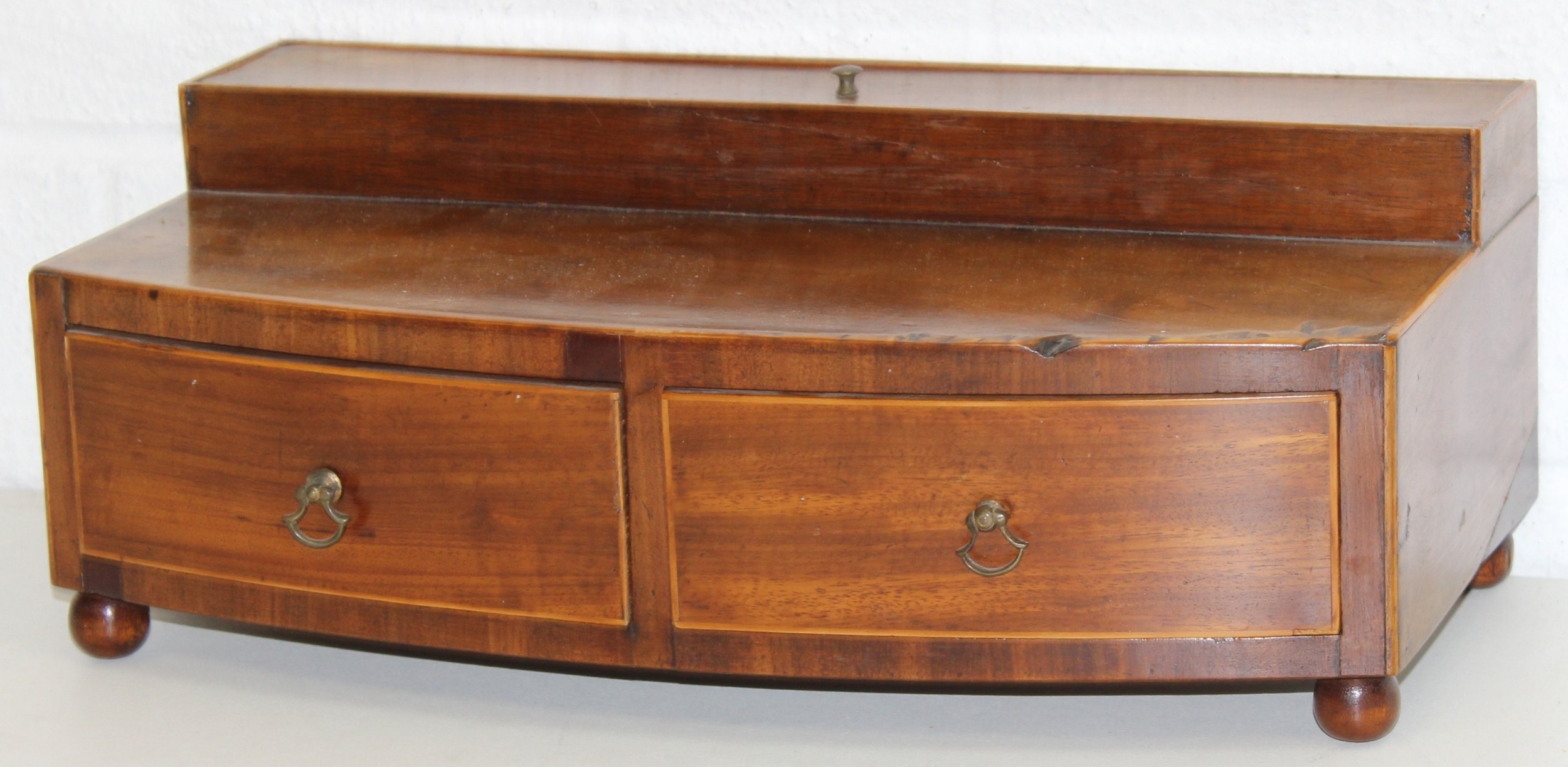 A Victorian mahogany tea caddy with partial interior and a desktop stationary box with bow front, two drawers and lift up lid, 37cm wide [2]