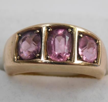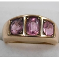 Heavy 14ct gold amethyst trilogy ring, size O 1/2