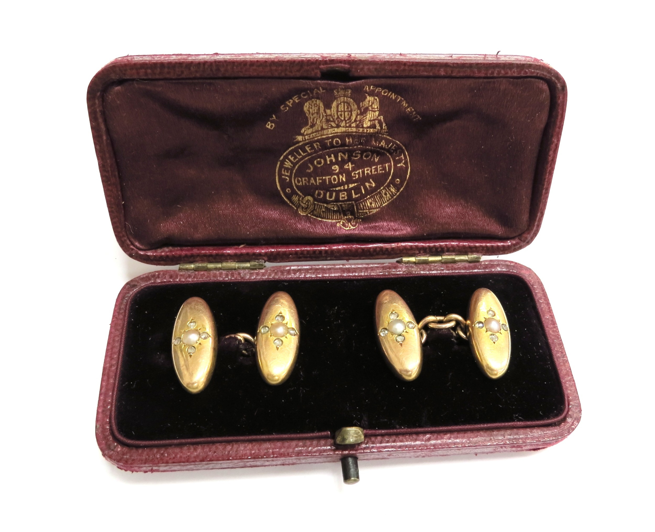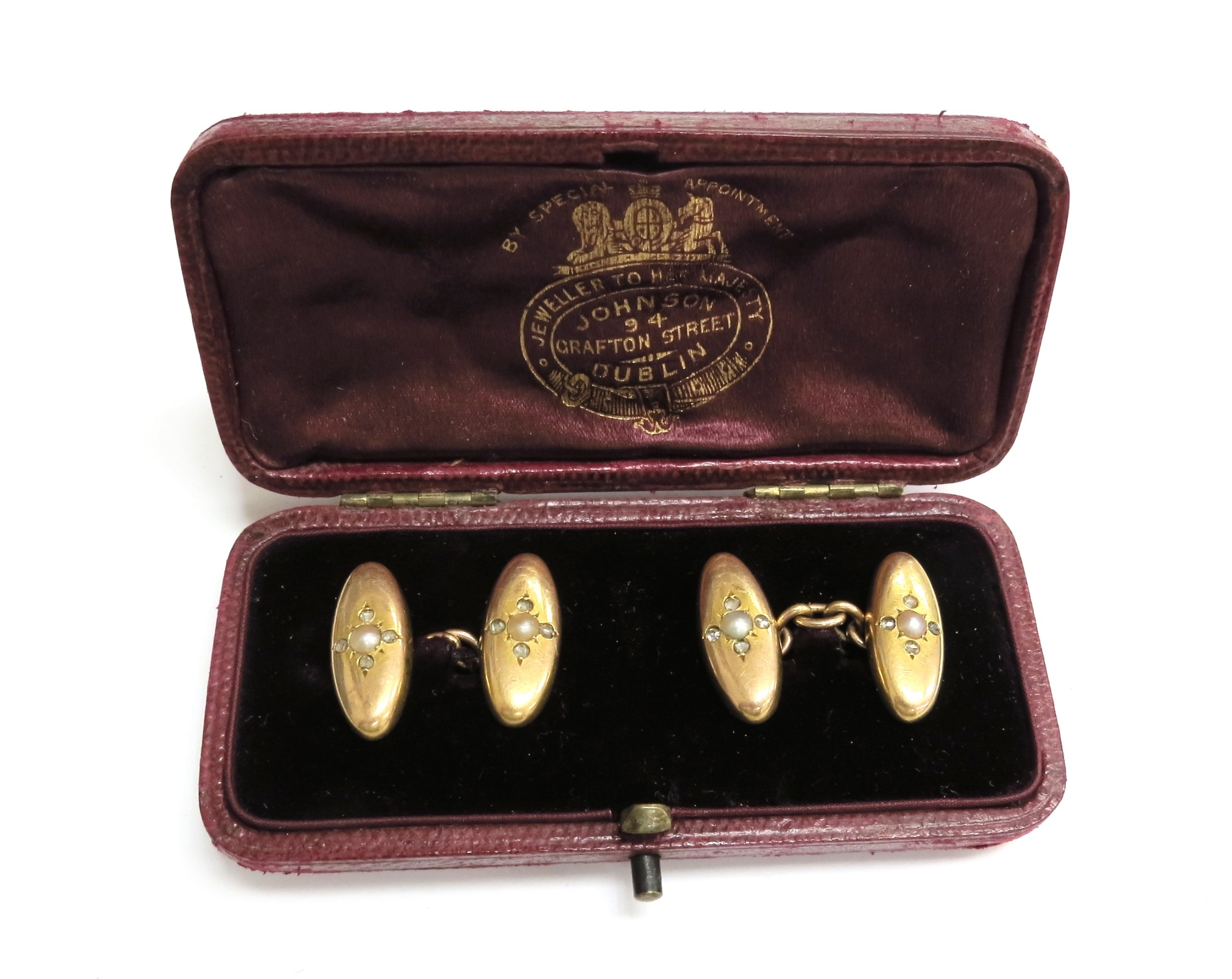 A pair of unmarked gold old cut diamond and pearl set cufflinks, in fitted case, 6.2g
