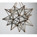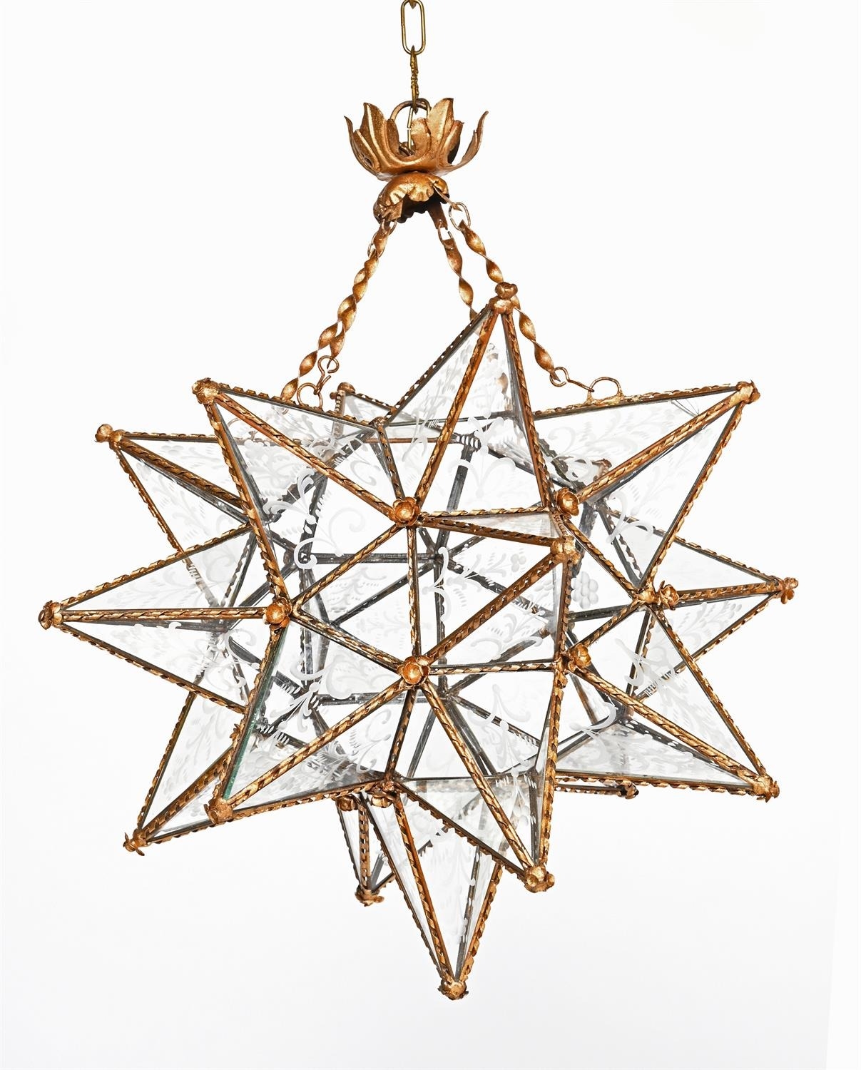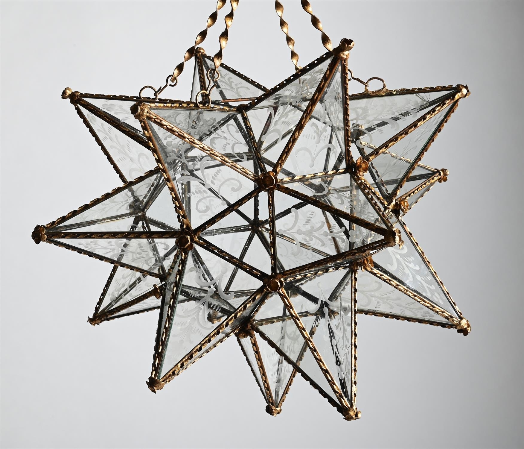 A STAR-SHAPED HANGING LANTERNLATE 20TH CENTURY With a brass frame and etched glass slips38cm high, 78cm high including the chains, 46cm wide, 48cm deep