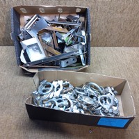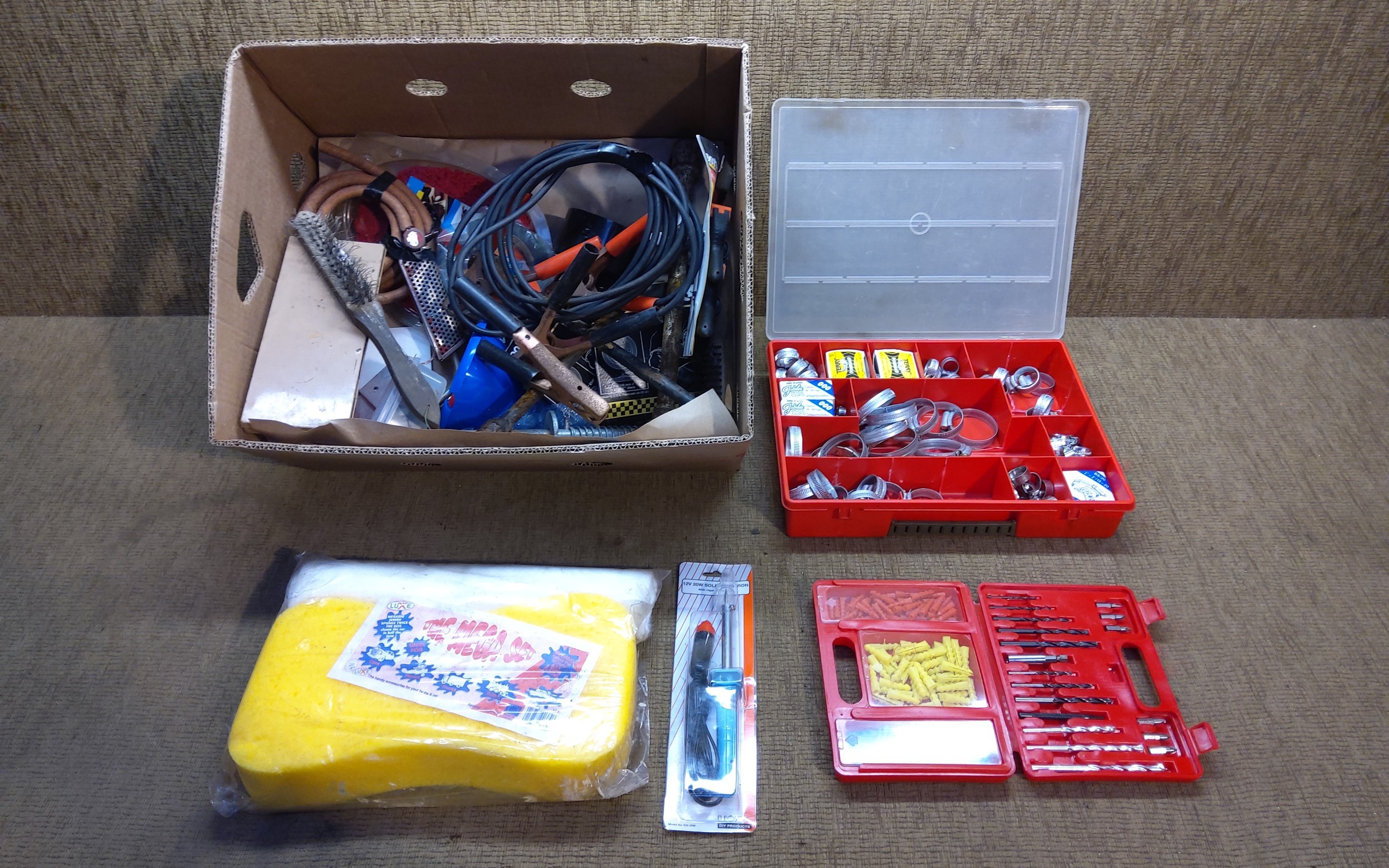 Garage tools and fixings including a set of Jubilee clips, a 12v soldering iron and power devil drill bit set.