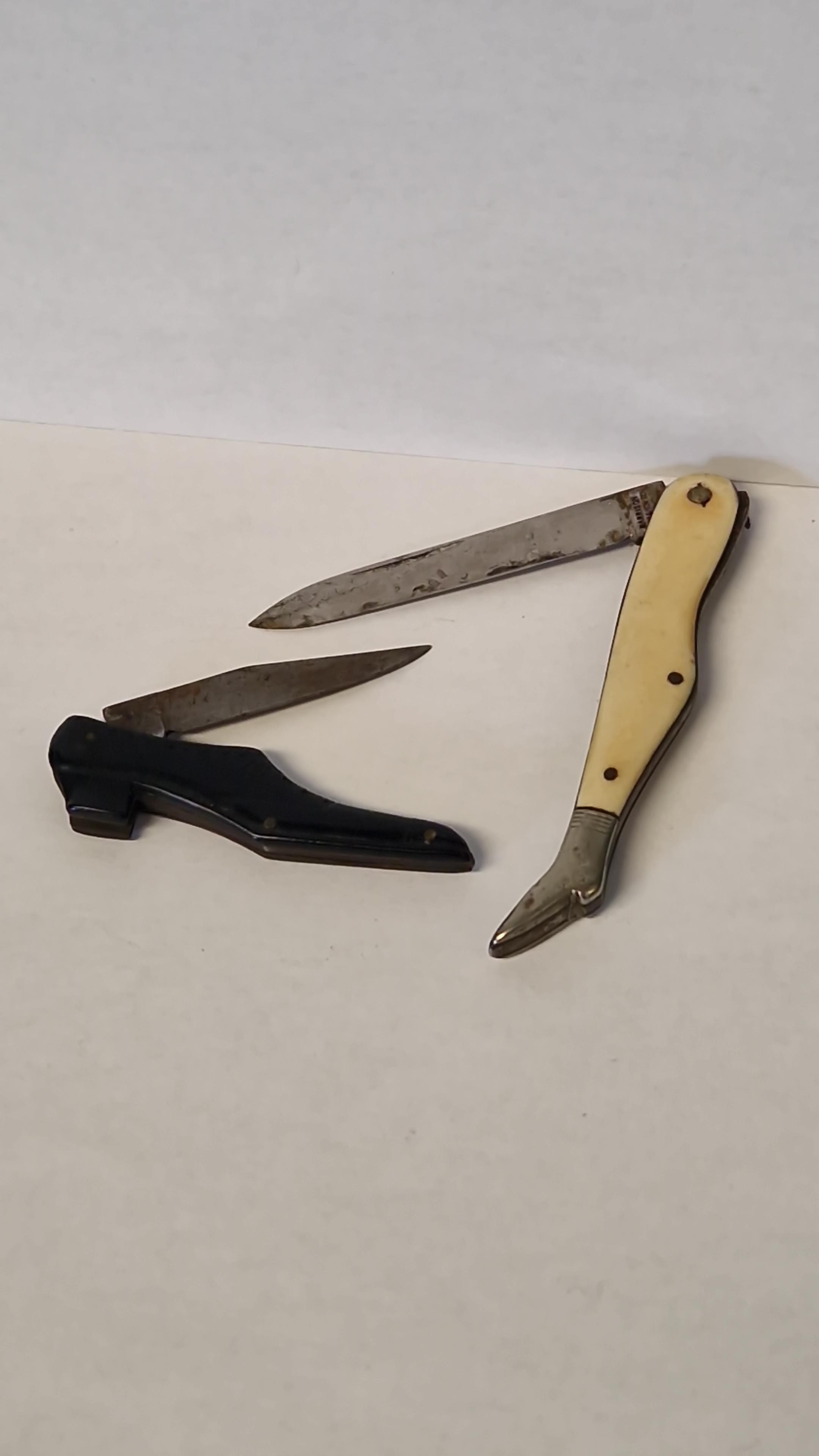 SMALL VICTORIAN FRUIT KNIFE IN THE FORM OF A SHOE & 1 SMALL EARLY POCKET KNIFE IN THE FORM OF A LEG WITH A SHOE ON THE END