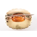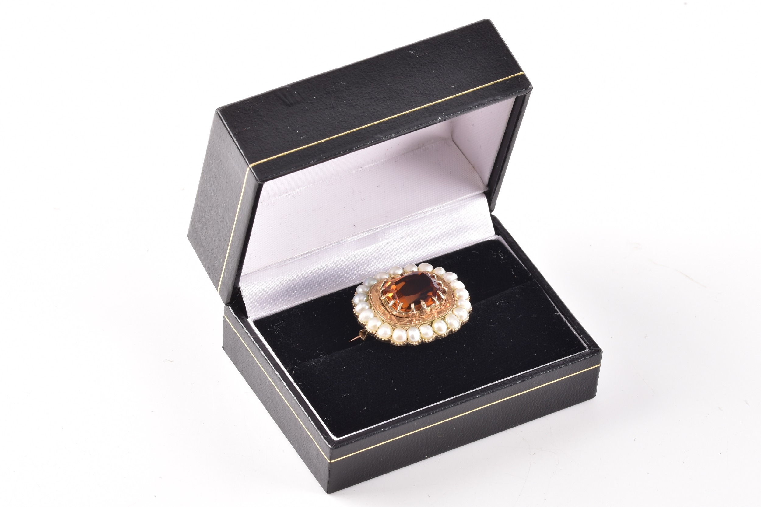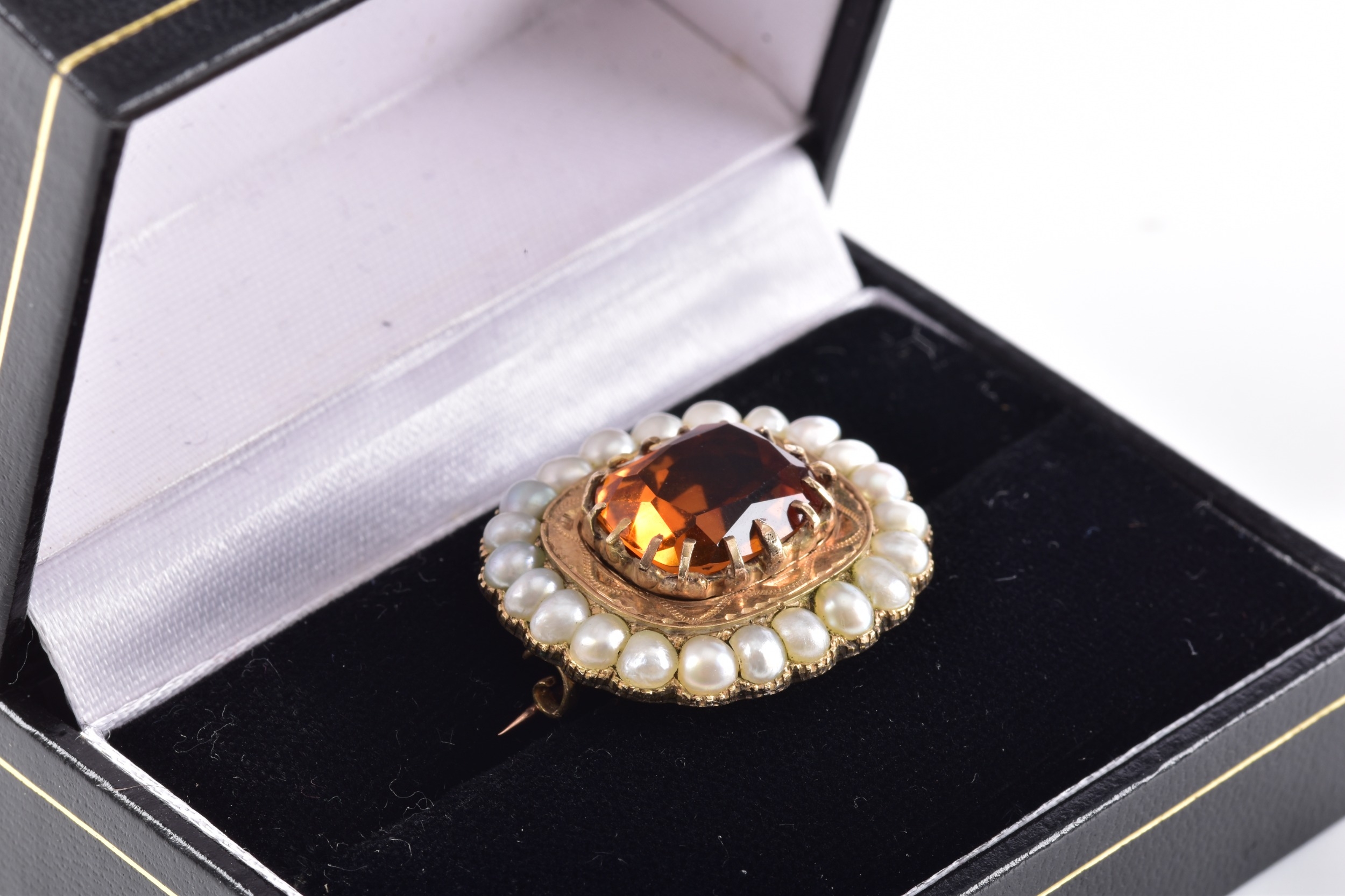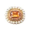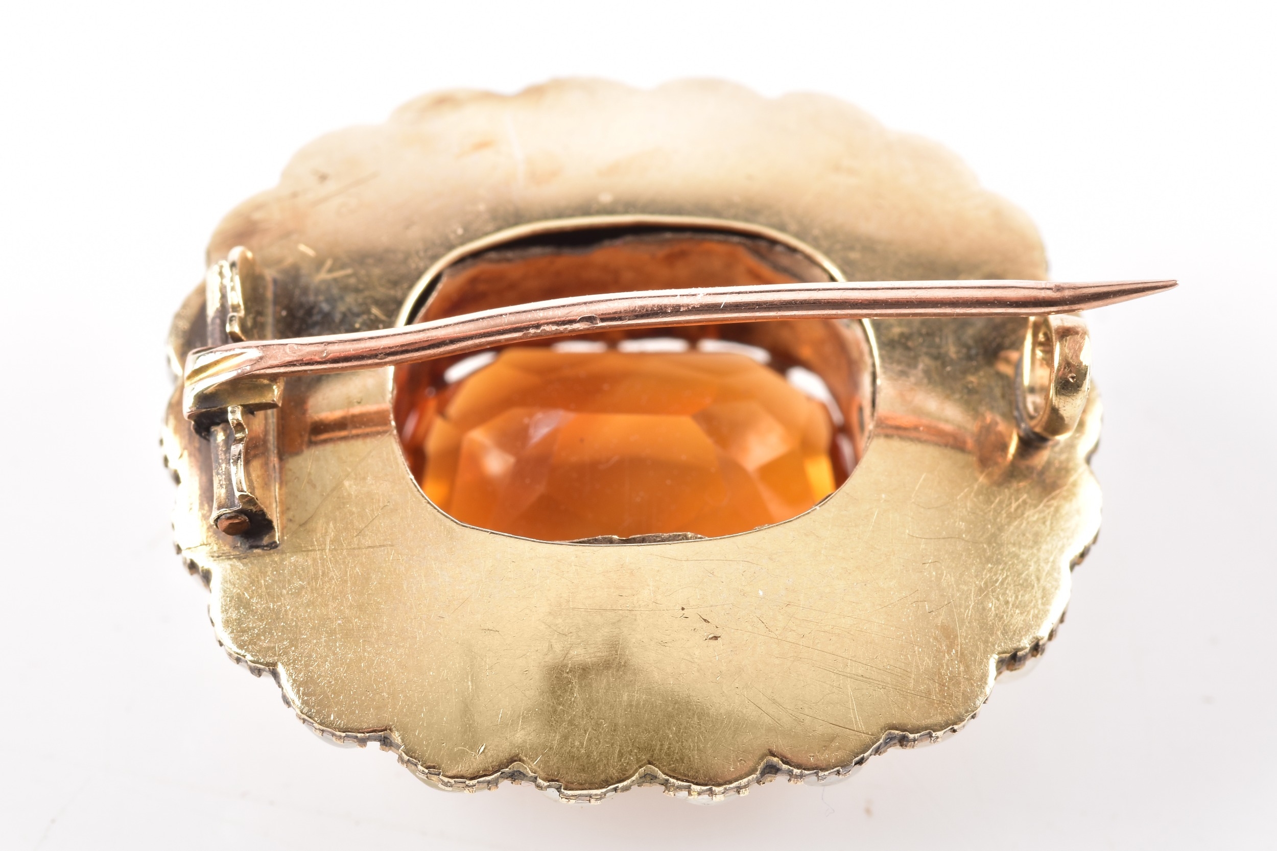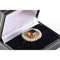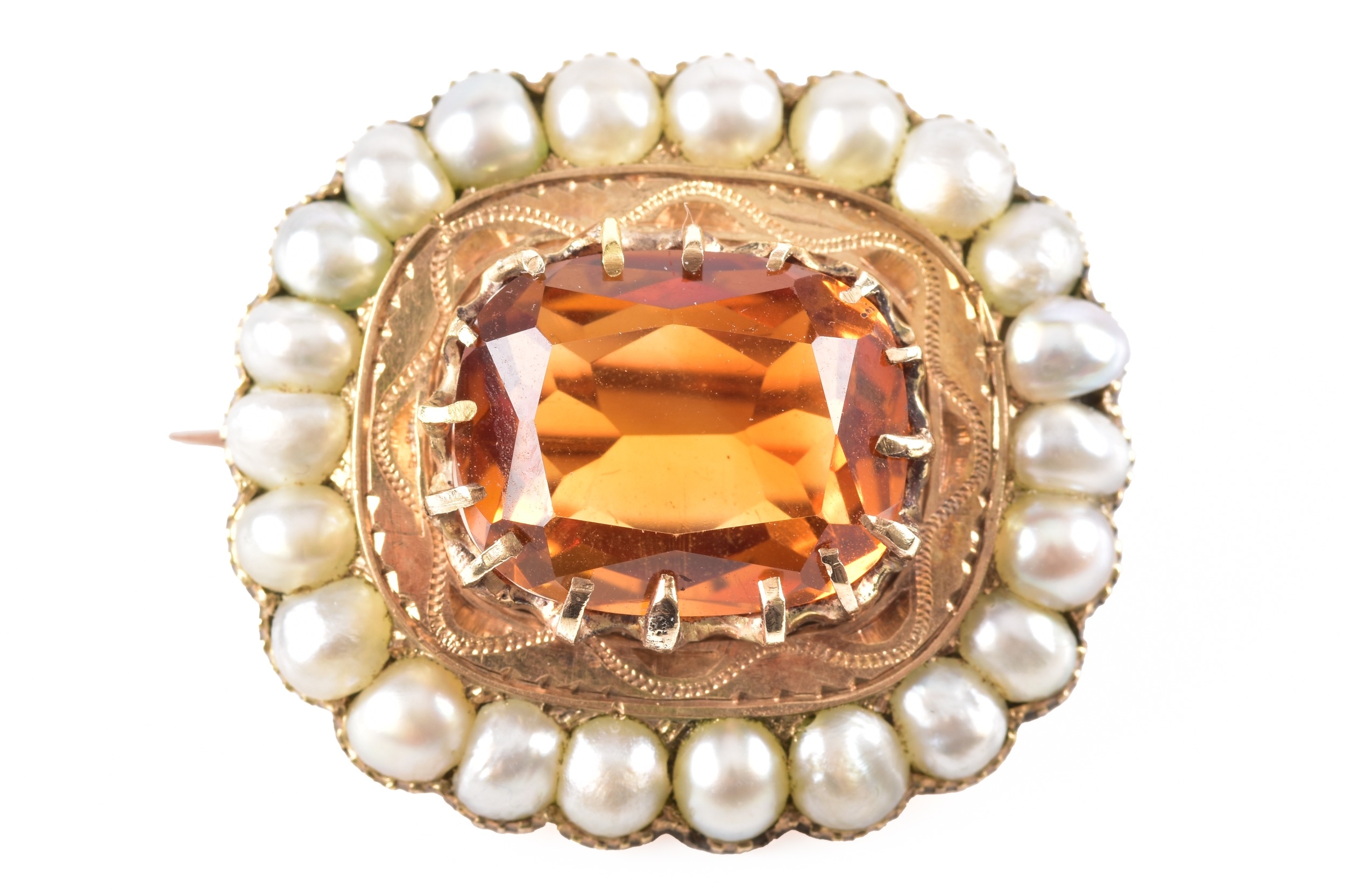 A yellow gold citrine and pearl brooch, centred with a large rectangular cushion cut citrine in a claw setting, citrine approximately 13 mm x 11 mm, within a scalloped yellow metal mount and bordered by a surround of graduated seed pearls, 2.7 cm width, with pin and safety clasp fitting to the reverse.