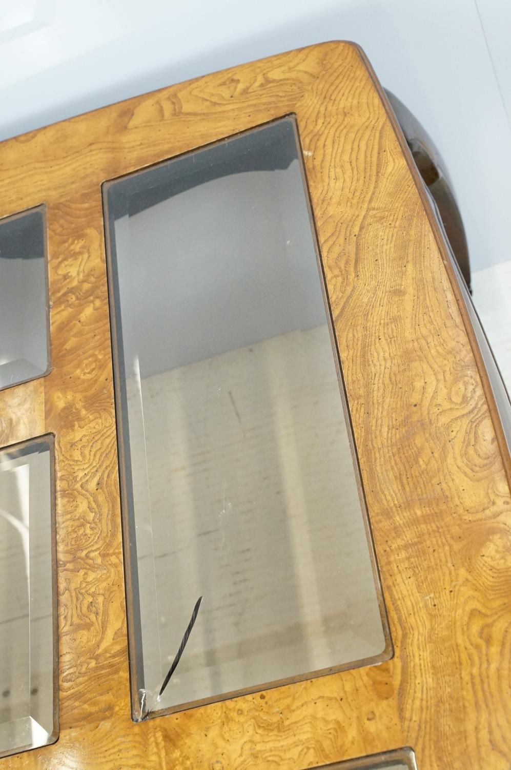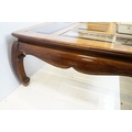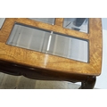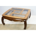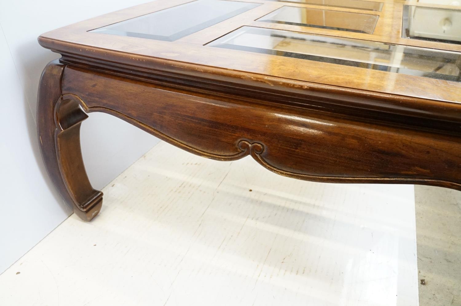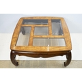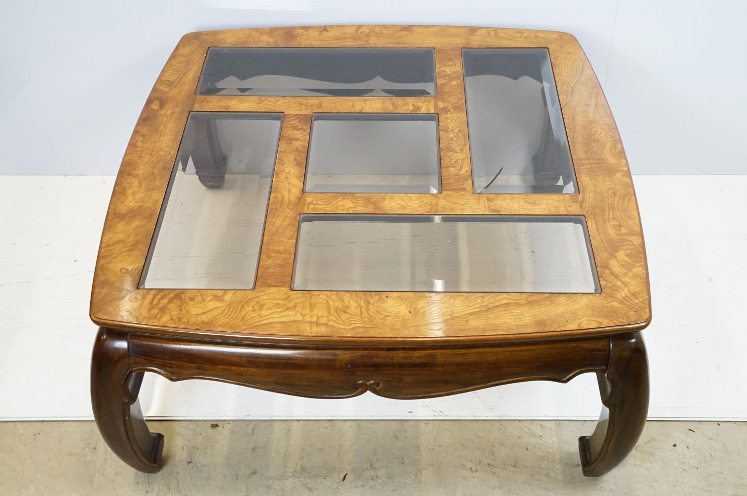 Walnut coffee table, in the Oriental style, with five bevelled glass panels, 44cm high x 96.5cm wide x 96cm deep