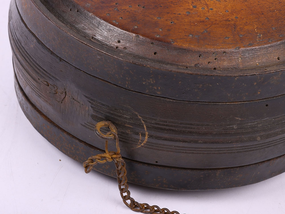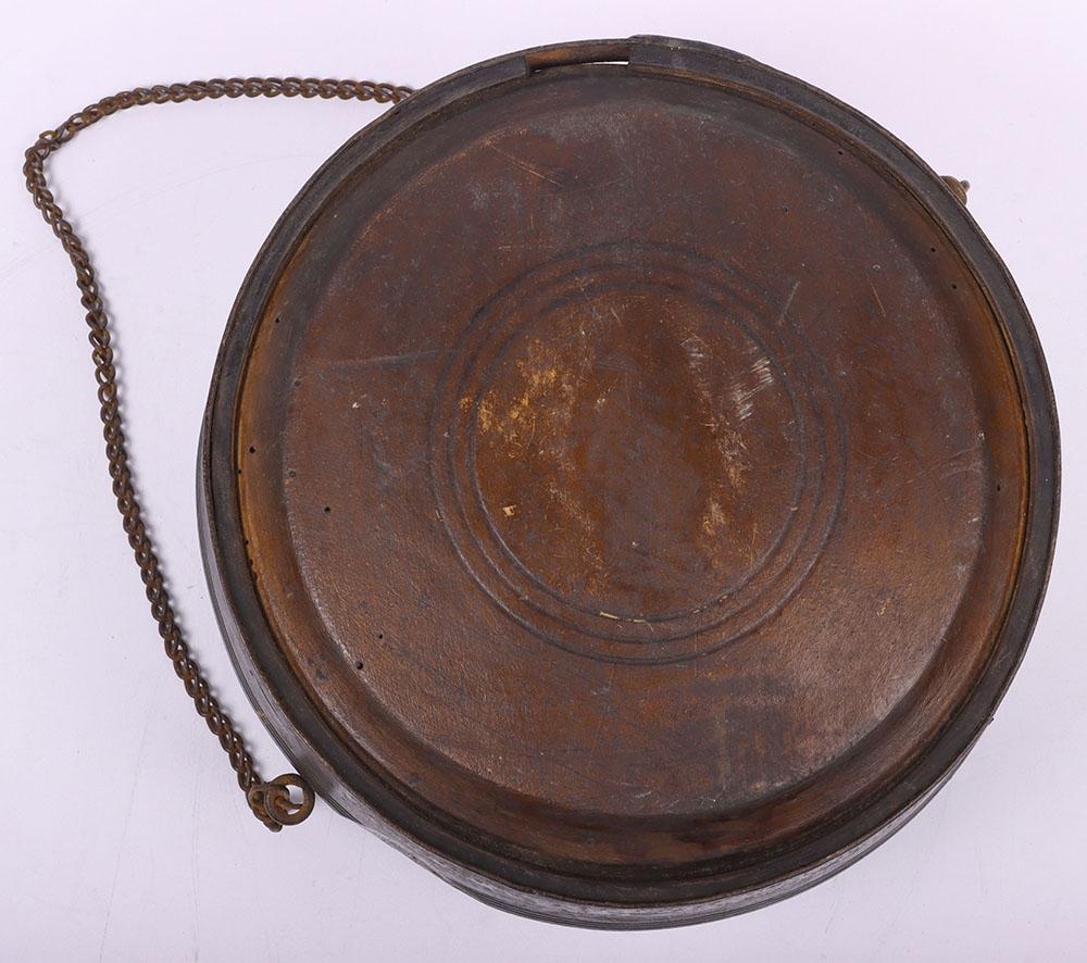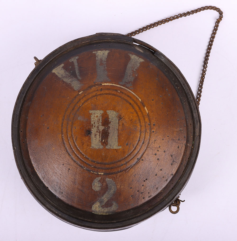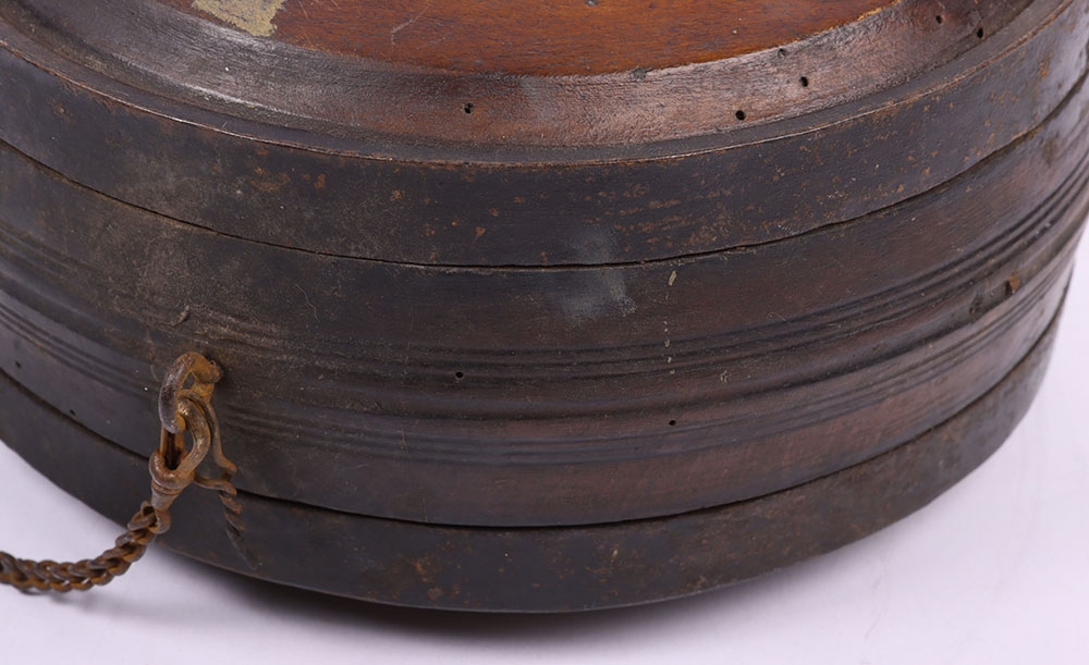 Scarce Georgian / Early Victorian Water Bottle Canteen, untouched example of the large wooden circular canteen with steel banding, being the type used by soldiers at Waterloo and up to the early campaigns of the Victorian era such as the Crimea. Painted in white to the front of the bottle ‘VII H 2’. Old damage to the top, missing the stopper. Some old worm holes. Hard item of early British military equipment to find.