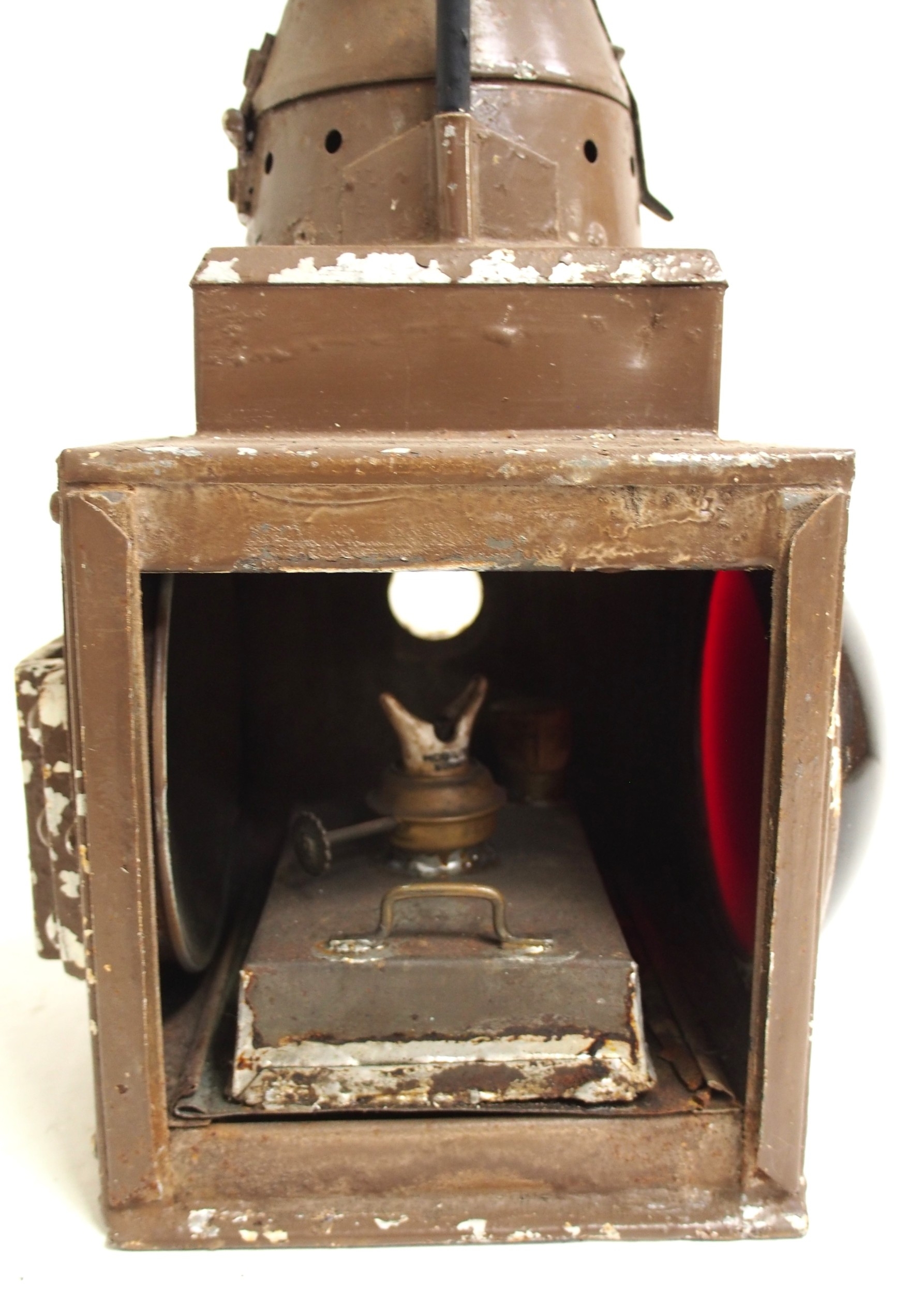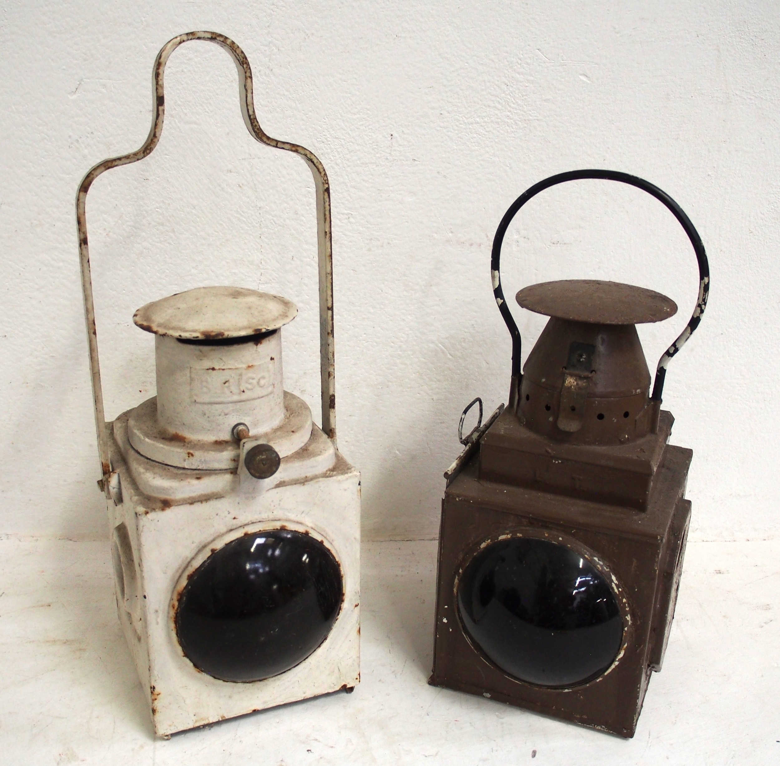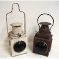 BR(Sc) train tail lamp, the chunky pattern with top access, LT train tail lamp, both complete with reservoirs albeit LT reservoir has had attention, both lamps good solid condition. (2) (A1) (Dispatch by Mailboxes/Collect from Banbury Depot)