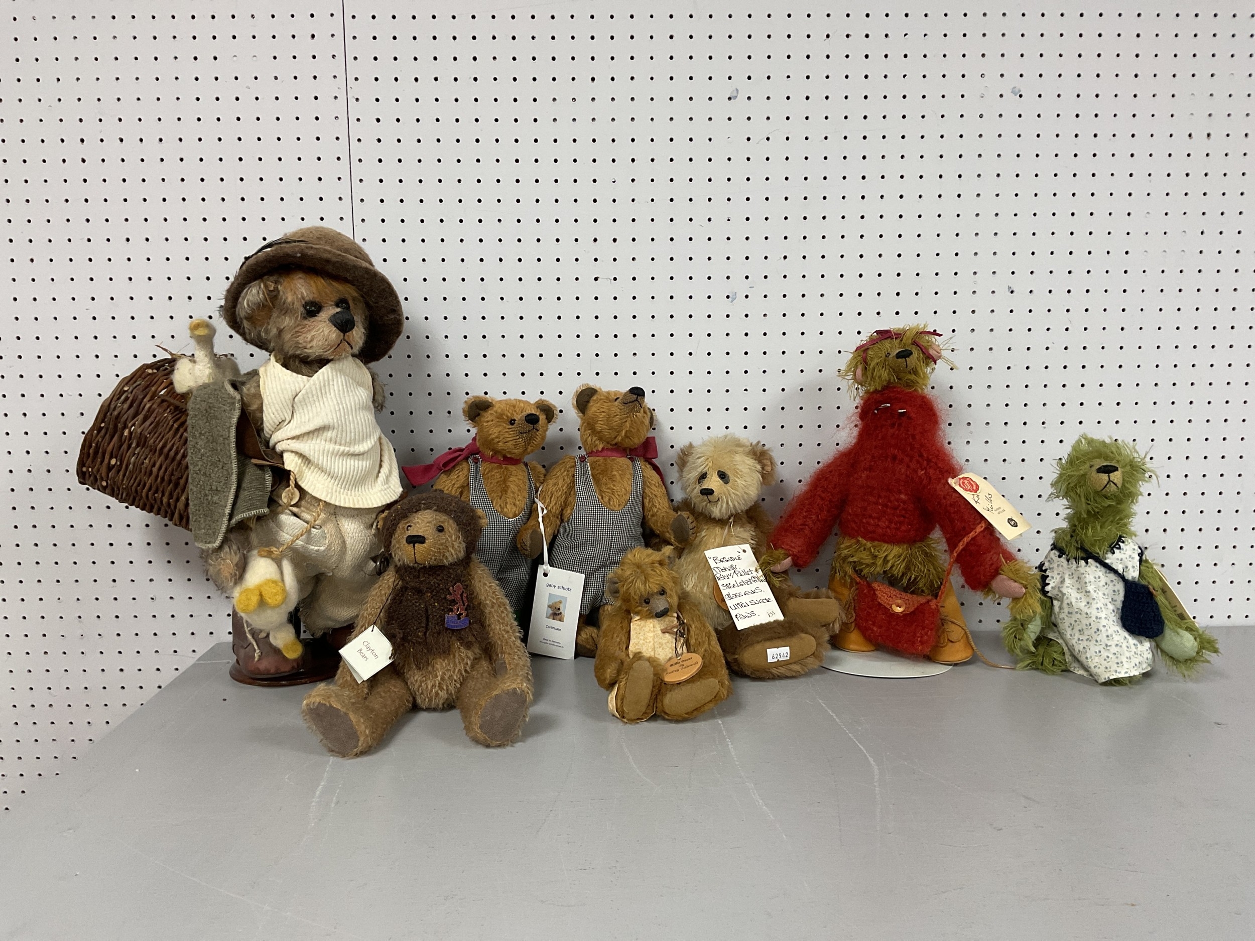 Eight Soft Bears / Teddy Bears. Various Makers, To Include Gaby Scholtz Bear Labelled "Daniel", Two Bilbo Bears by Audrey Edwards, Two Hermann Teddy Original Bears Labelled "Paula" and "Antonia" (One With Stand), a Clayton Bear labelled "Harris", A bear with stand carrying Swans / Ducks in a basket, etc. Tallest Bear Measures Approximately 16" Tall.