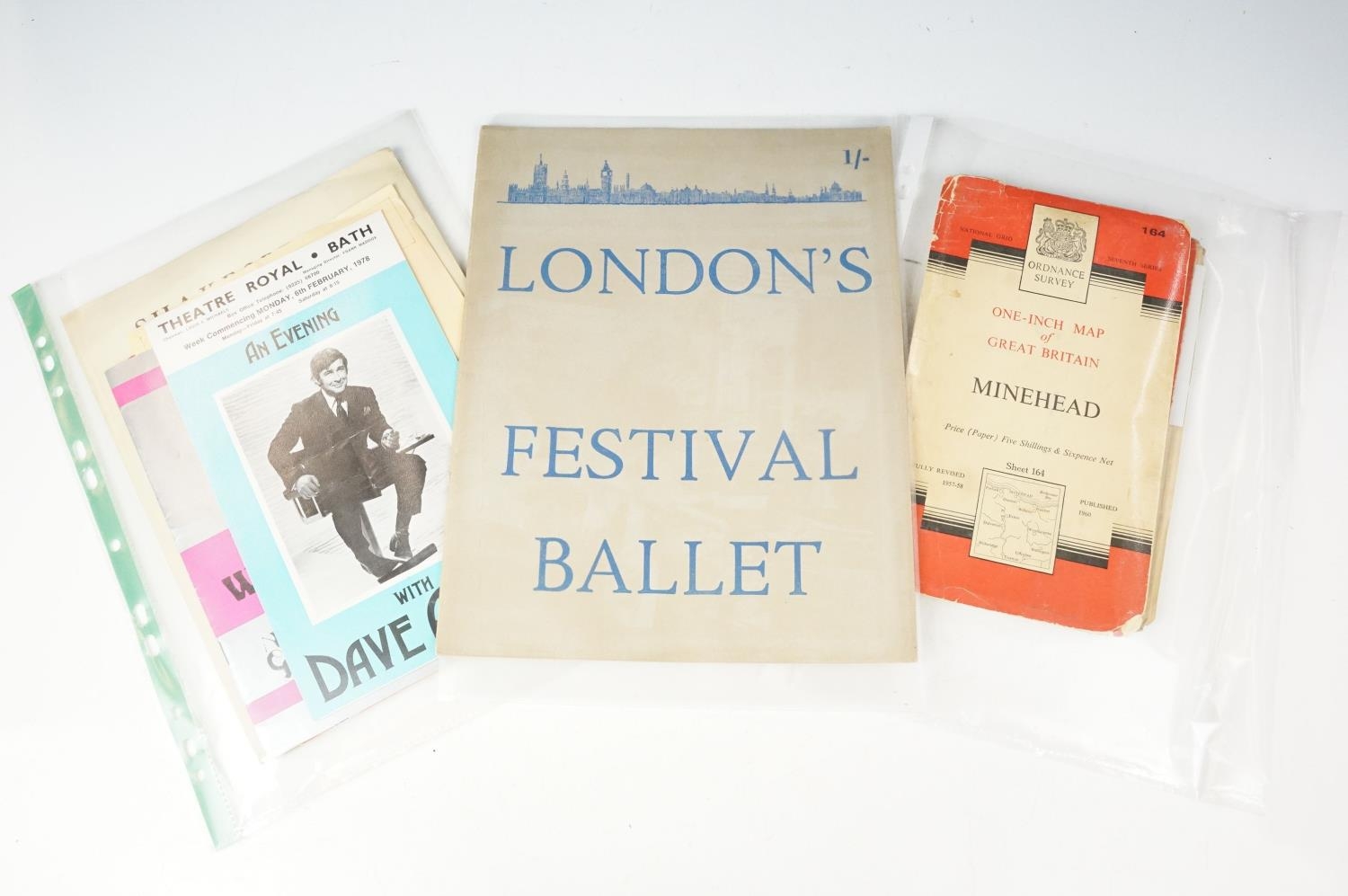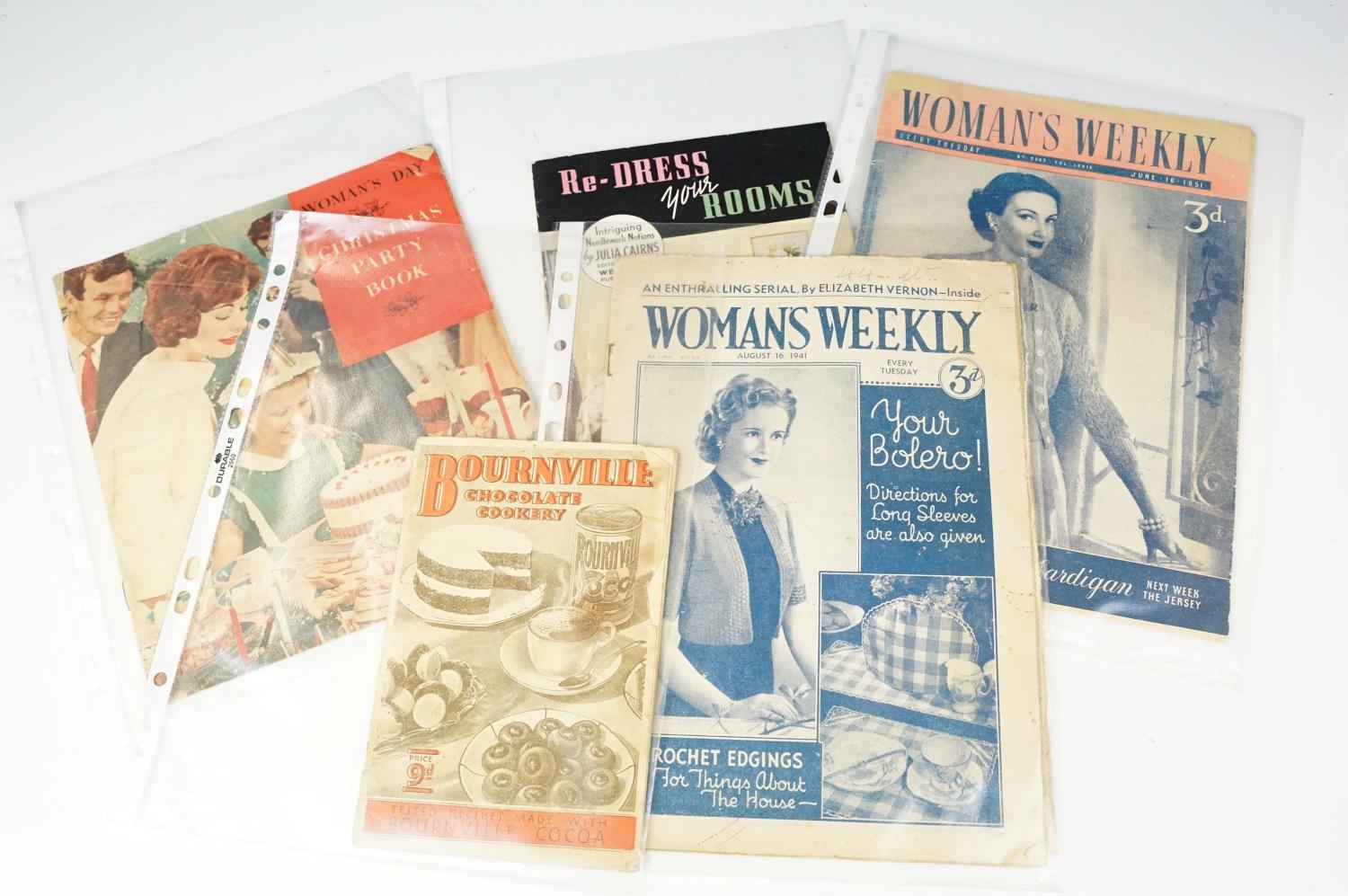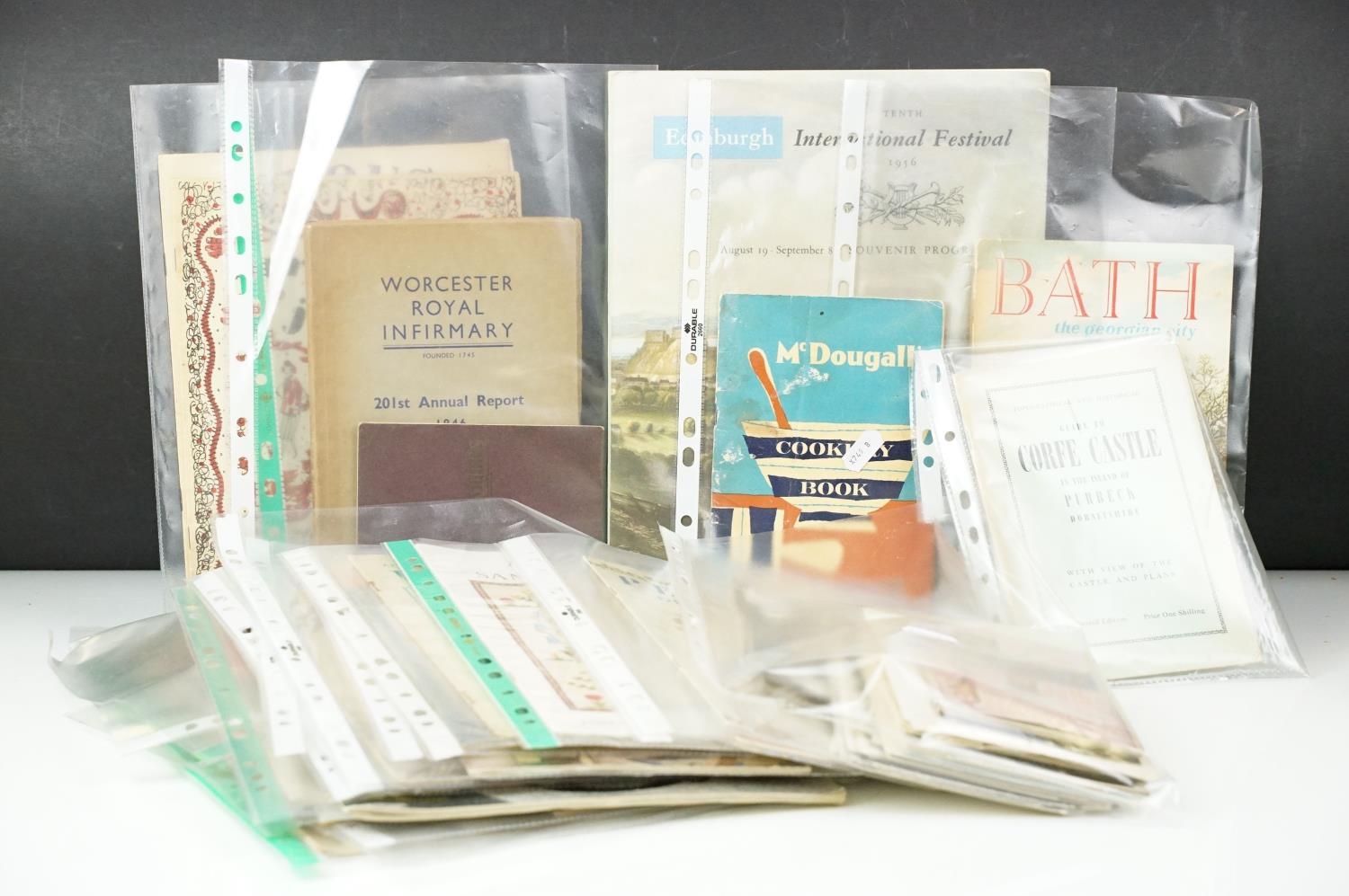Collection of vintage mostly mid 20th Century ephemera to include theatre programmes, women's magazines, group of black and white postcards, recipe periodicals and similar. 1 box.