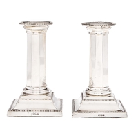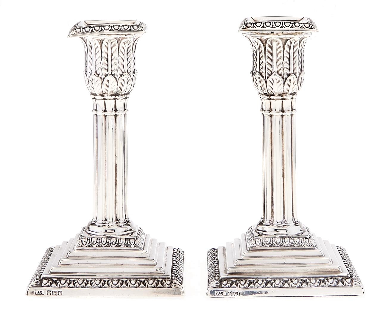 A pair of Edward VII silver dwarf cluster columnar candlesticks, on stepped square foot, nozzles, 14cm h, by Thomas A Scott, Sheffield 1902, loaded