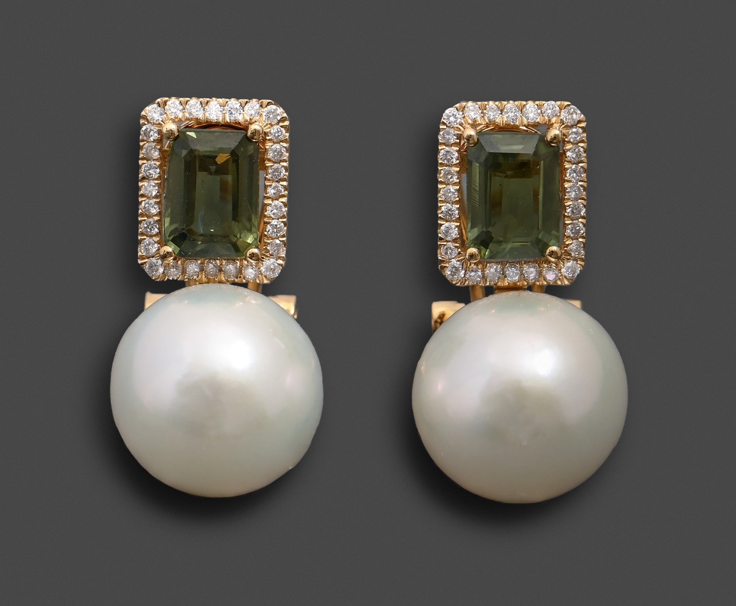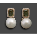 A pair of tourmaline, diamond and cultured pearl earrings, in gold, 22mm h, marked 18K, 8.9g