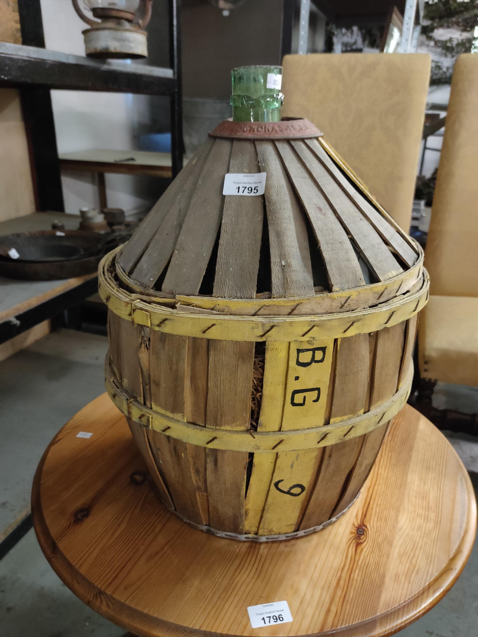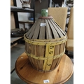 A very large French wine bottle in a slatted wooden housing with a metal collar. Fabulous potential to upcycle into a really splendid lamp