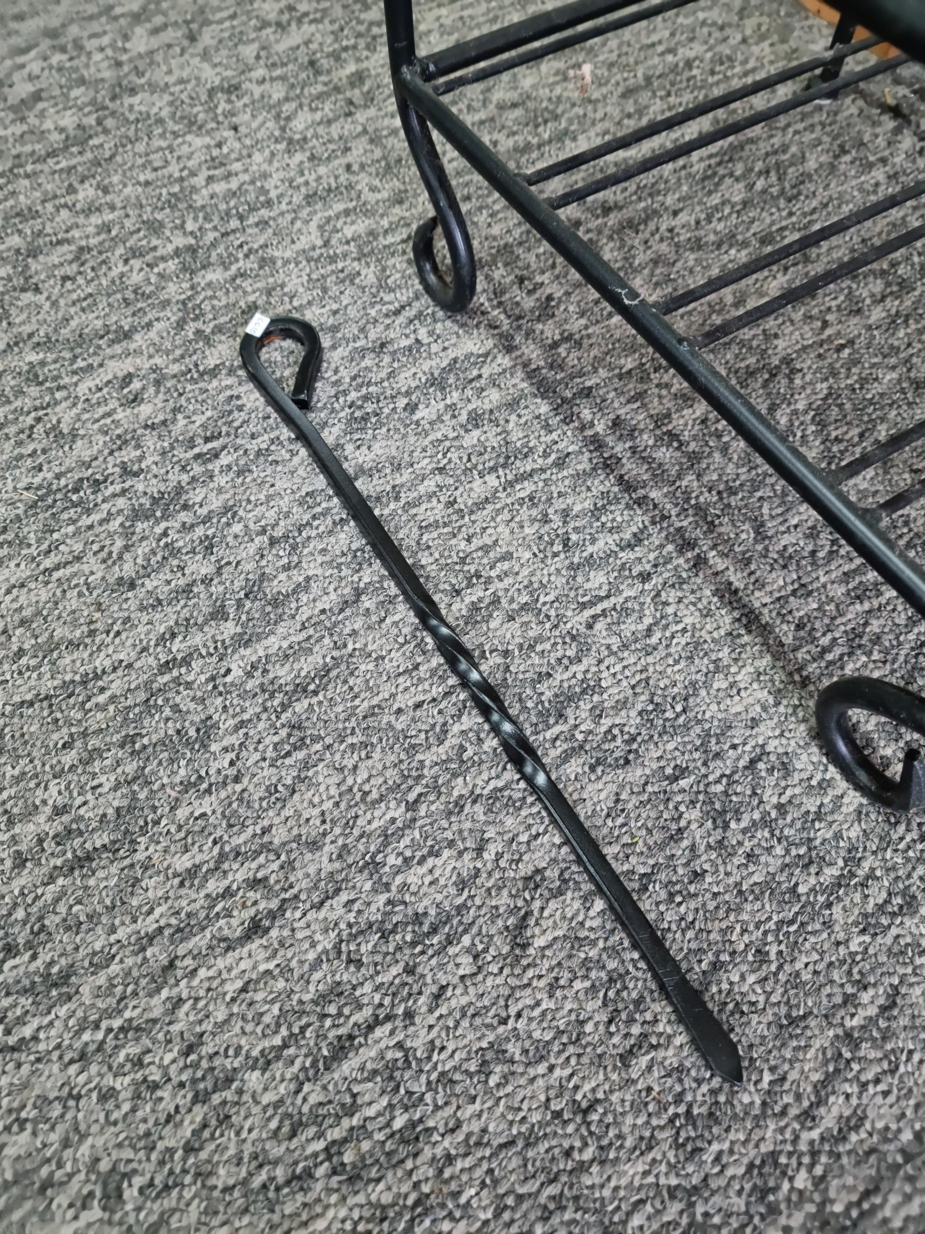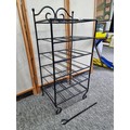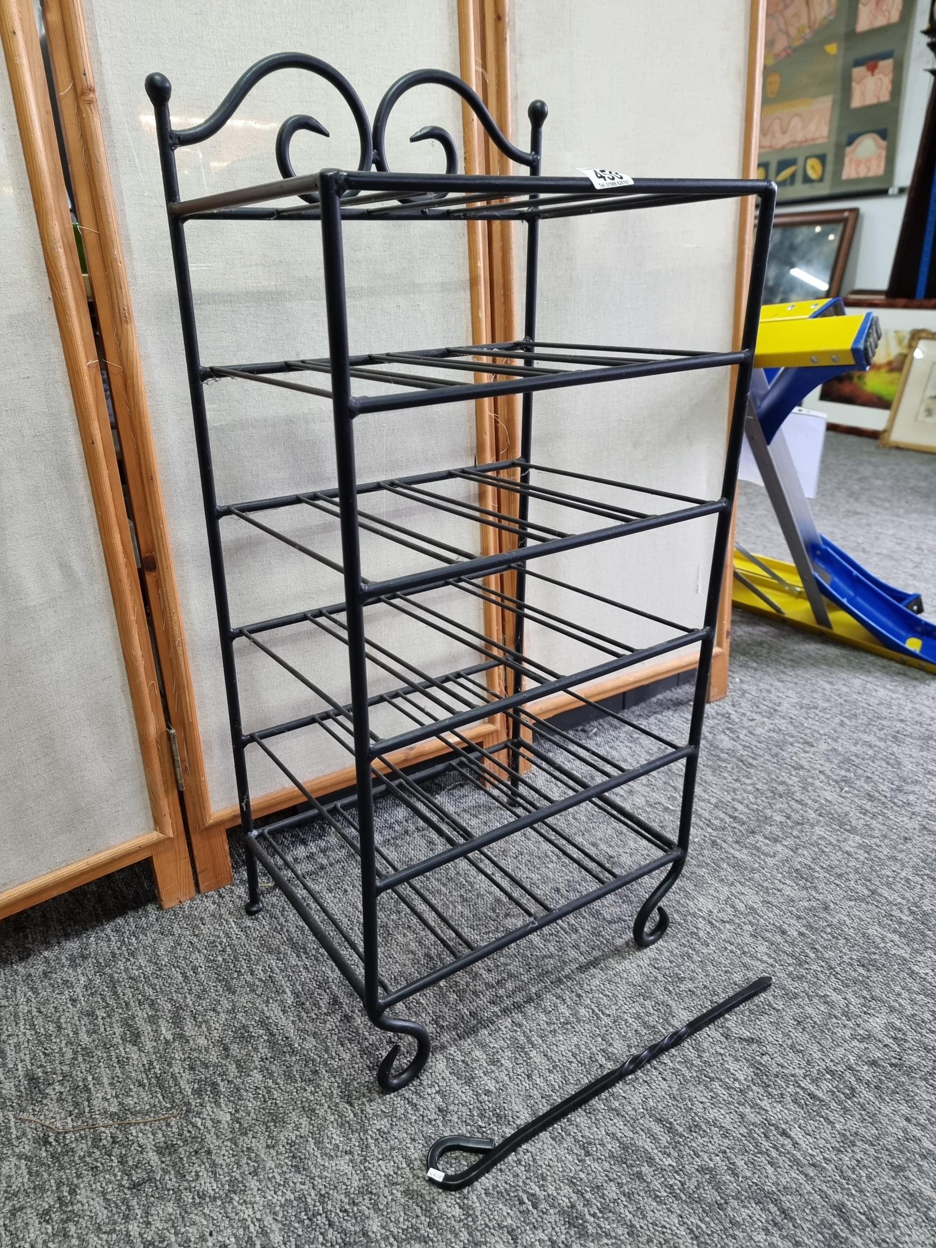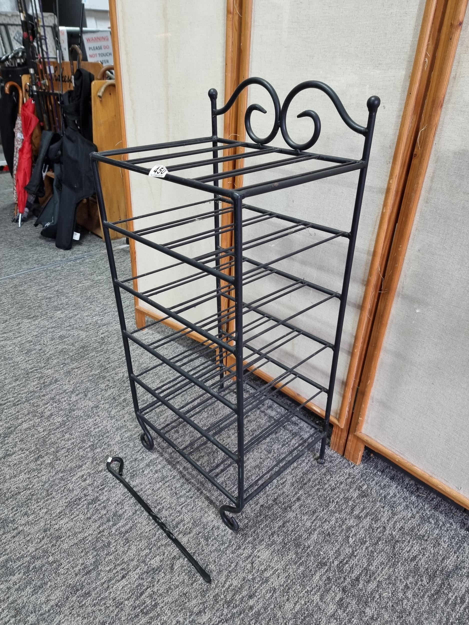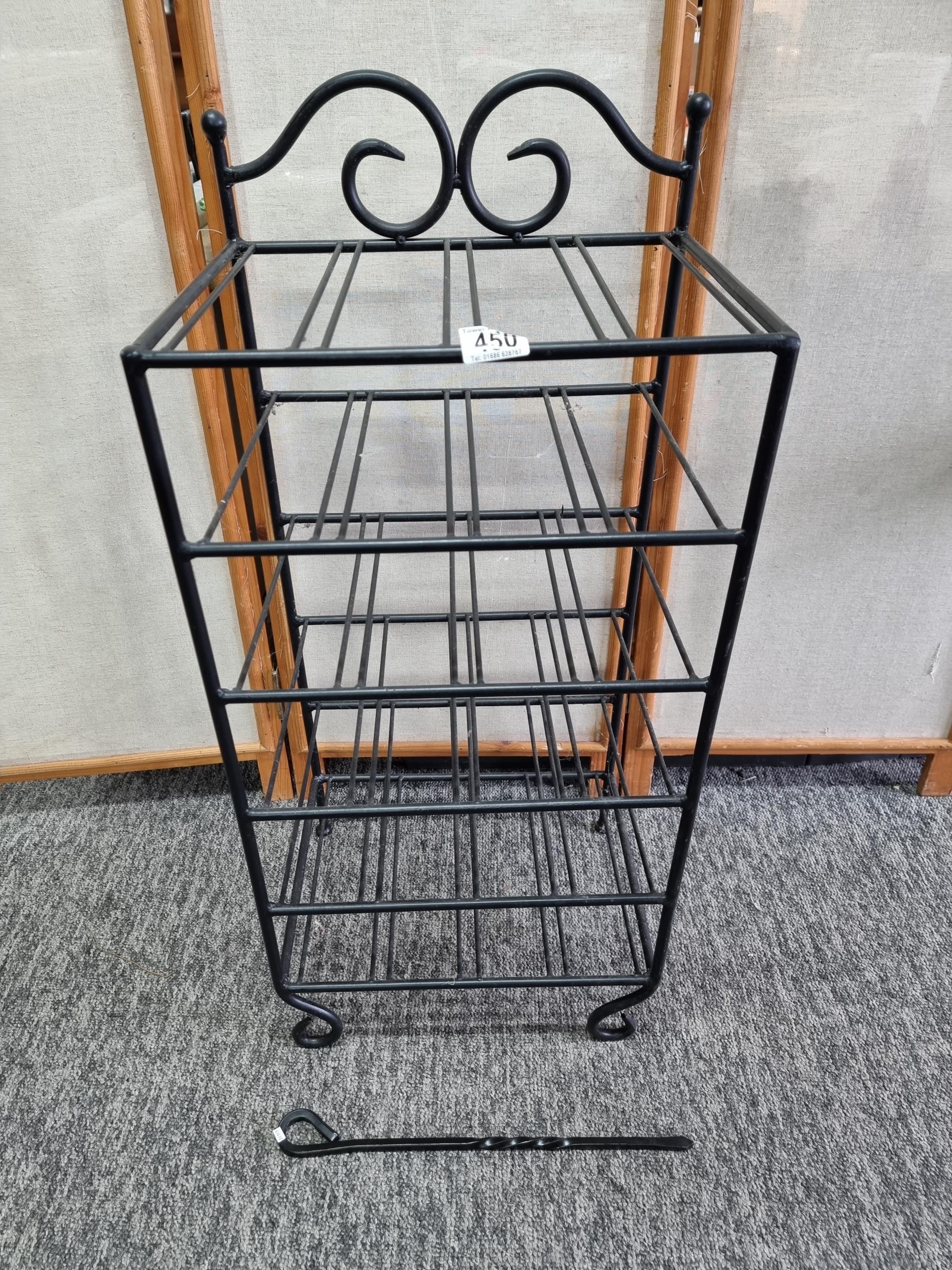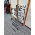A wrought iron floor standing wine rack unit, 4 shelves. In good overall condition, Standing 88cm high, 40cm wide with a depth of 31 cm.