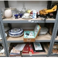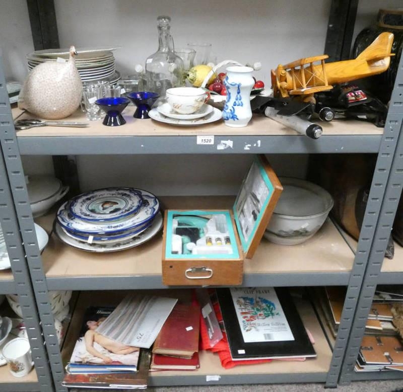 SELECTION OF VARIOUS ITEMS INCLUDING DECORATIVE PLATES, BOOKS, MICROSCOPE AND OTHERS OVER THREE SHELVES