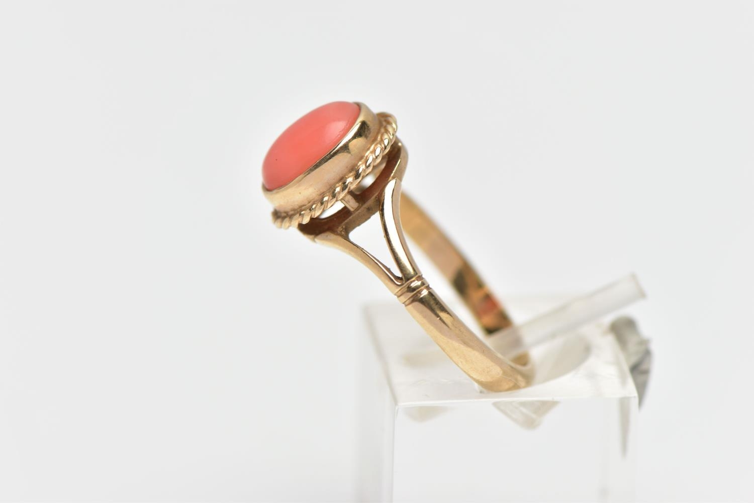 A 9CT GOLD CORAL DRESS RING, the oval coral cabochon, within a rope twist collet surround, measuring approximately 9mm x 6mm, hallmarked Birmingham 1996, ring size N, approximate gross weight 3.4 grams (condition report: overall good condition coral is medium orange hue with typical structure)