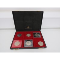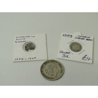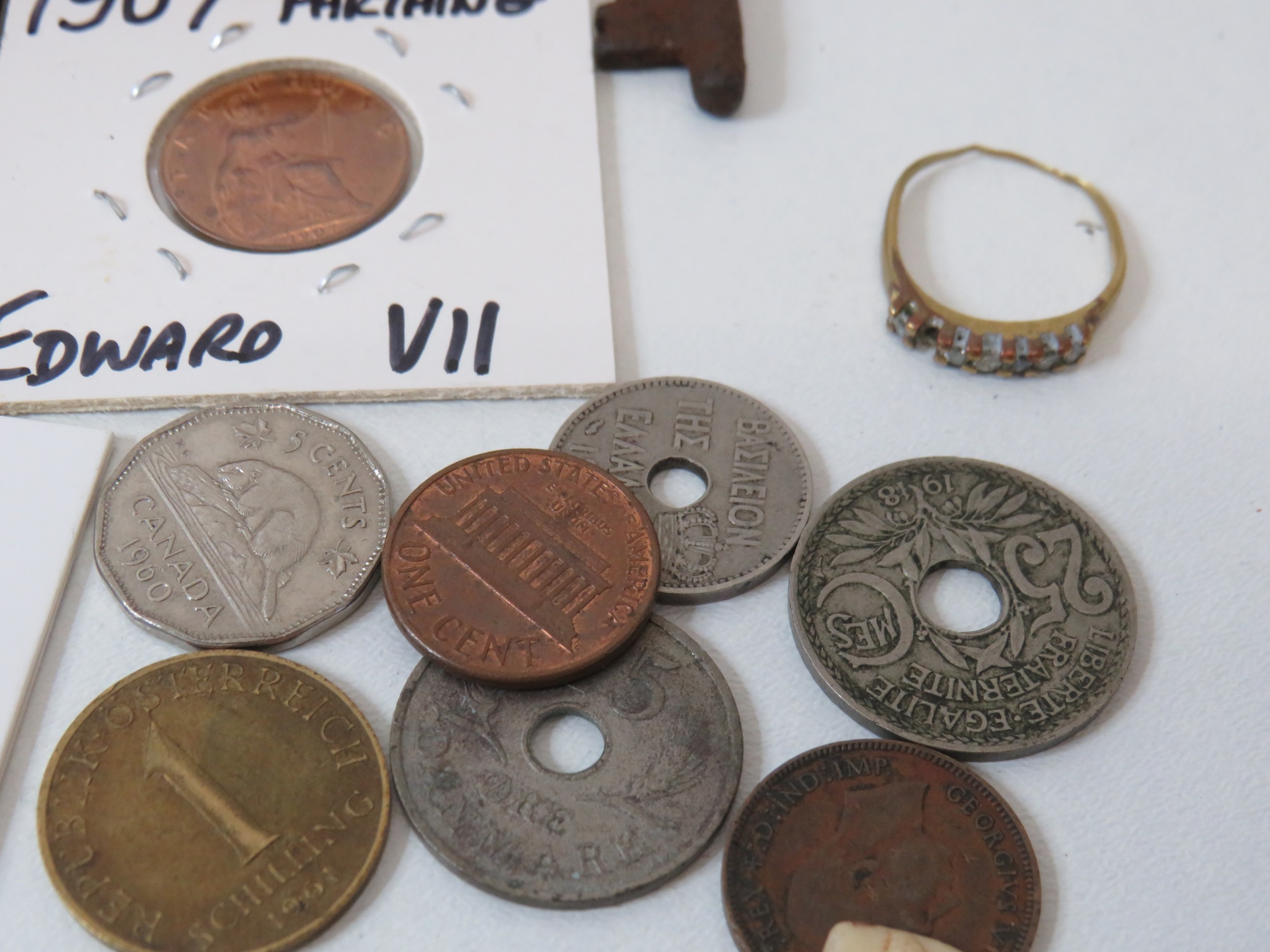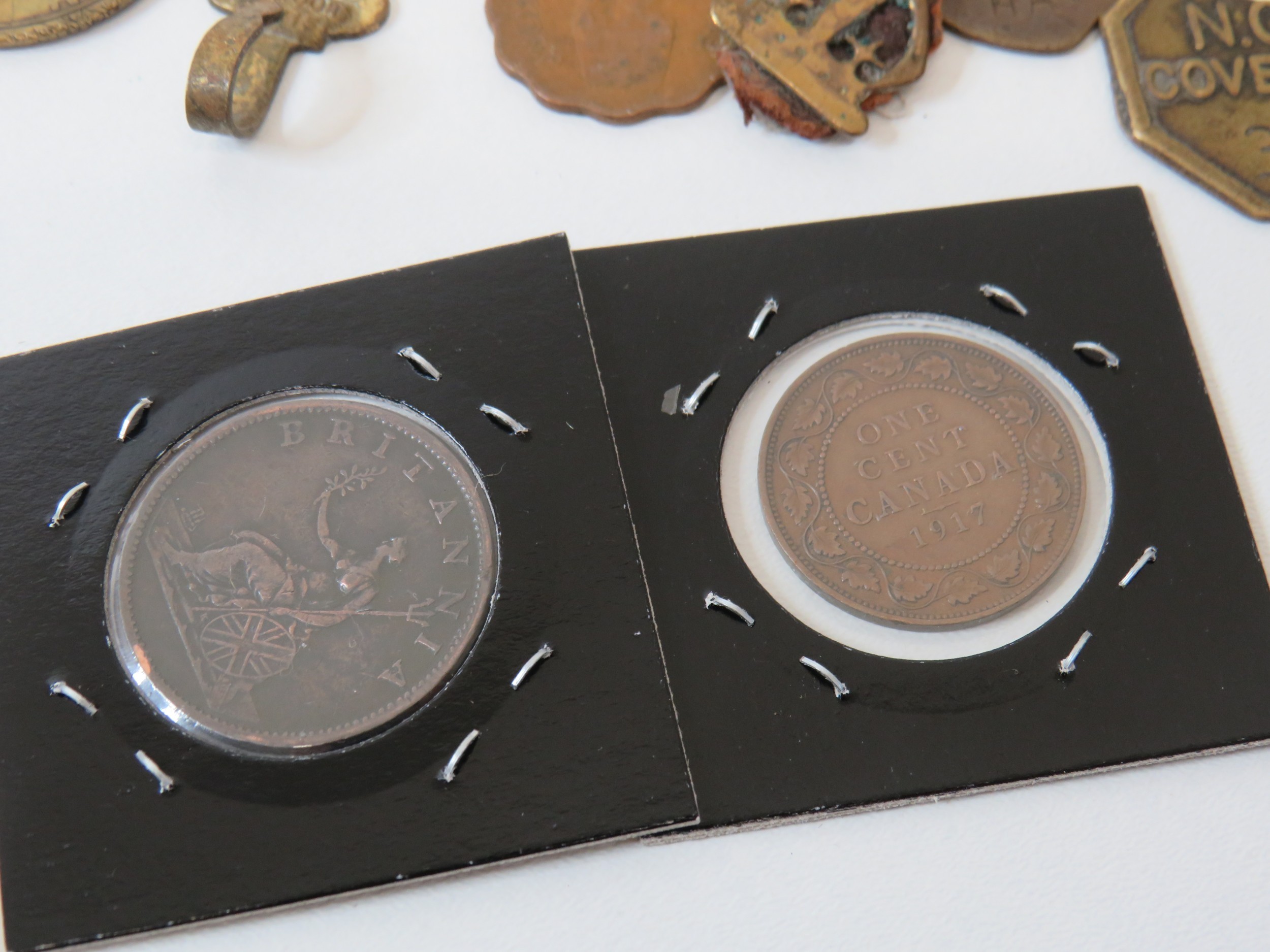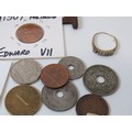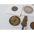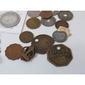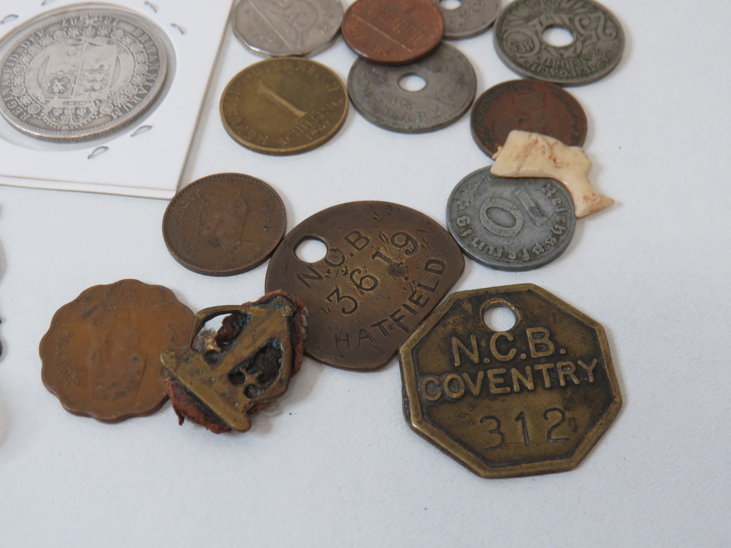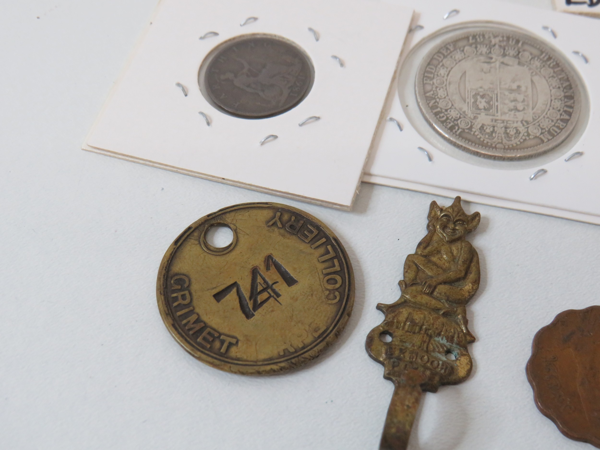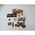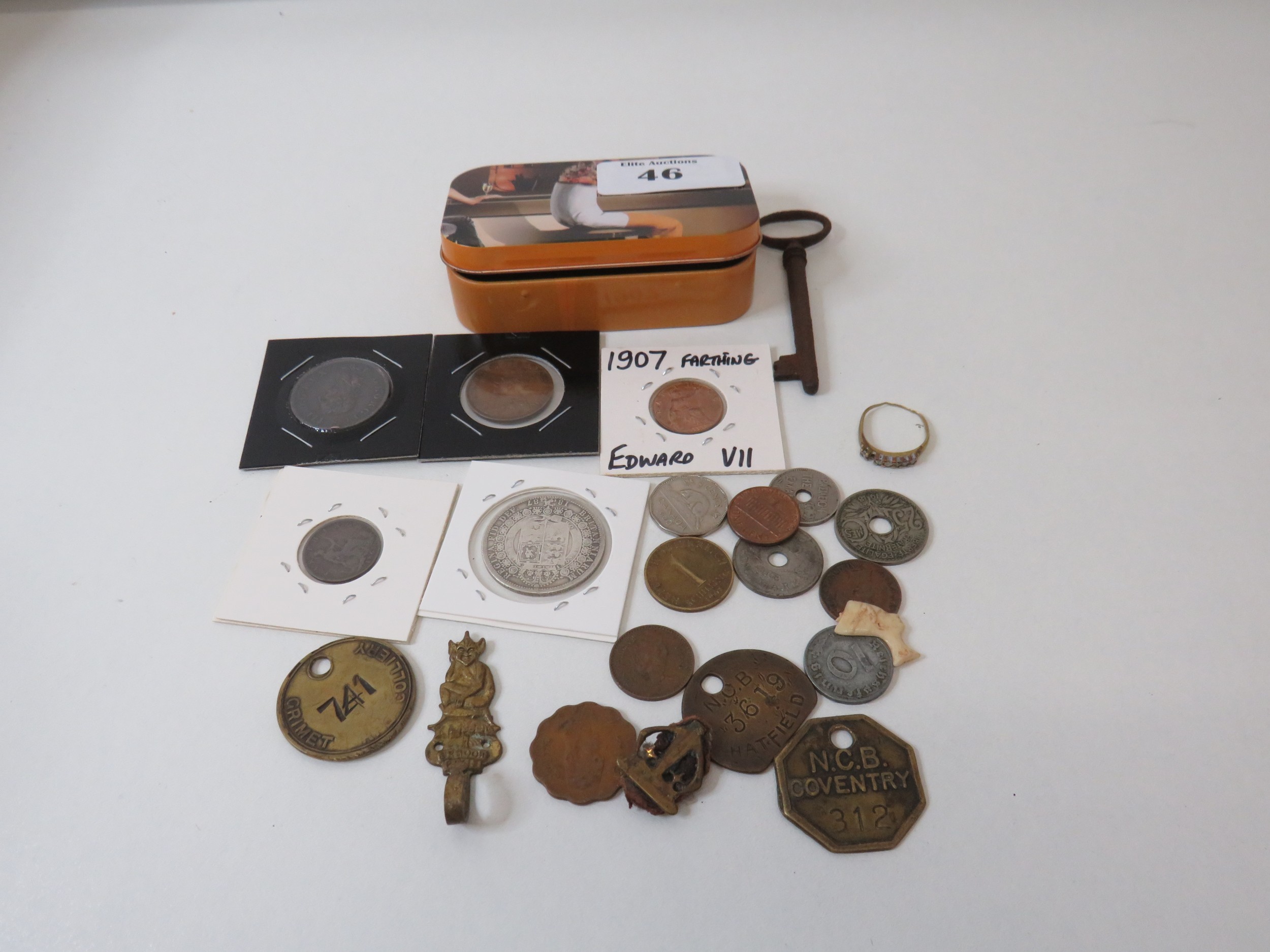 Tin full of various coins, tokens etc including a Victorian silver half crown dated 1887, George III 1807 Halfpenny, pit checks etc