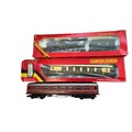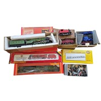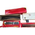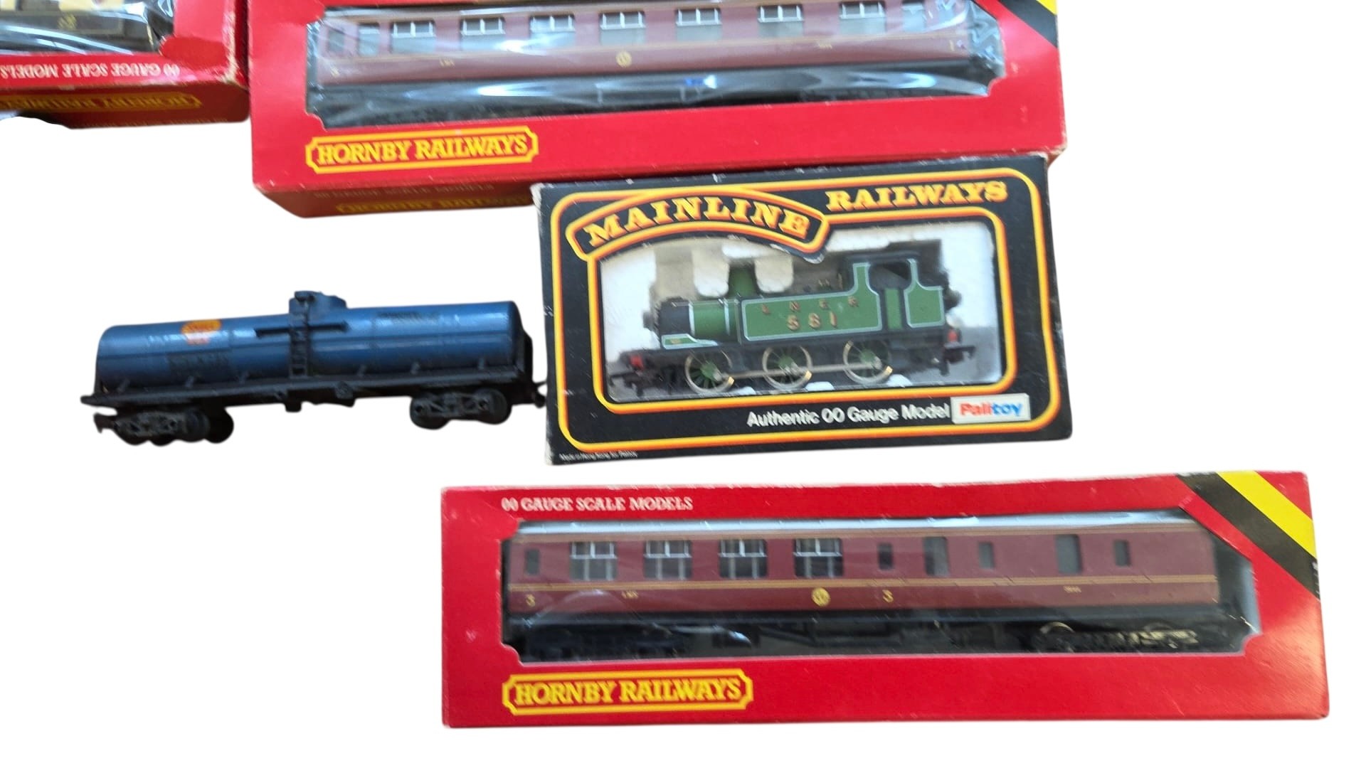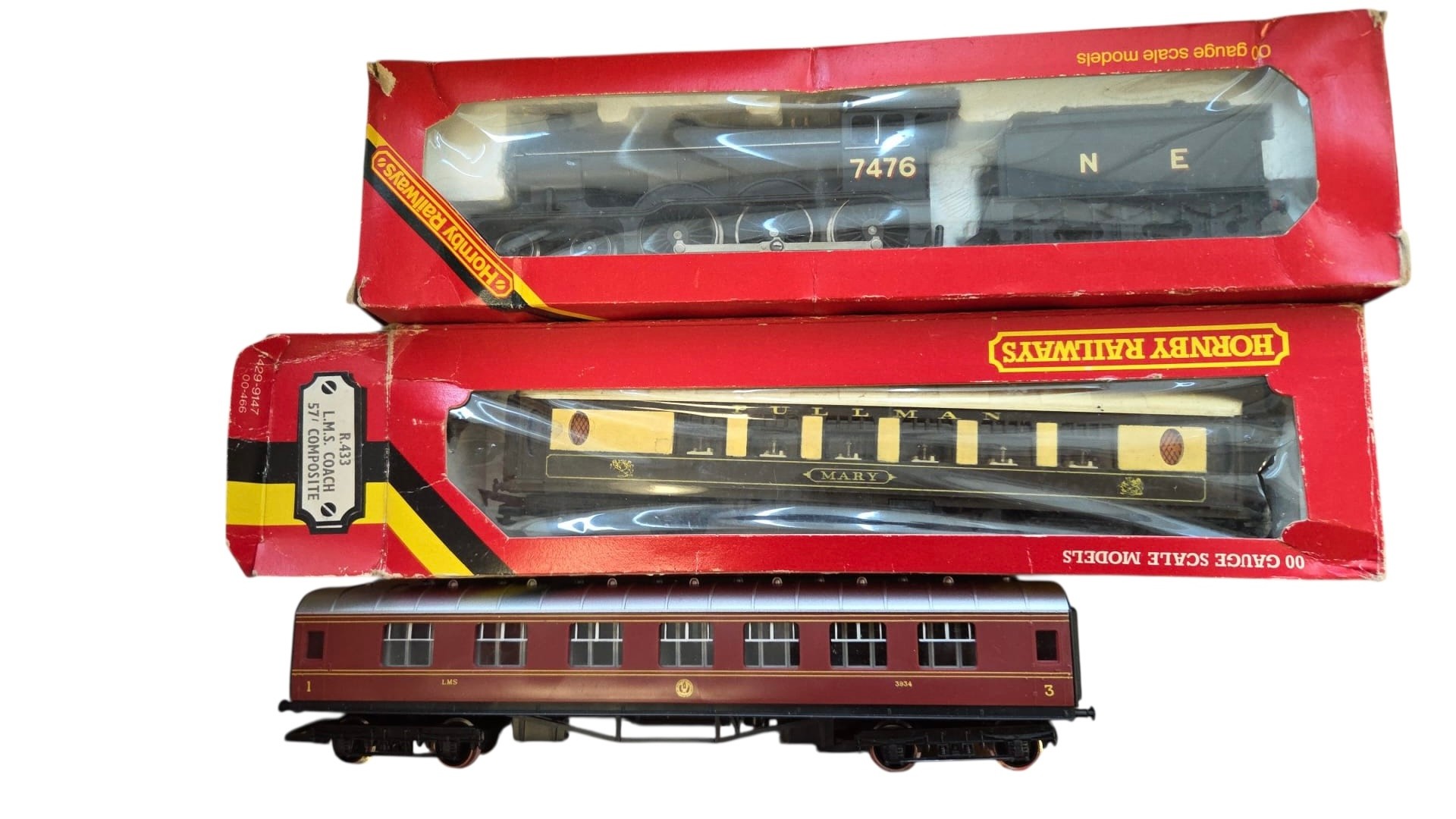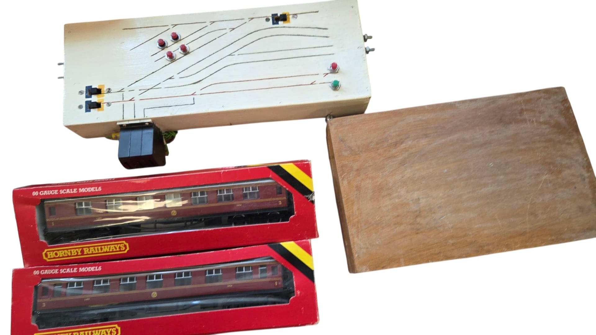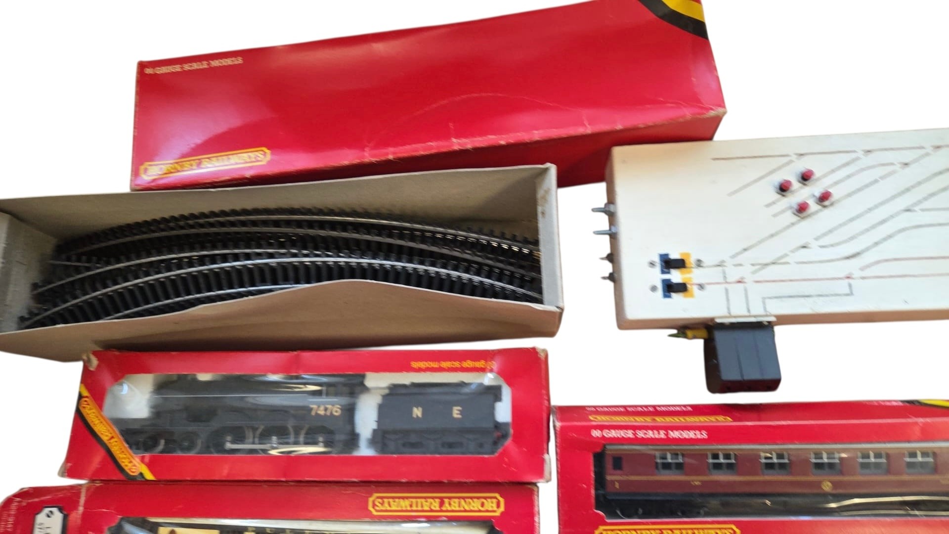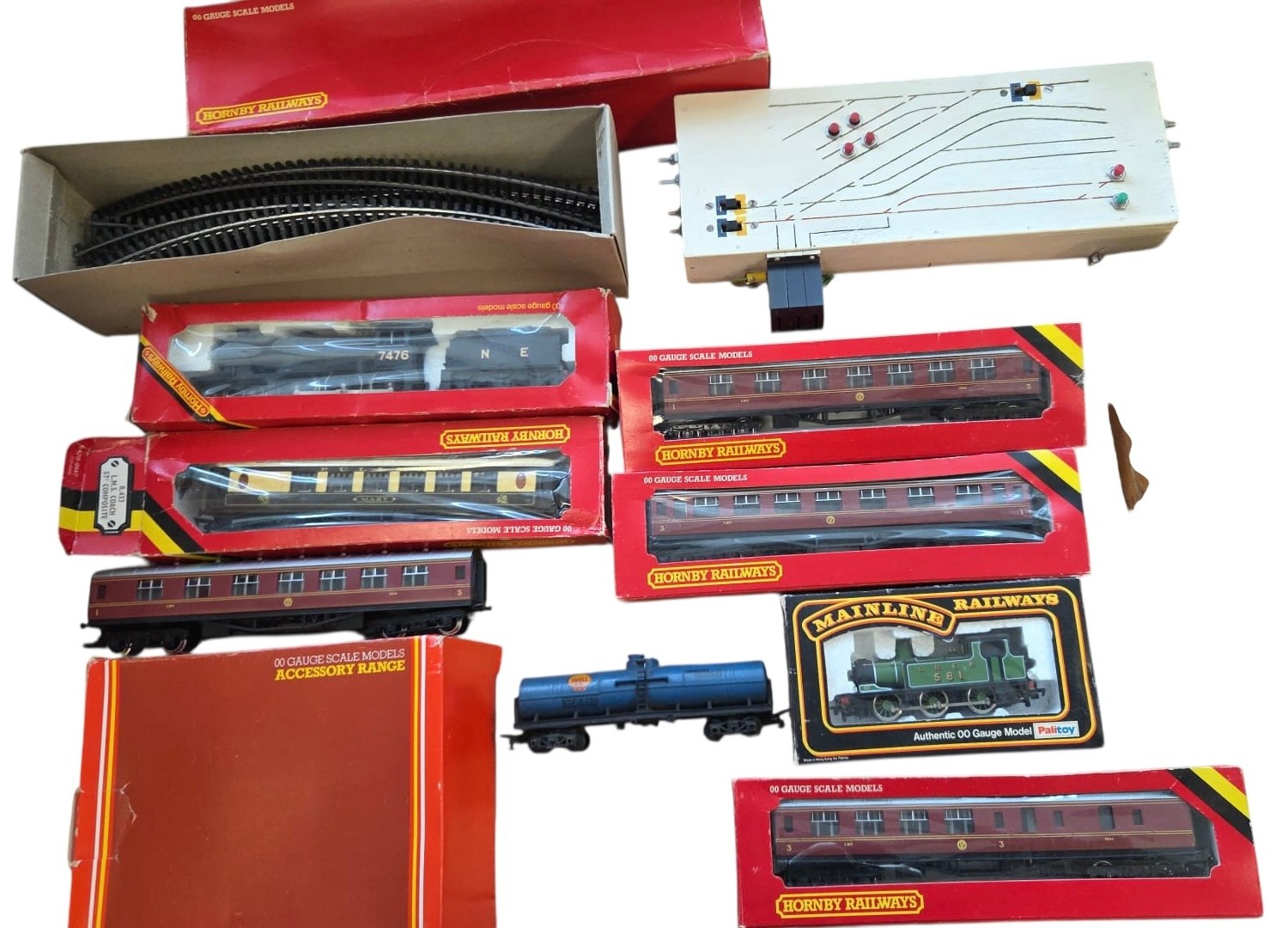A group of OO gauge model railway items, largely Hornby Railways, including boxed LMS Coach Composite, a boxed NE wagon, several maroon passenger coaches, loose rolling stock, a quantity of curved track, and a track-control panel.