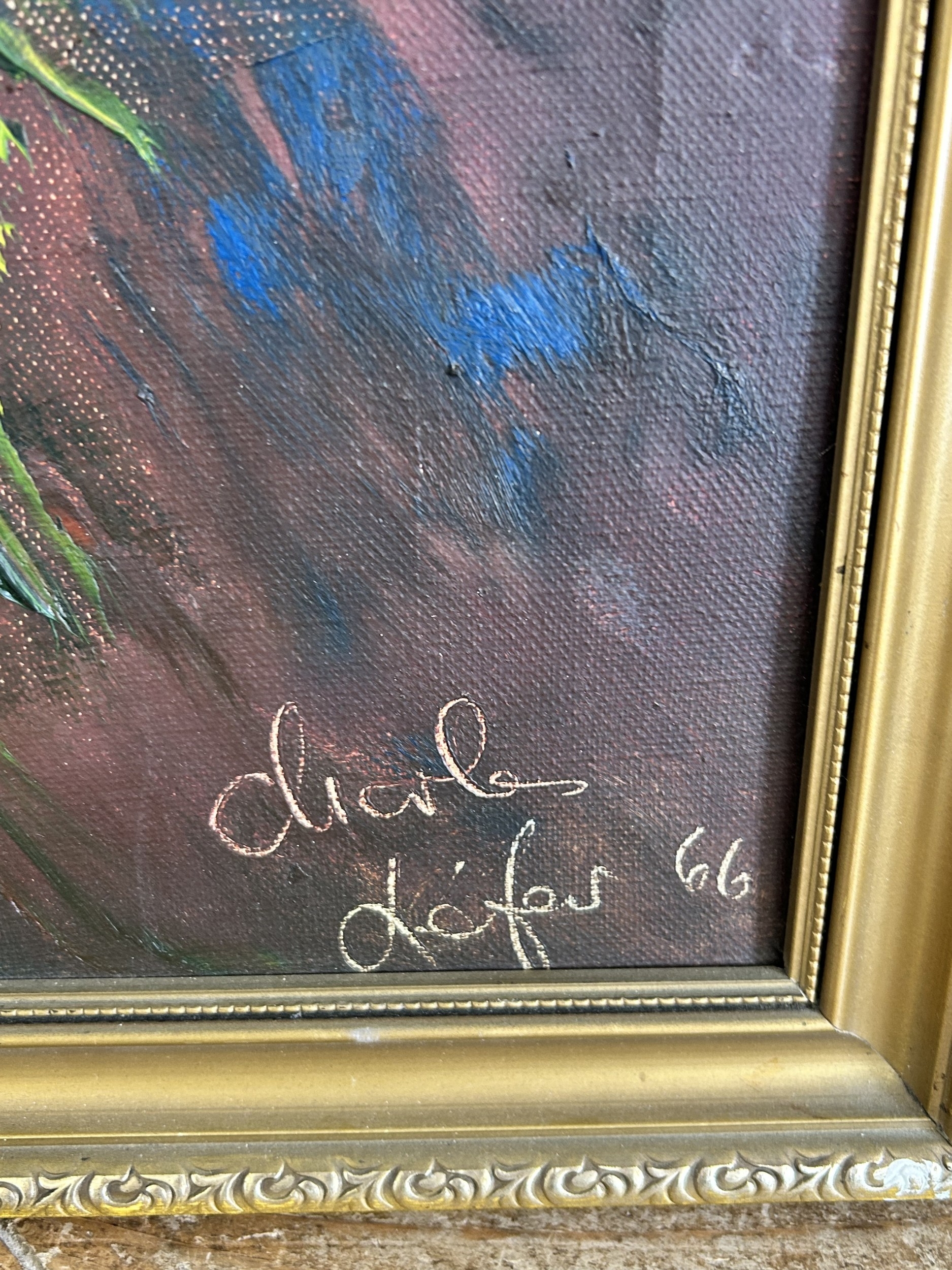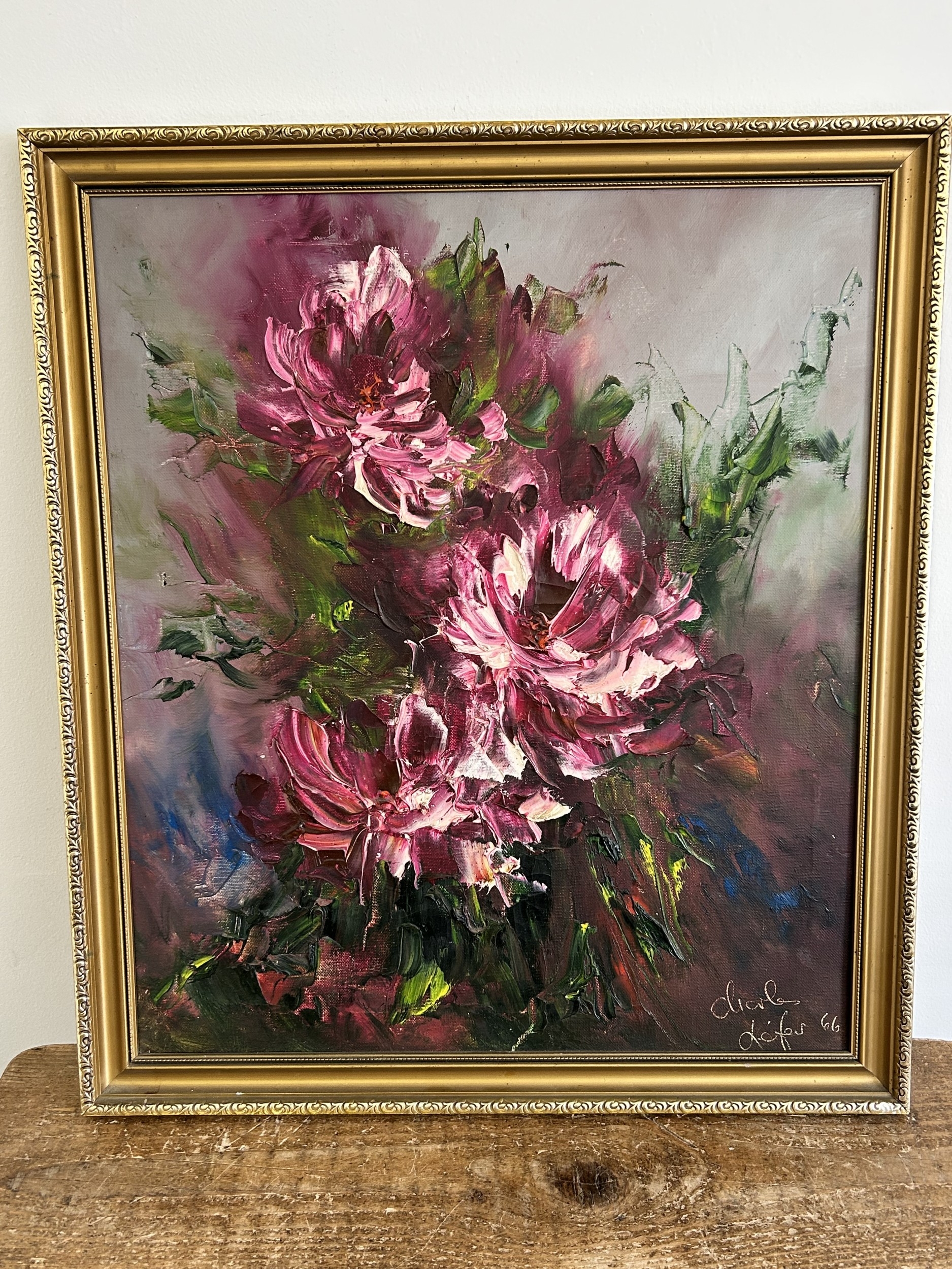 A framed heavy oil on canvas of a still life of flowers, bears signature lower right, possibly Charles Lefer and dated 66, 18" x 21 1/4"