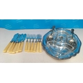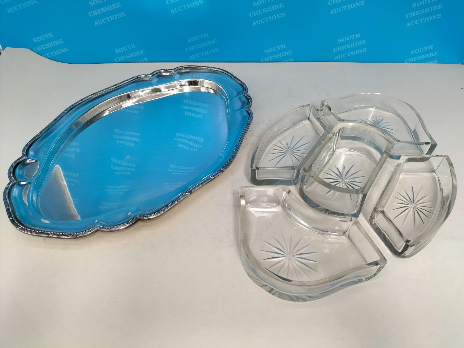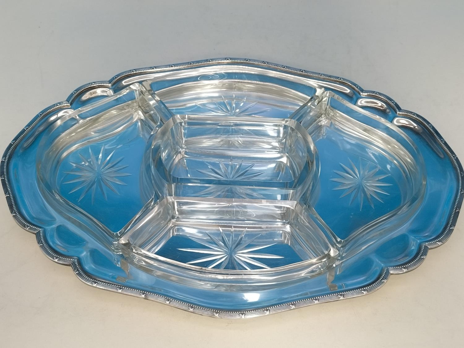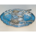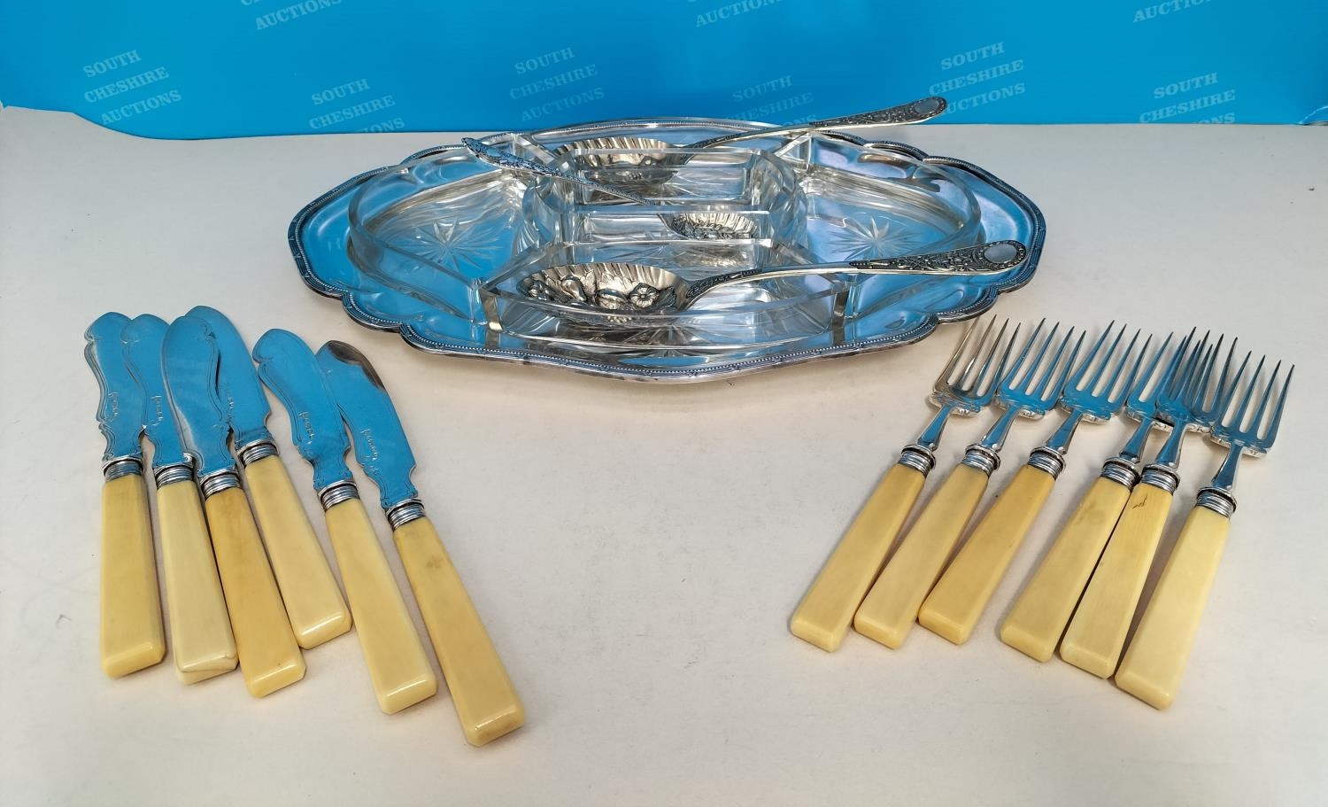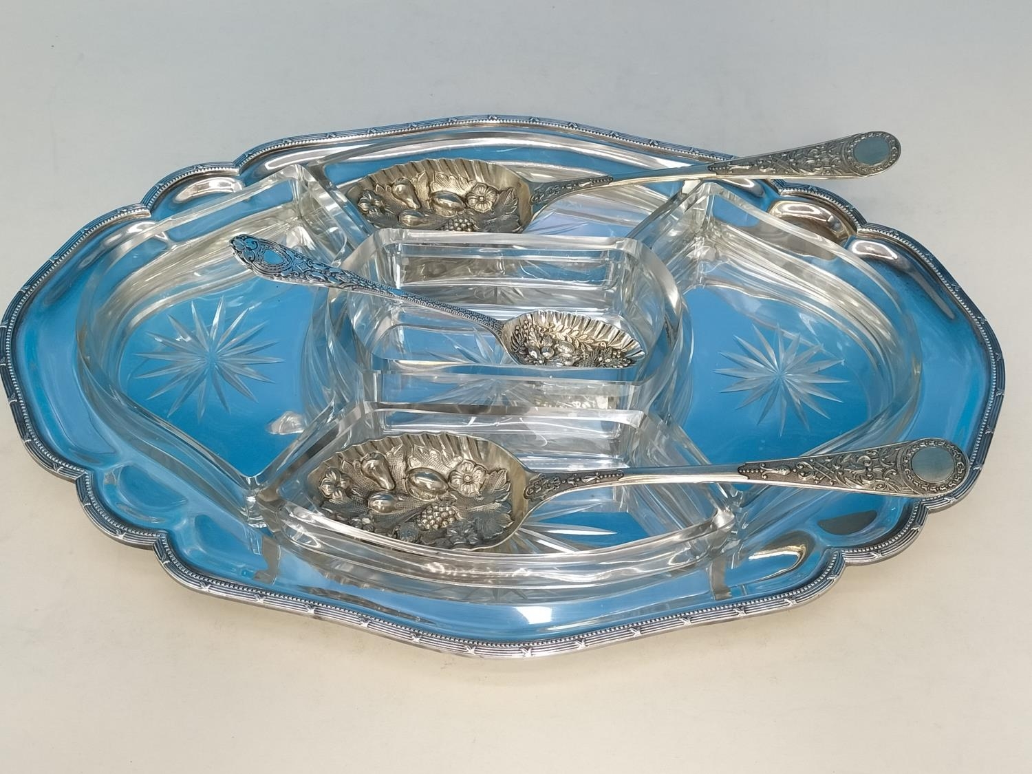 Silver Plated A1 and Glass Harrods (London) Hors D'Oeuvres Dish (38 x 27cms), Berry Spoons (3) and 1884 12 Piece Elkingtons, Mason & Co Fish Knives and Forks