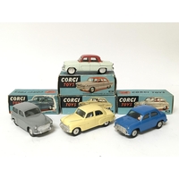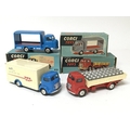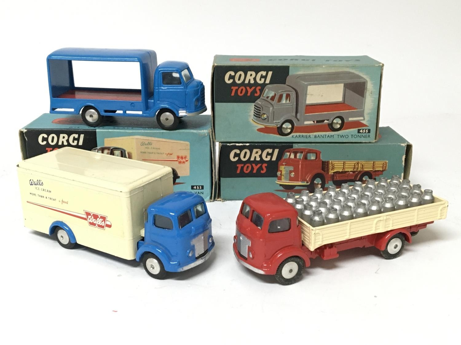 Corgi toys, #452 Commer dropside lorry, #455 Karrie Bantem two tonner and #453 Commer Walls refrigerator van, boxed