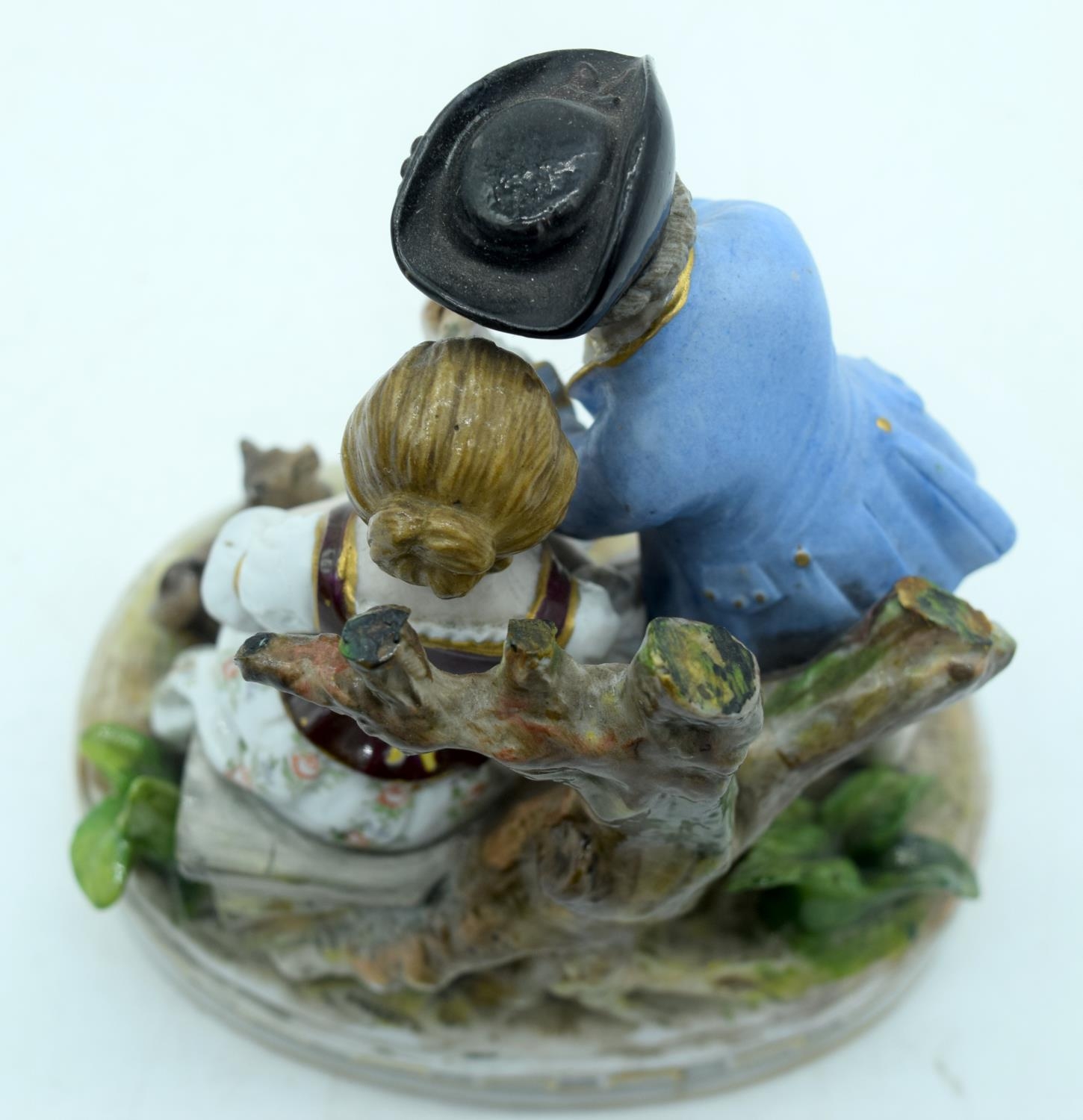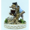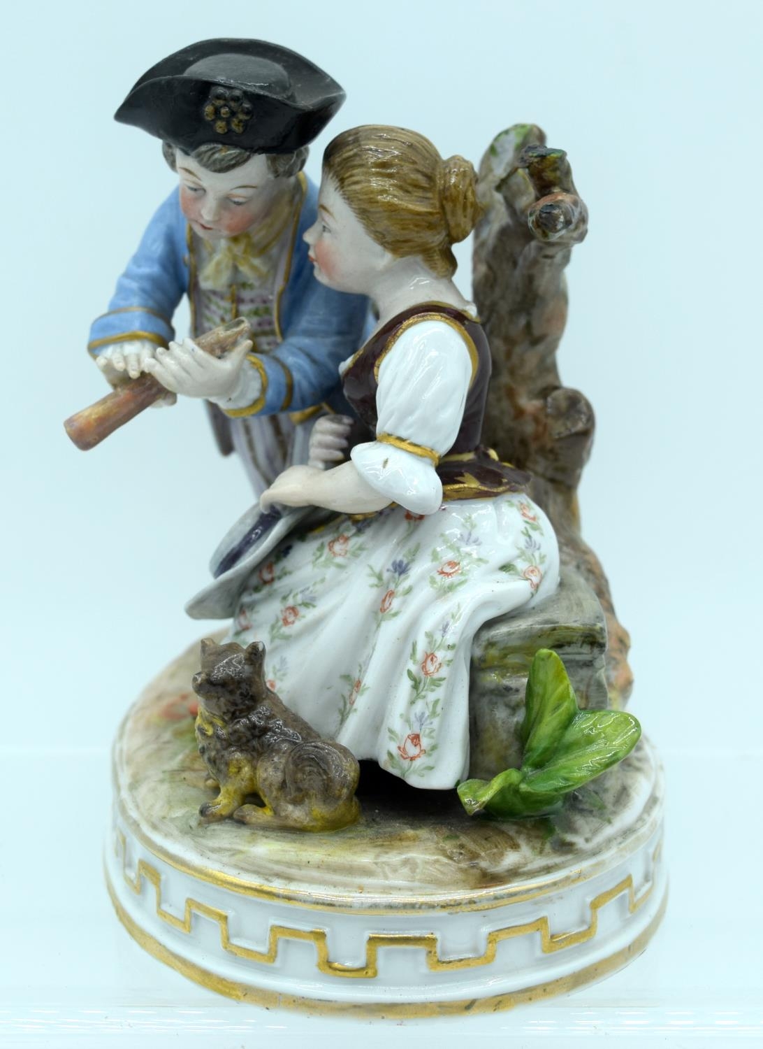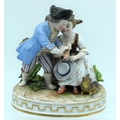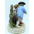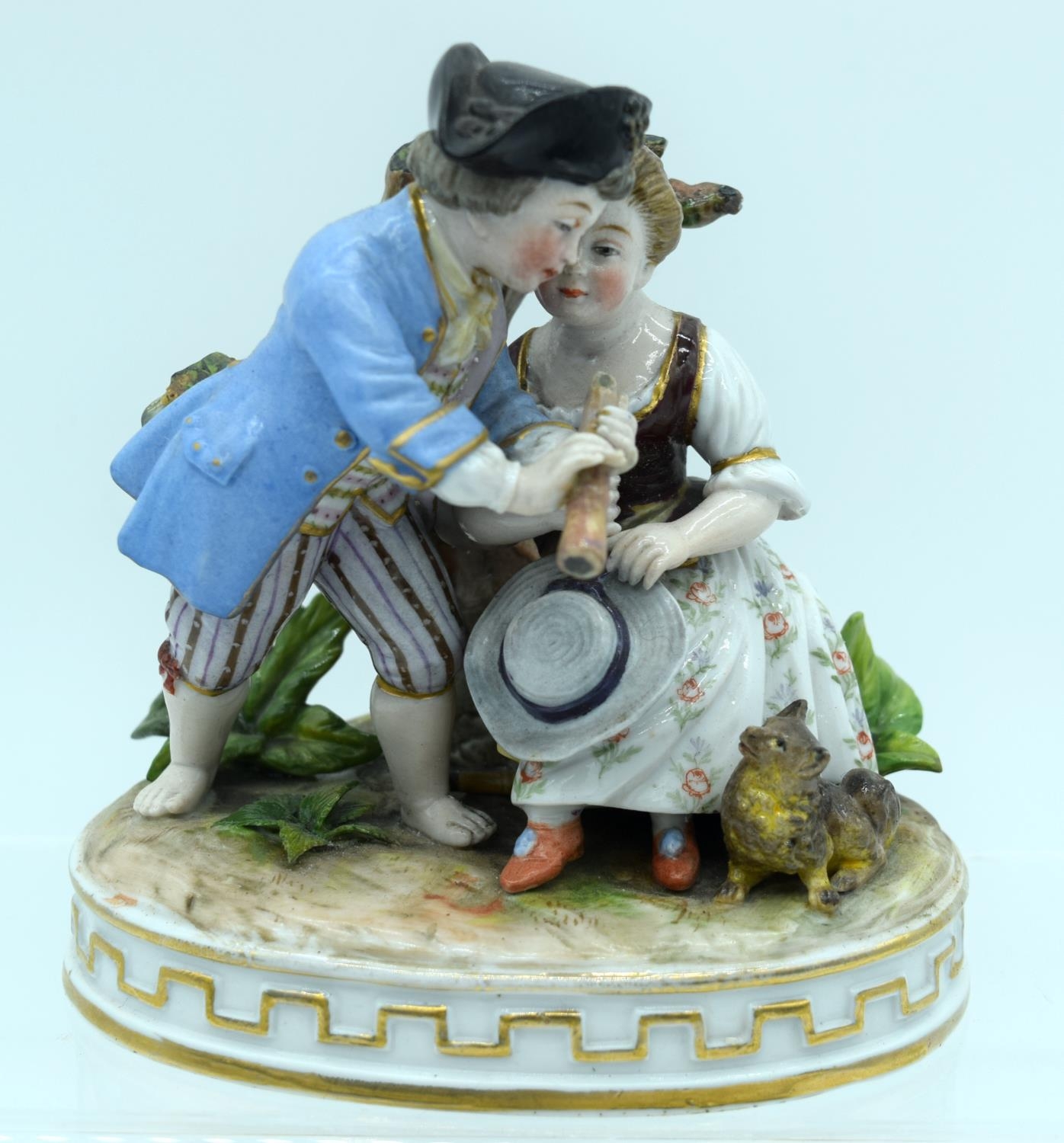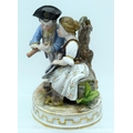 AN ANTIQUE GERMAN PORCELAIN FIGURAL GROUP modelled as a boy and girl playing a pipe. 13 cm x 11 cm.