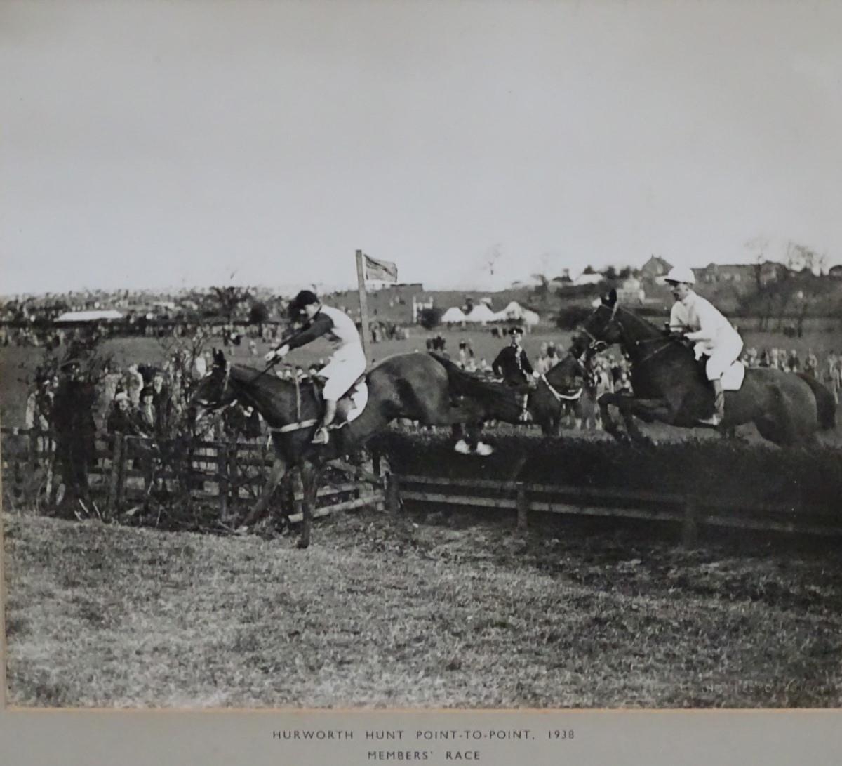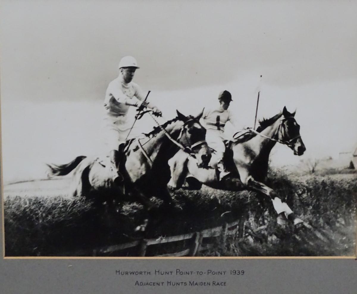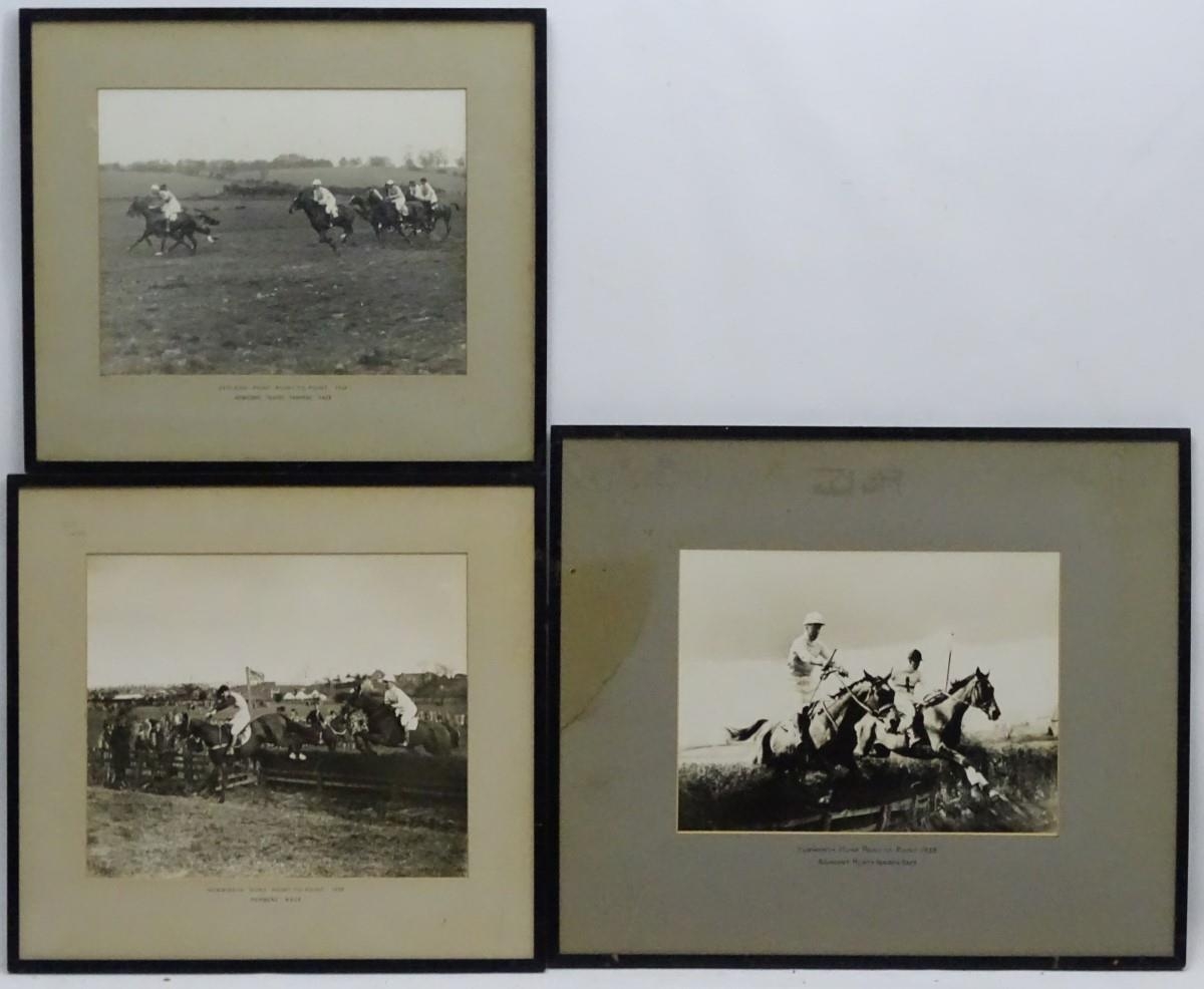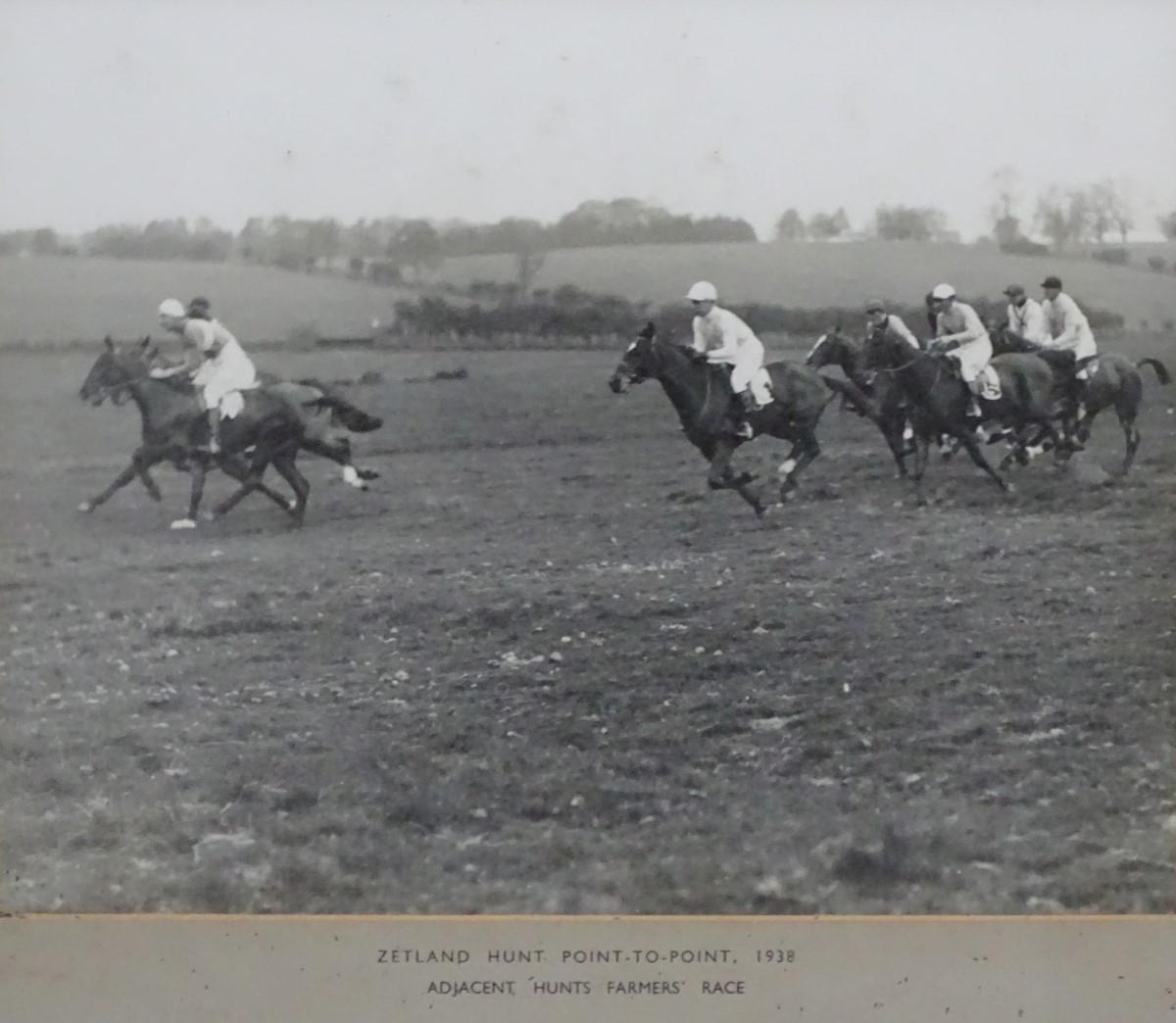 Three monochrome horse racing photographs, to include the 1938 Hawsworth Hunt Point-To-Point Members Race, the 1939 Hawsworth Hunt Point-To-Point Adjacent Hunts Maiden Race and the 1938 Zetland Hunt Point-To-Point Adjacent Hunt Farmers Race. The largest approx. 9 1/2'' x 11 3/4''. (3)