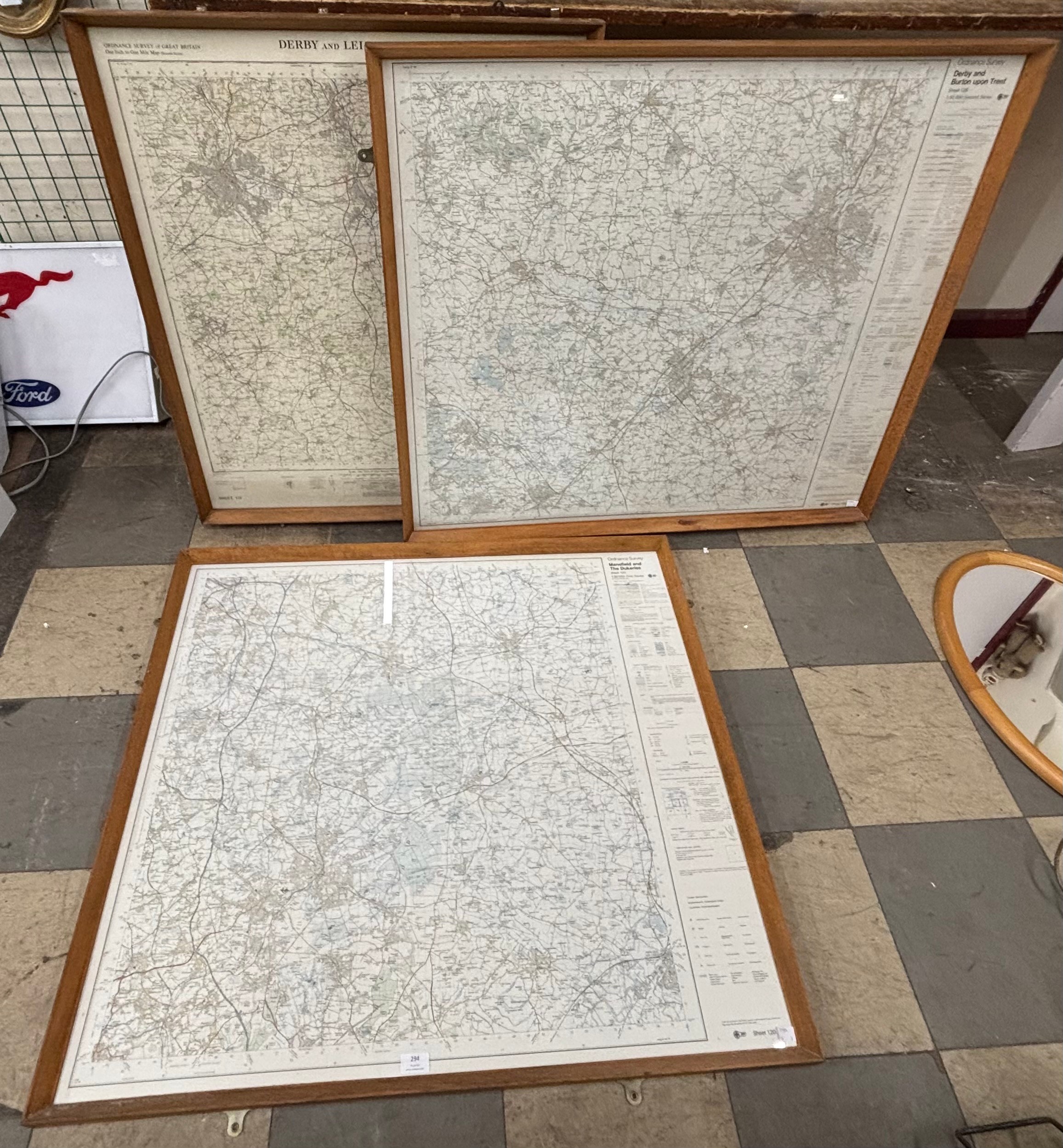 Three framed Ordnance Survey maps; Derby & Leicester, Mansfield & The Dukeries and Derby & Burton upon Trent