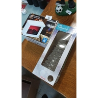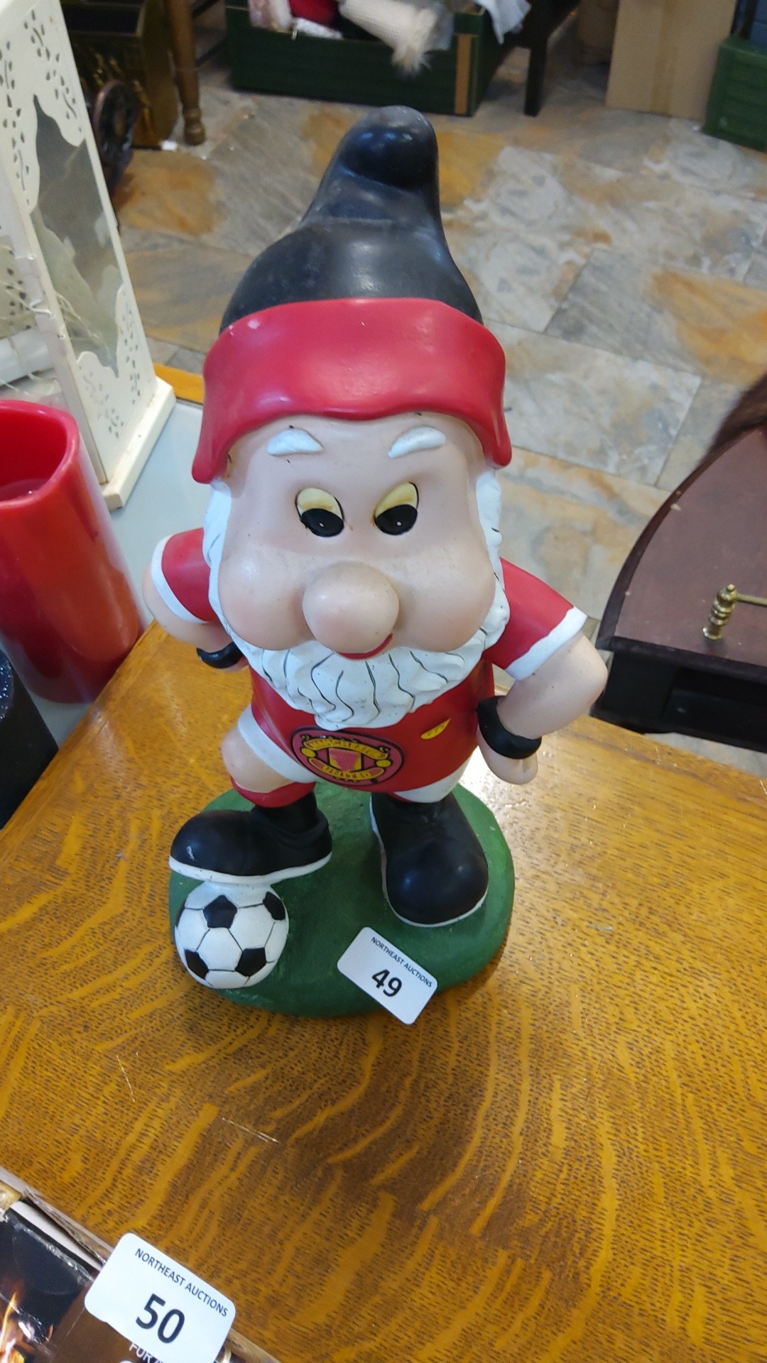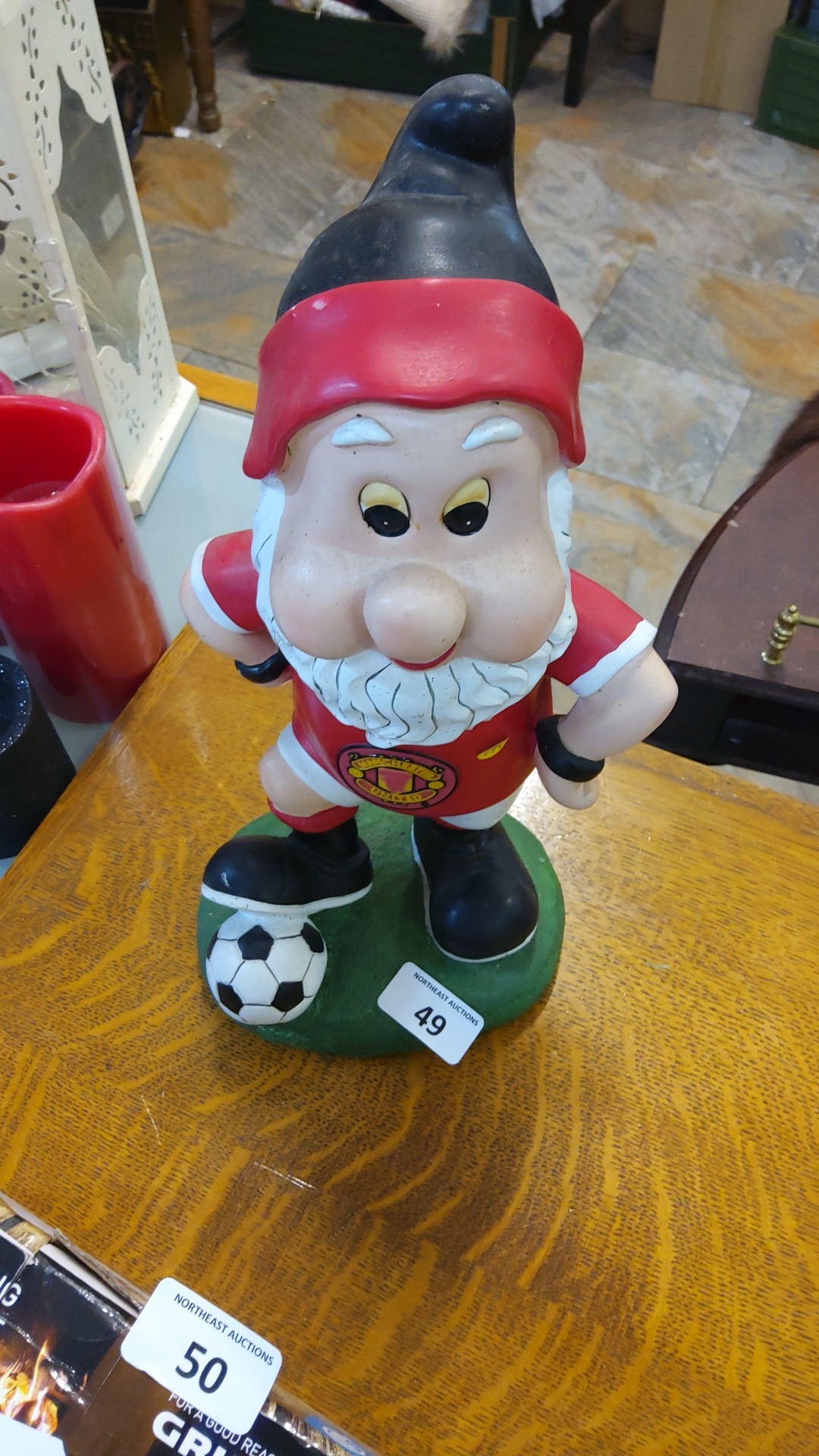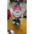 Hand-painted resin garden gnome ornament in Manchester United football kit, standing with a soccer ball on shaped green base.