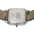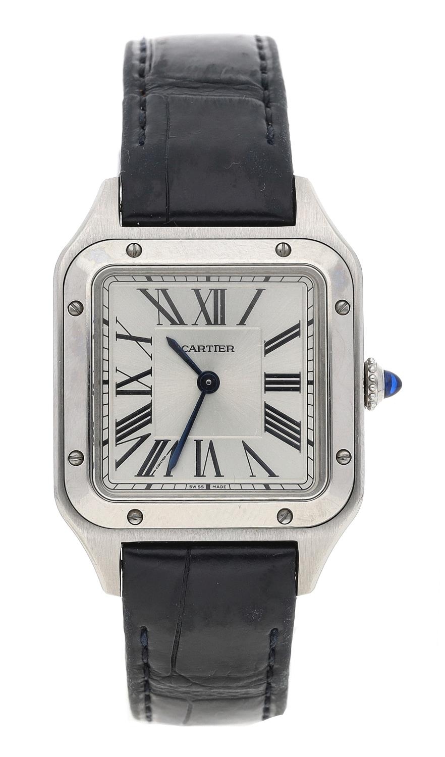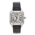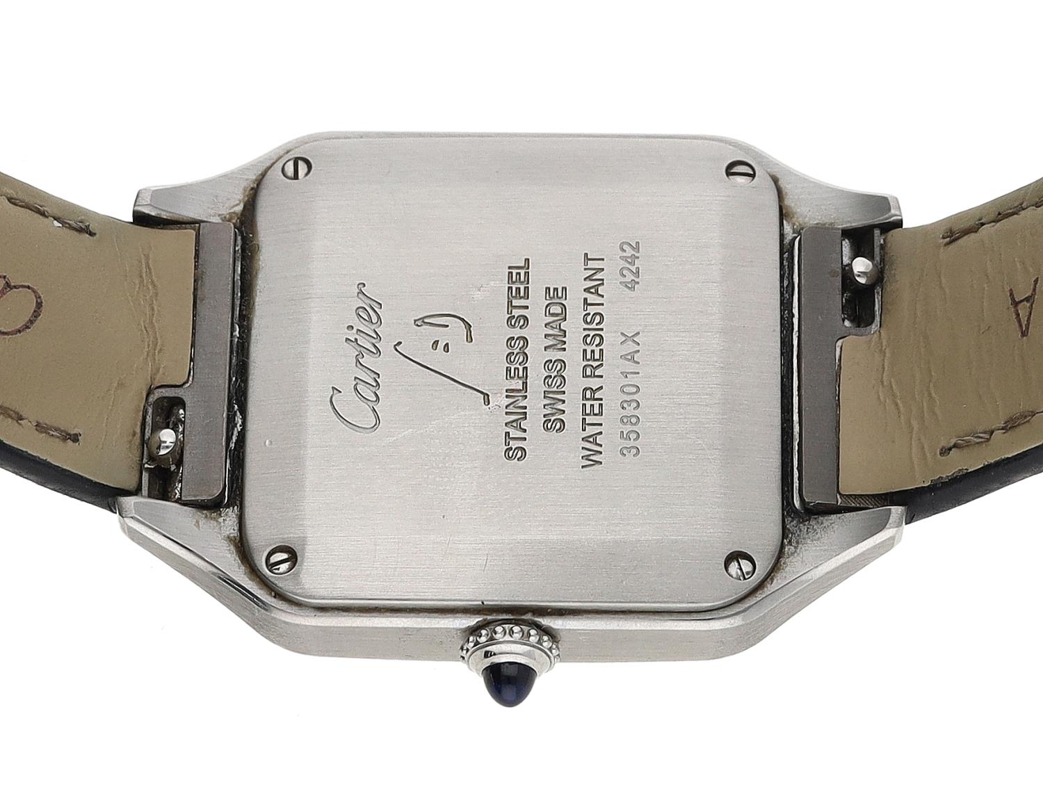 Cartier Santos Dumont stainless steel lady's wristwatch, reference no. 4242, serial no. 35830xxx, silvered dial, cabouchon crown, Cartier black leather strap with signed buckle, quartz, 28mm (ref: 410)