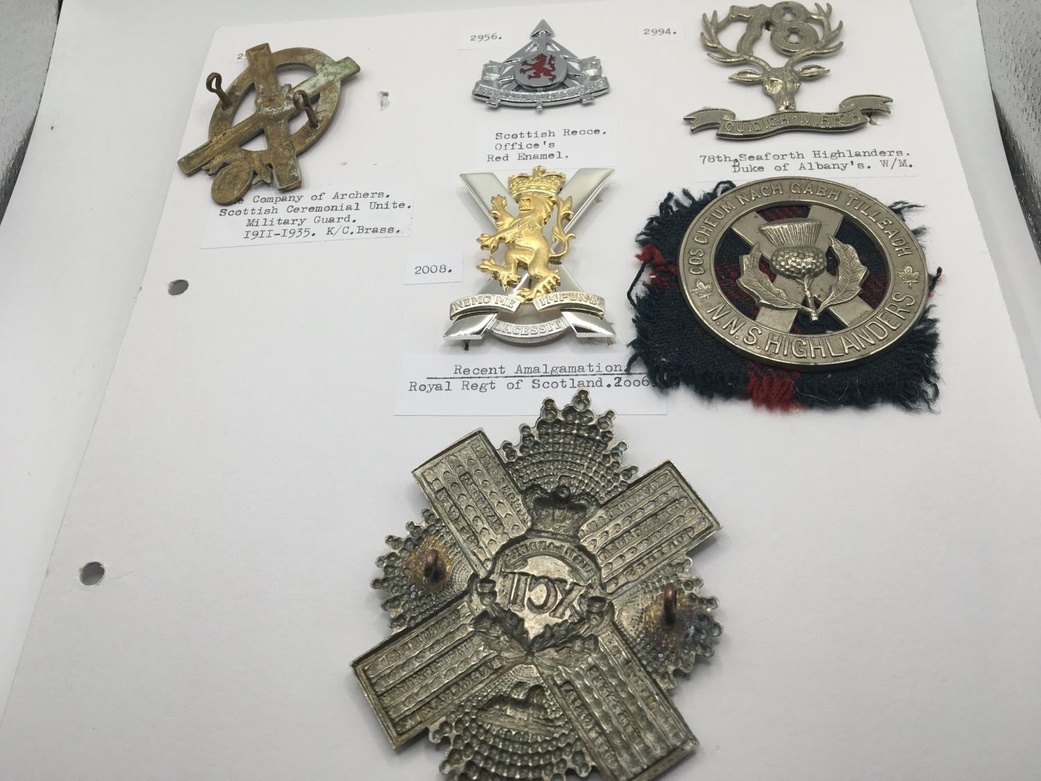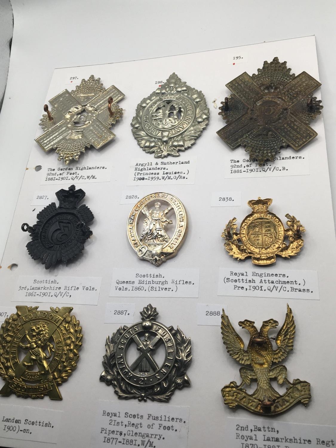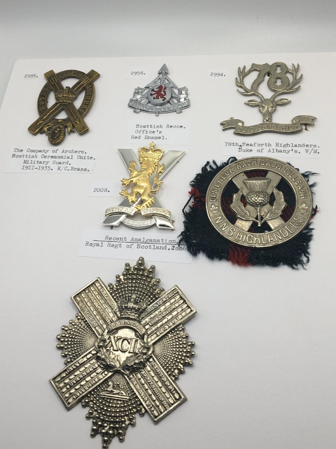 A collection of Scottish regimental Military cap badges including Seaforth Highlanders 78th of Foot Highland Boarders 1860 Gordon Highlanders on three cards each with a detailed description.