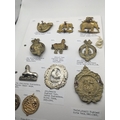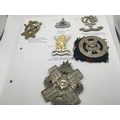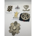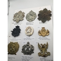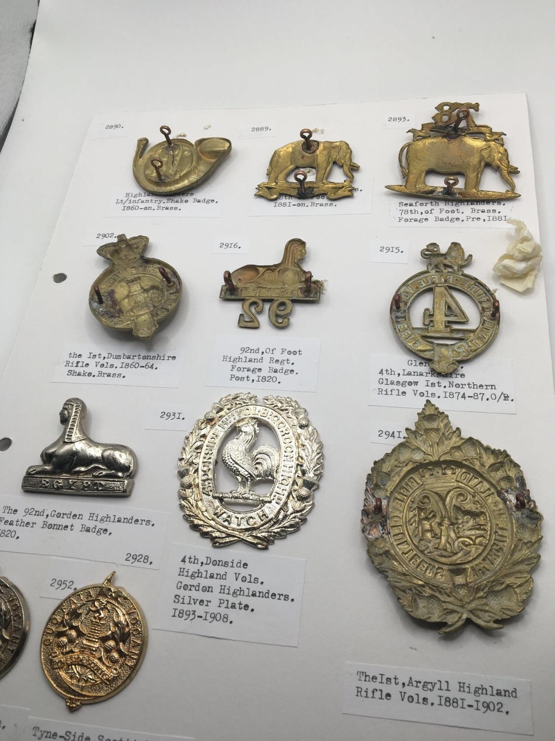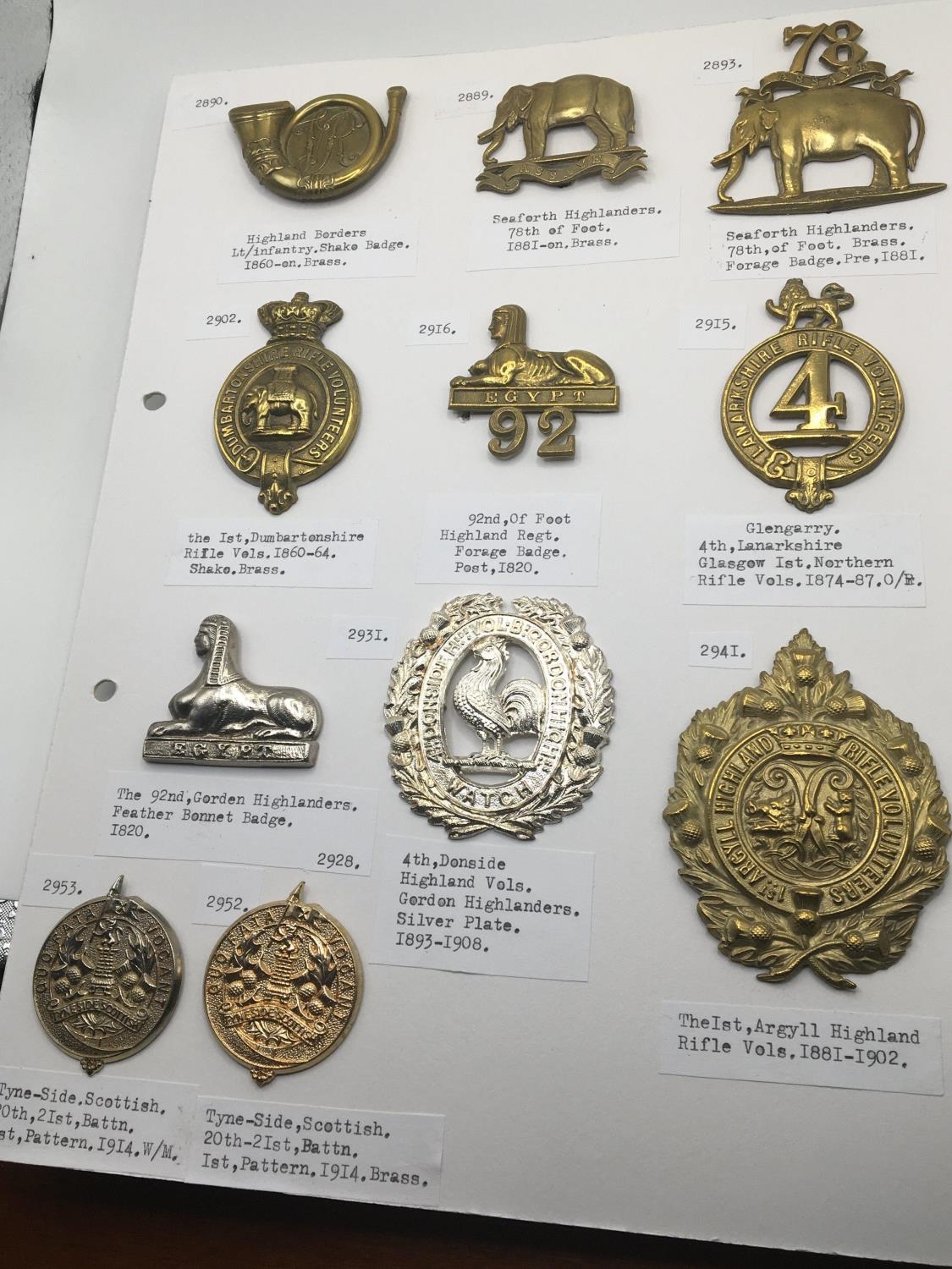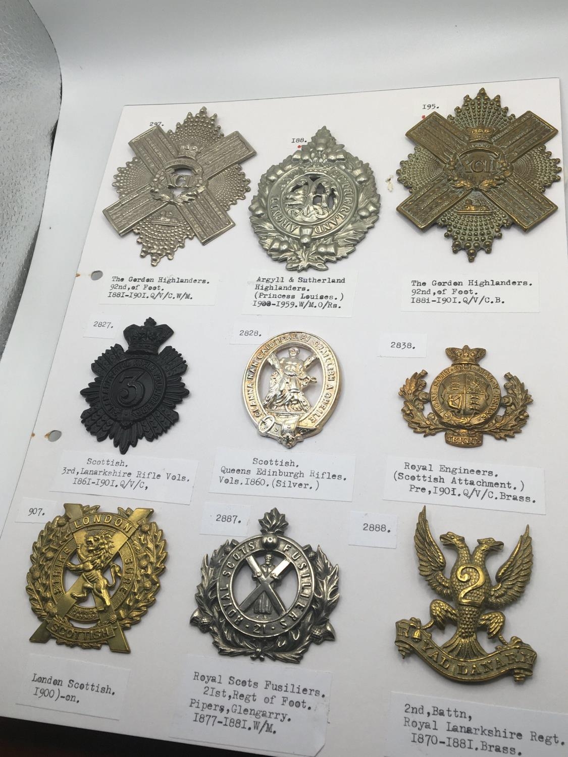 A collection of Scottish regimental Military cap badges including Seaforth Highlanders 78th of Foot Highland Boarders 1860 Gordon Highlanders on three cards each with a detailed description.
