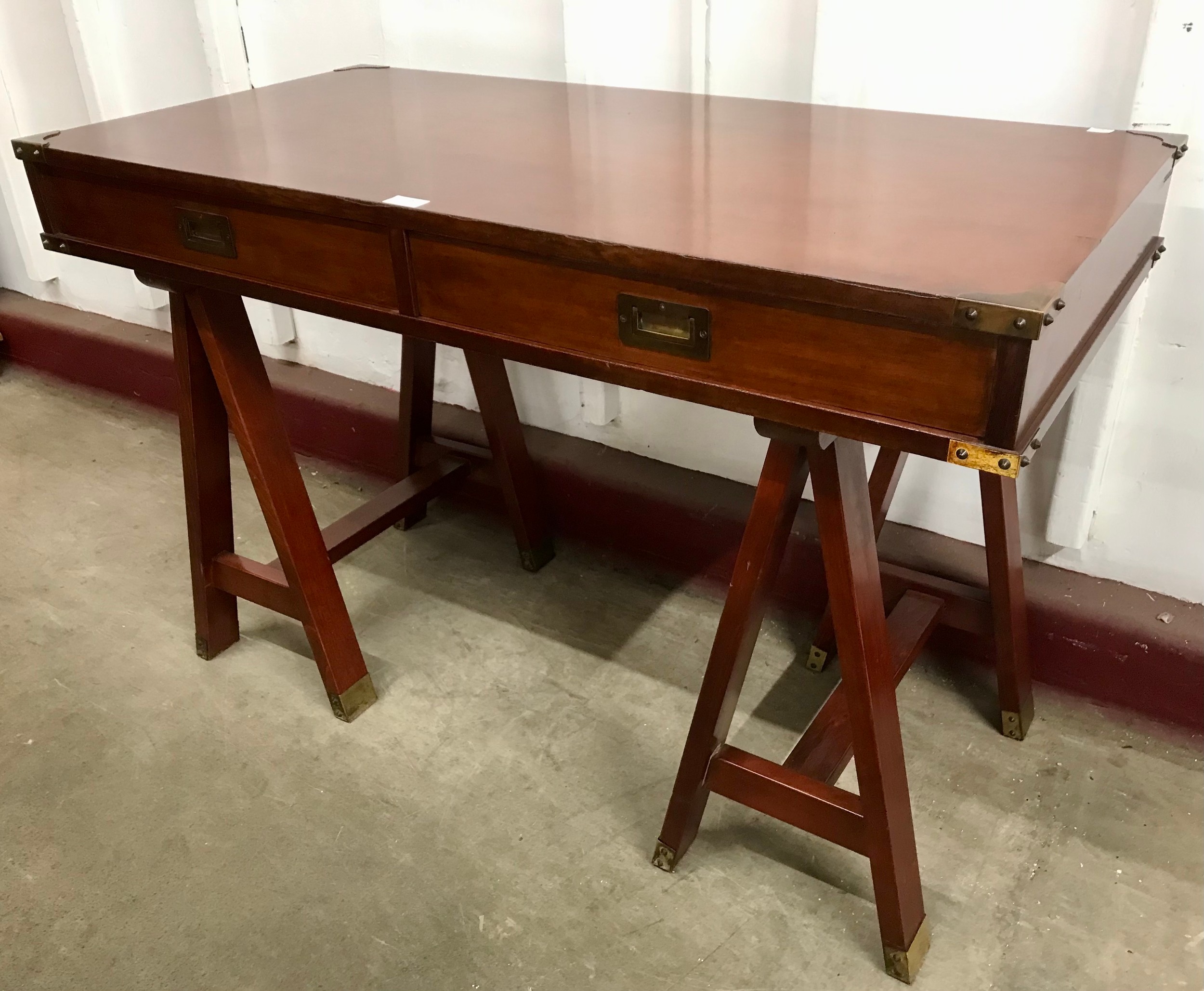 A mahogany and brass mounted campaign style writing table