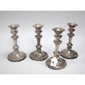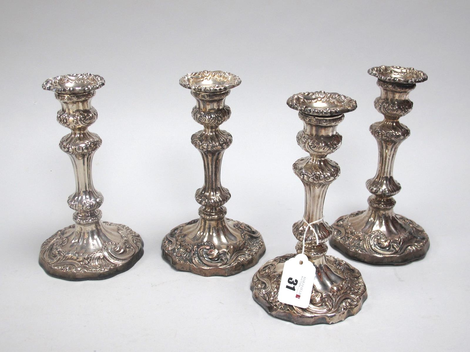A Set of Four William IV Hallmarked Silver Candlesticks, IS over HW, Sheffield 1830, each allover detailed in relief with foliate scrolls, with removable nozzles (one stuck), each on shaped circular spreading base (weighted), 19.5cm high, crested (damages). (4)