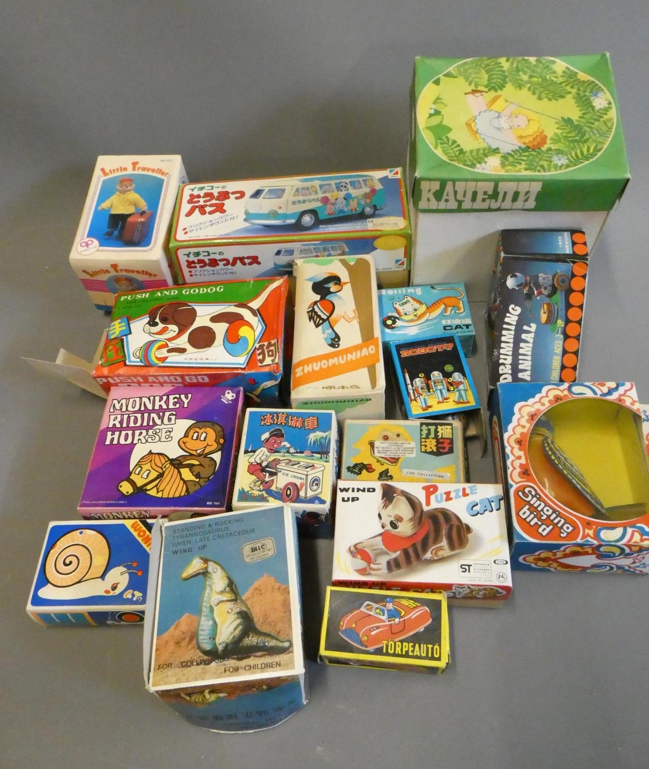 Sixteen modern Chinese made tinplate toys including animals, cars and novelties. All items boxed