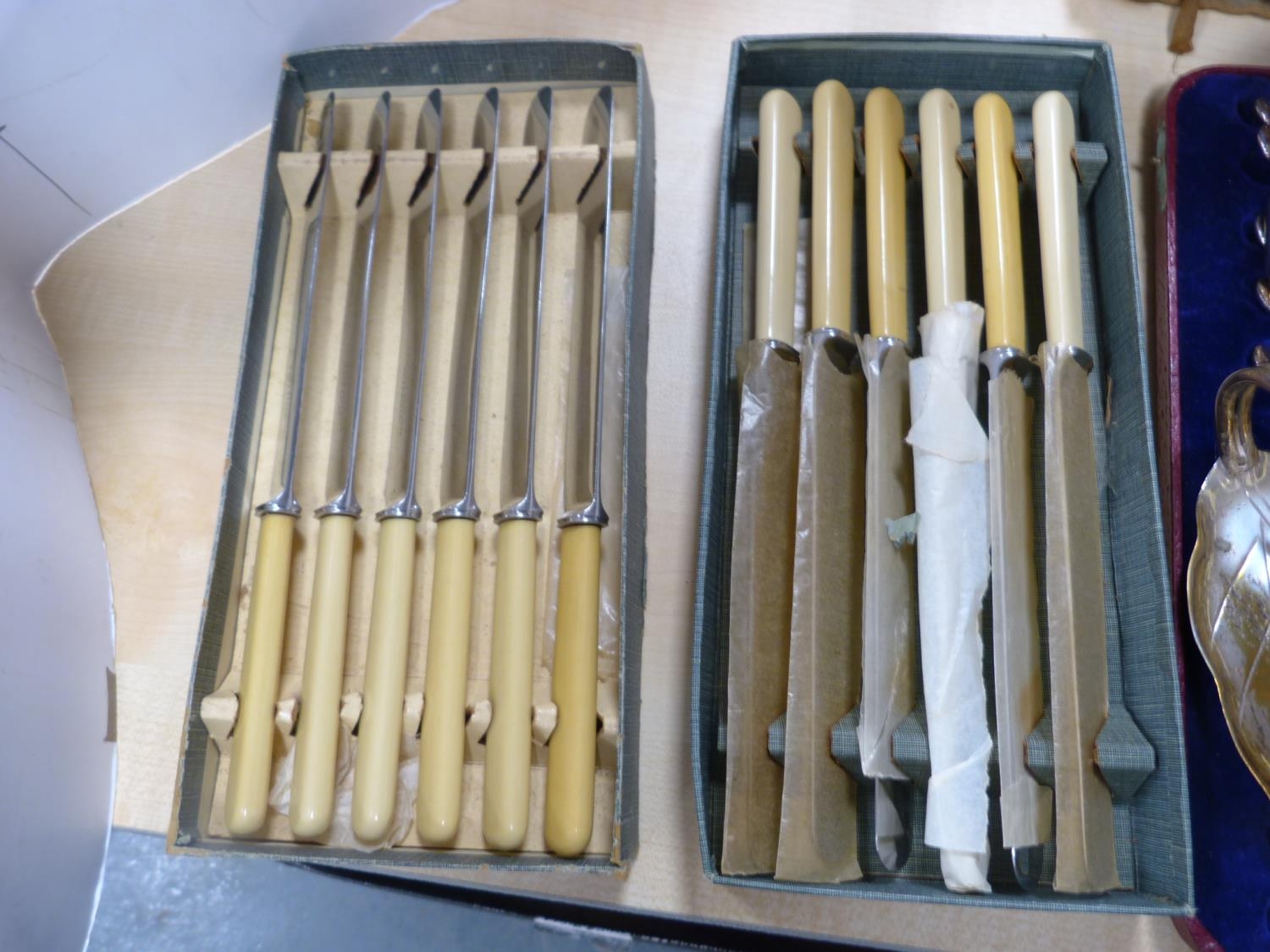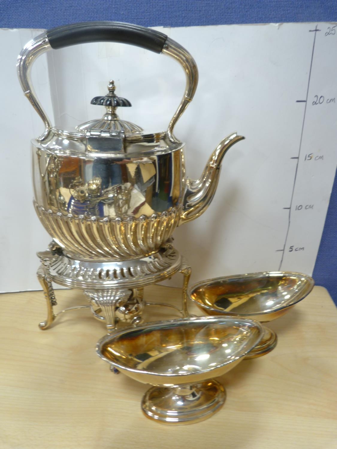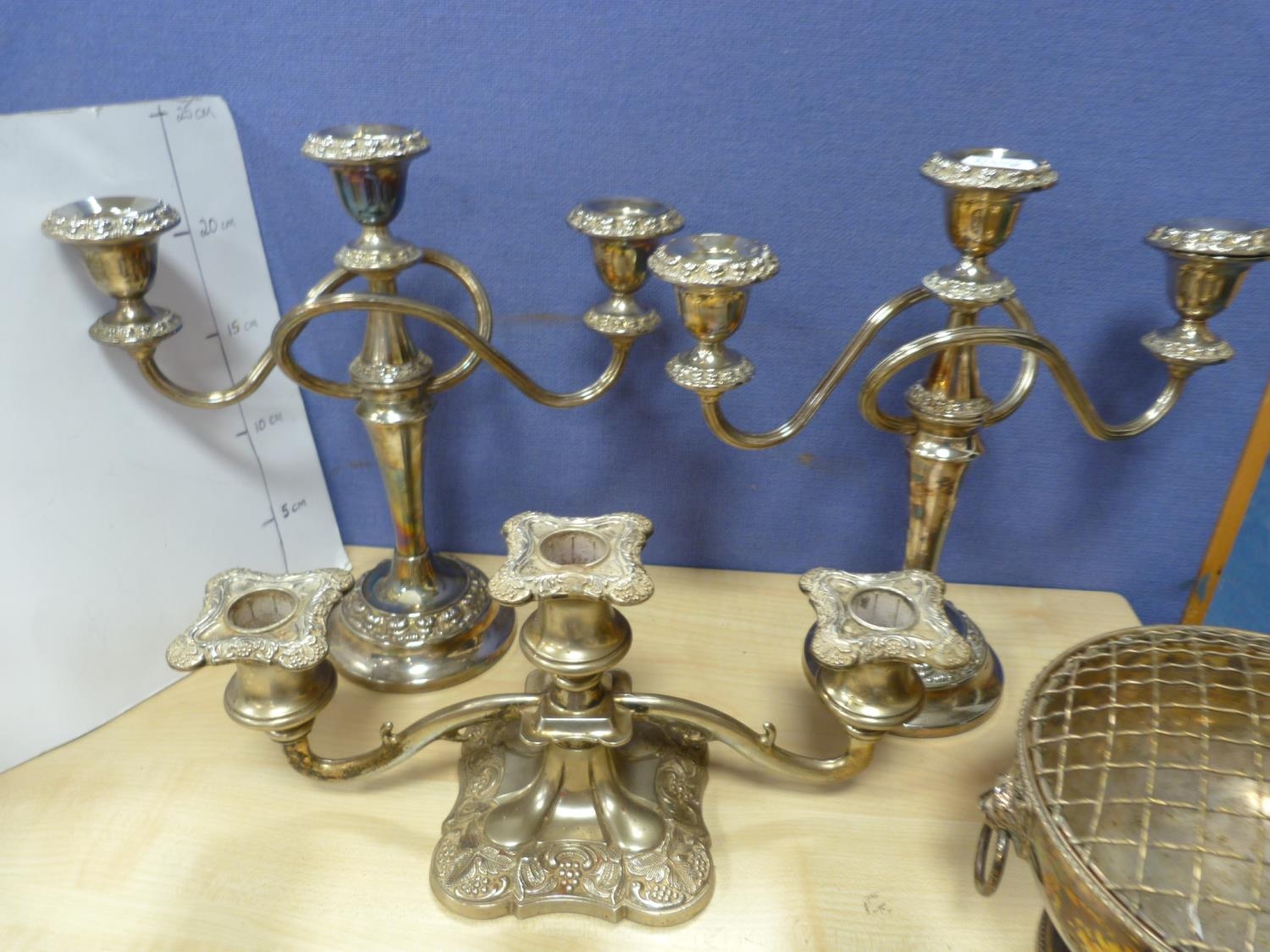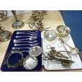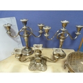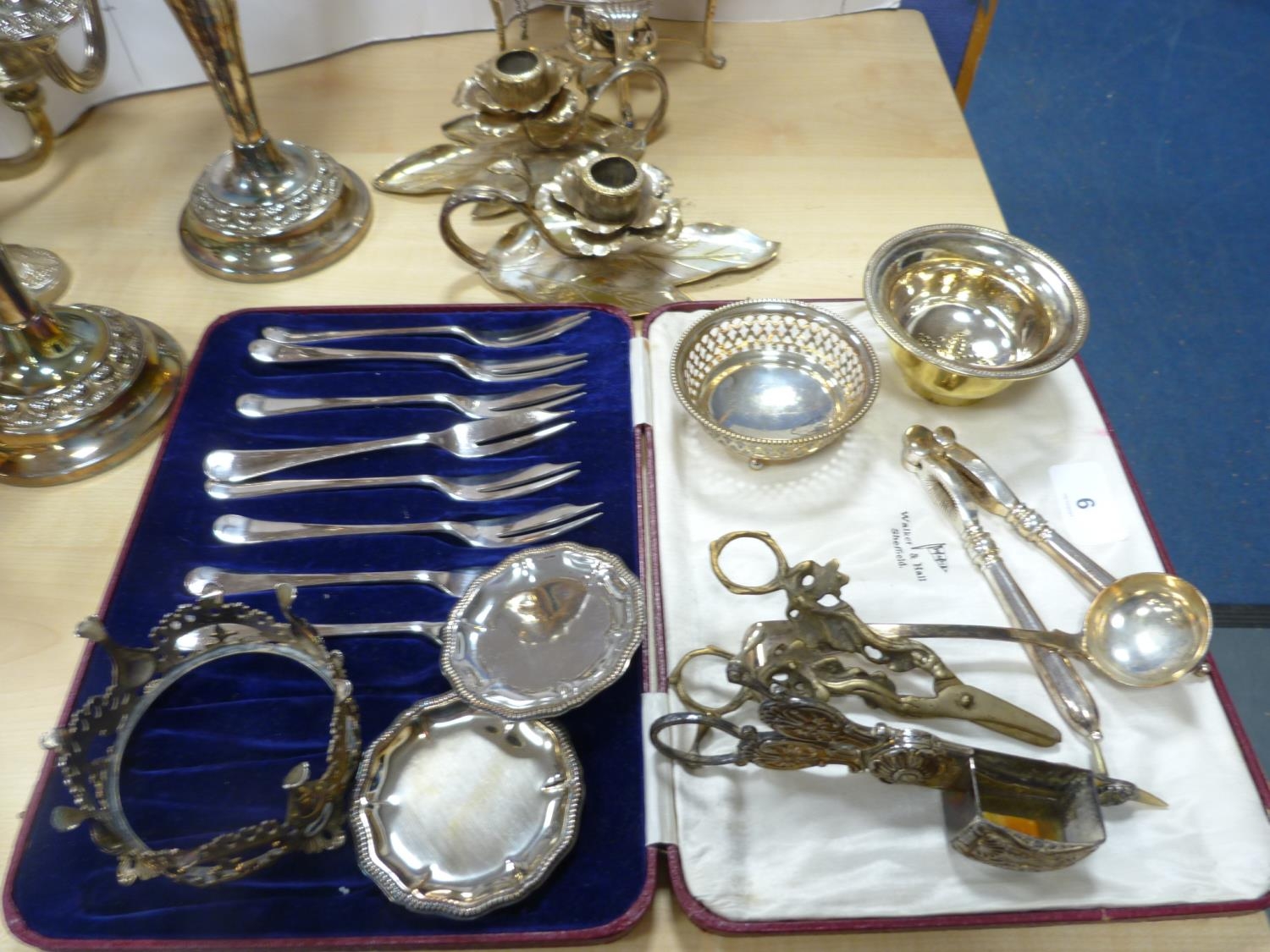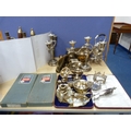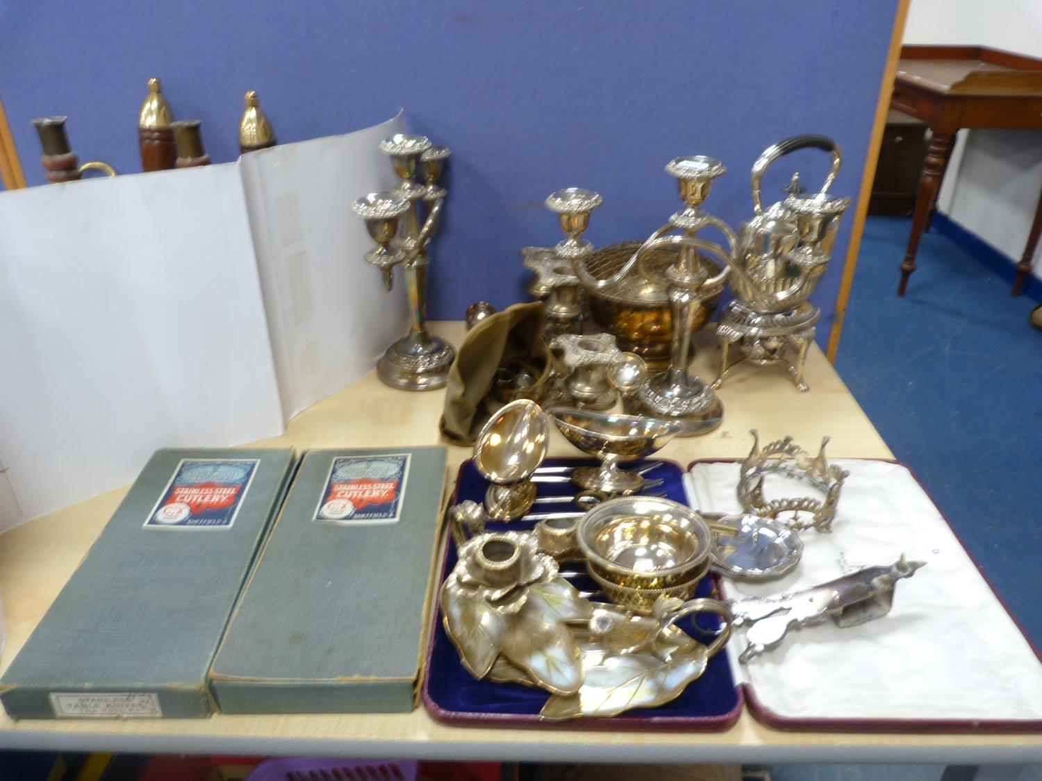 Collection of EP including three-sconce candelabrum, tea kettle on stand, rose bowl, loose cutlery, salts, candle snuffers, cake forks, cased cutlery etc.