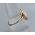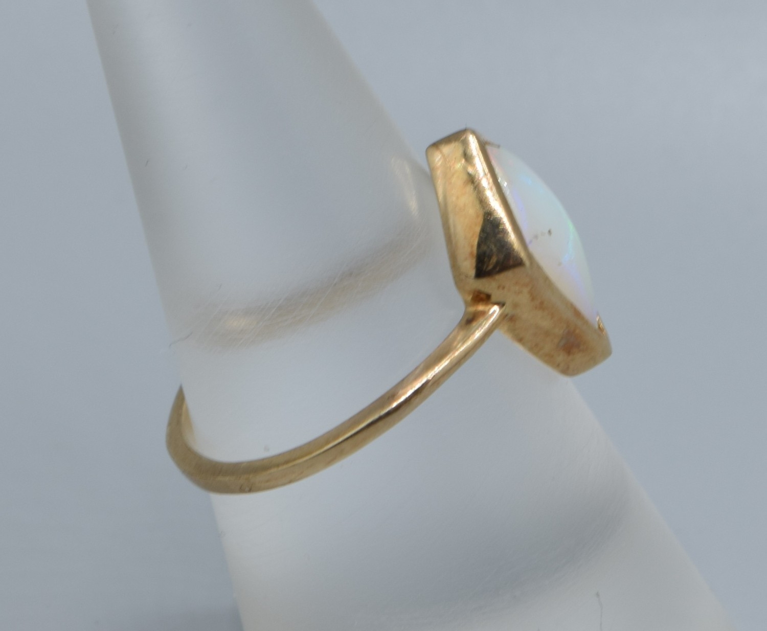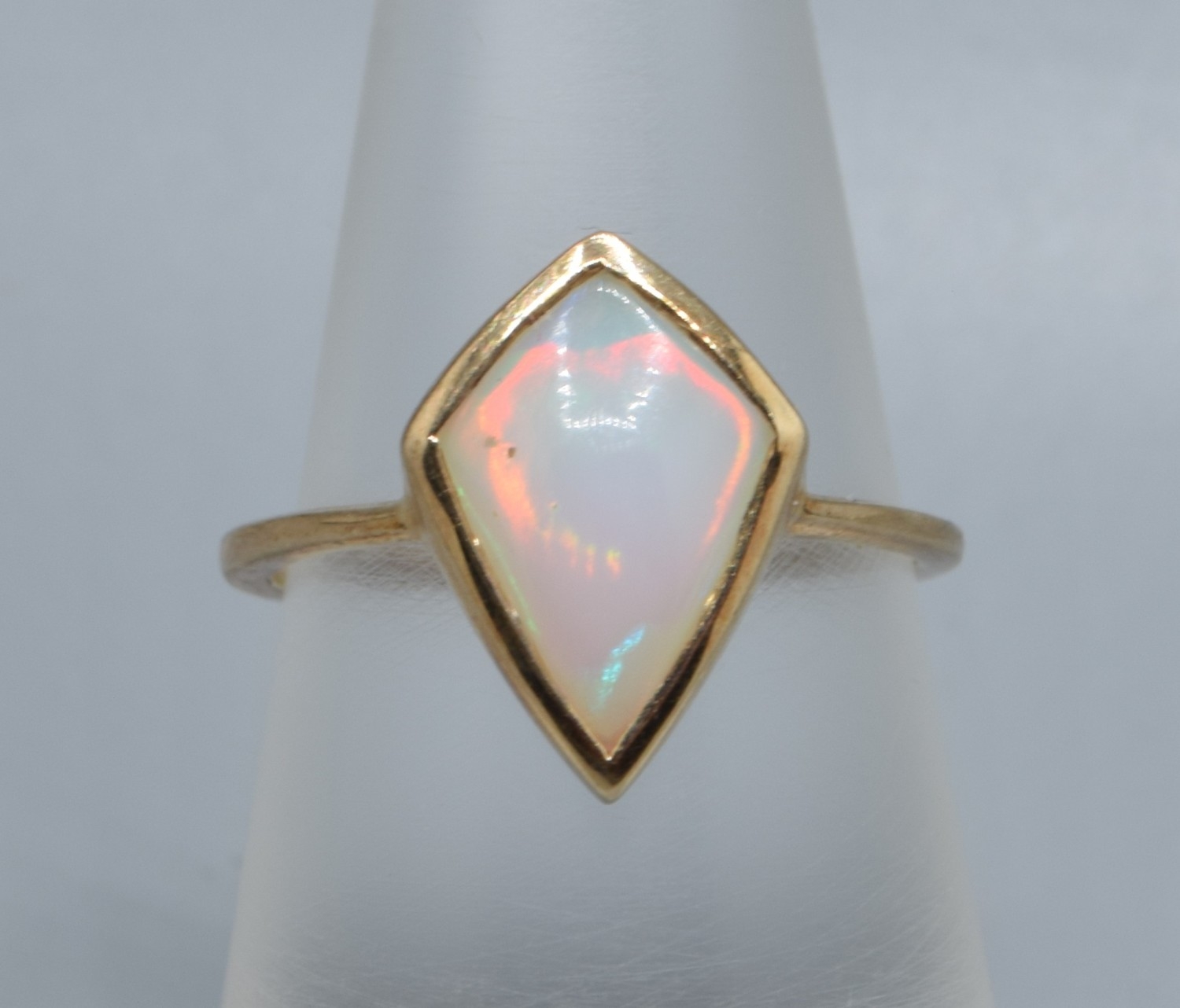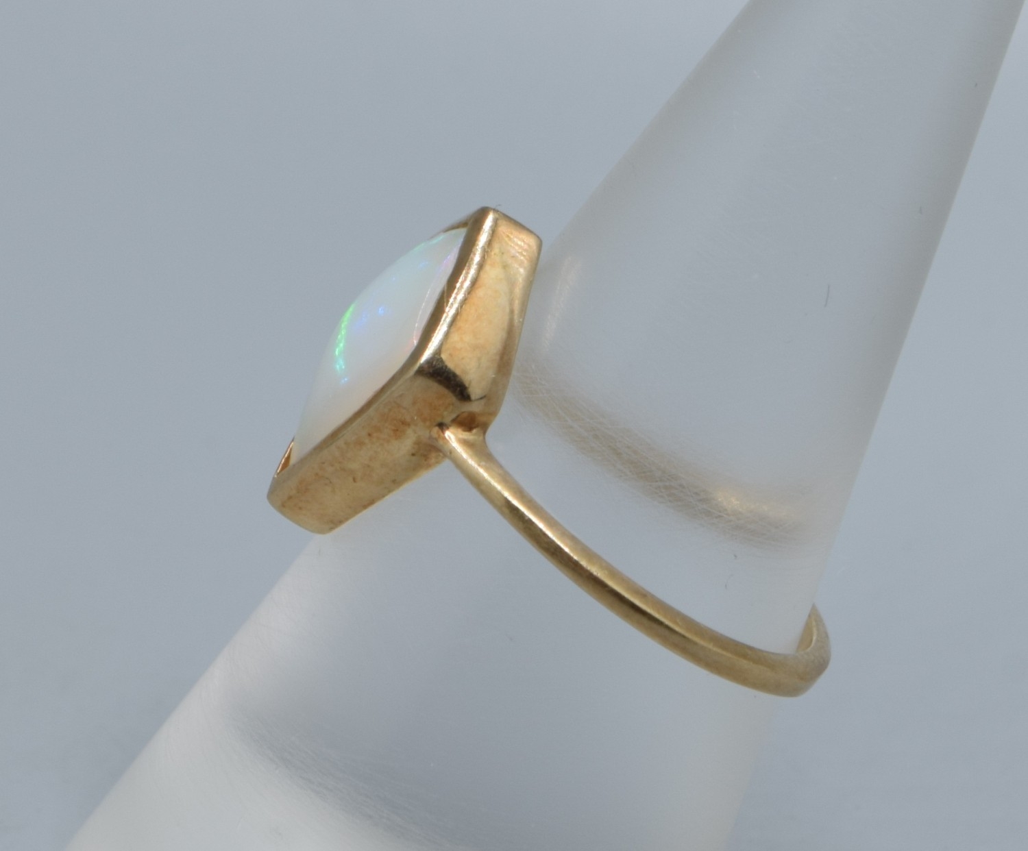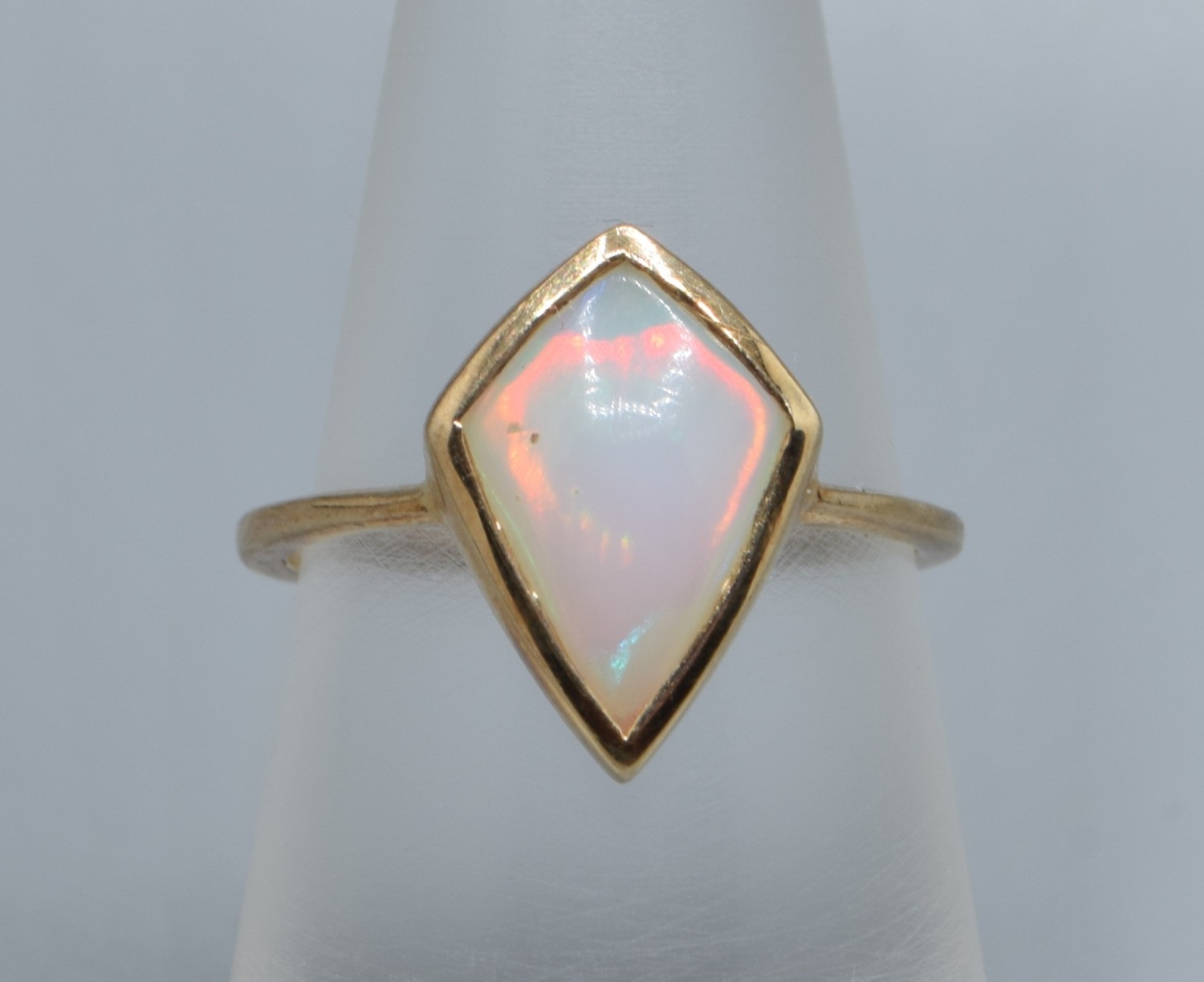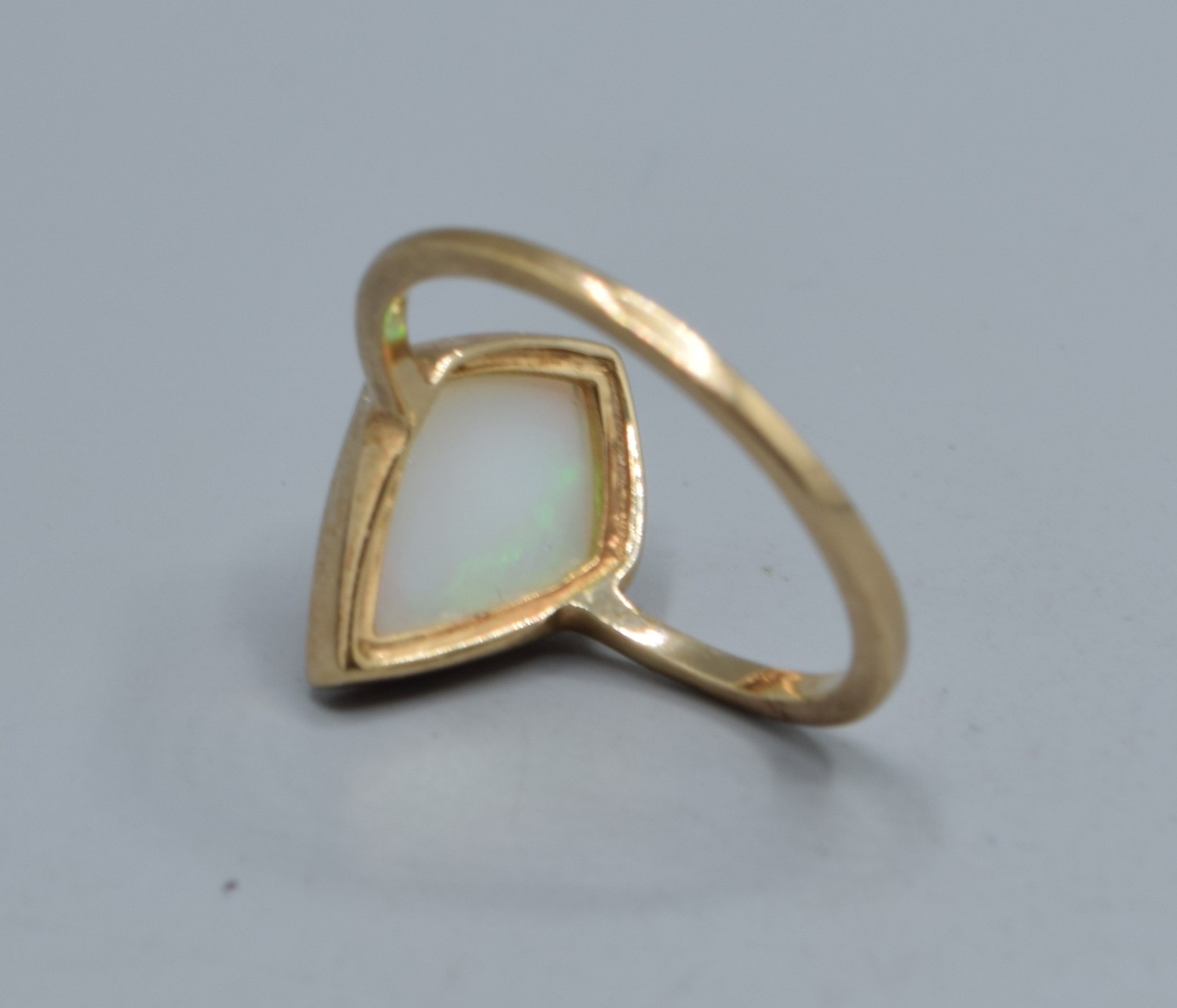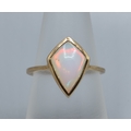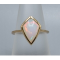 9ct gold ladies Diamond shape Opal single stone ring held in an enclosed design the mead measures 14x10mm size N, 2.3grams