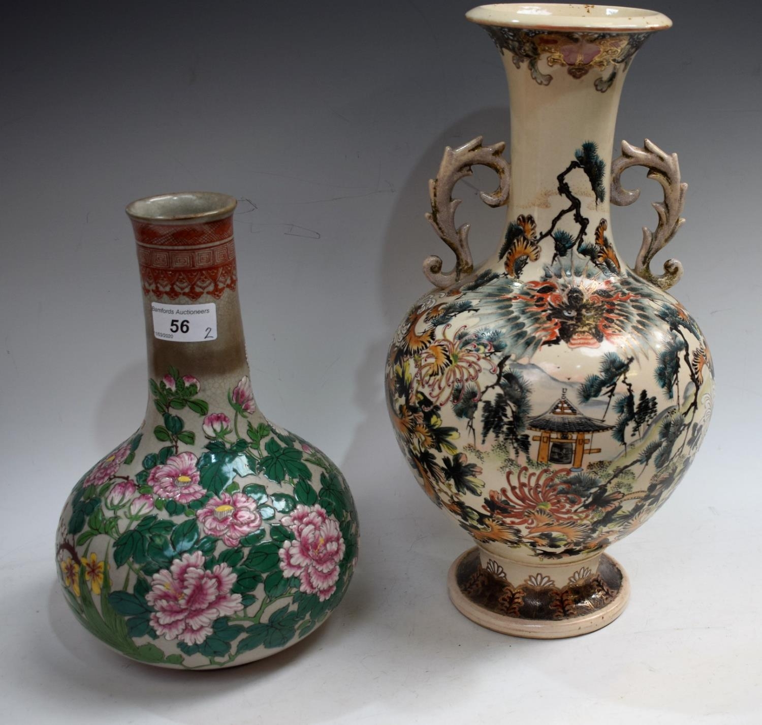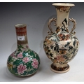 A Japanese Satsuma two handled vase, decorated with with mythical beast, pagoda and foliage, 39cm high, Meiji period; a similar bottle vase (2)