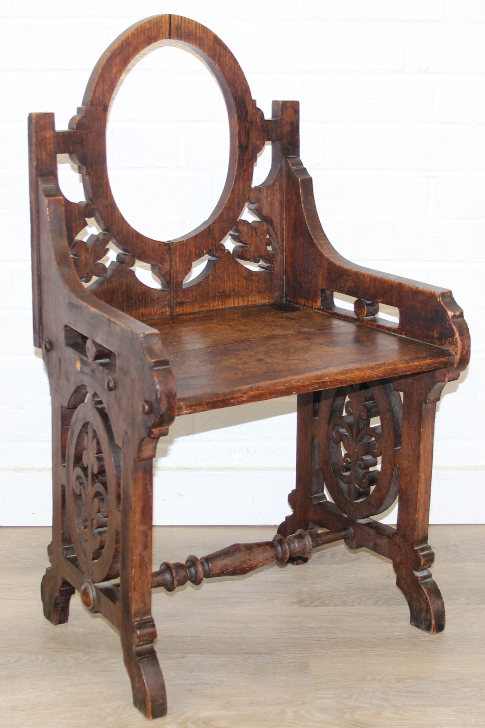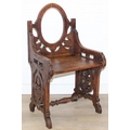 A 19th century oak gothic revival chair of small proportions with round back, possibly a chapel chair, 49cm wide x 84cm tall