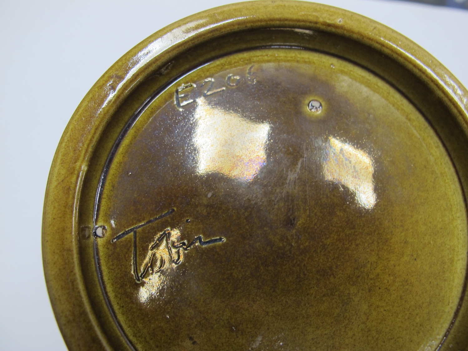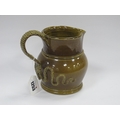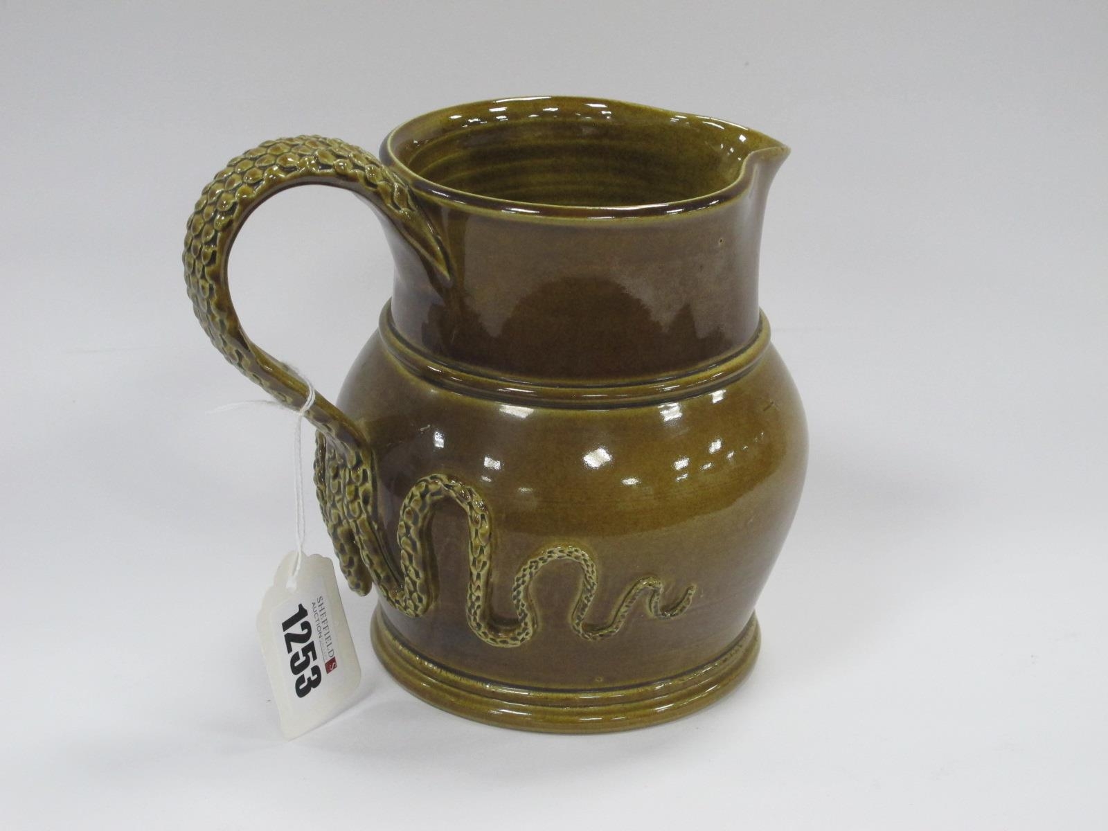 Tobin Green Glaze Jug, with reptile skin effect handle fanning out to body, 6206 and name under base, 15cm high.