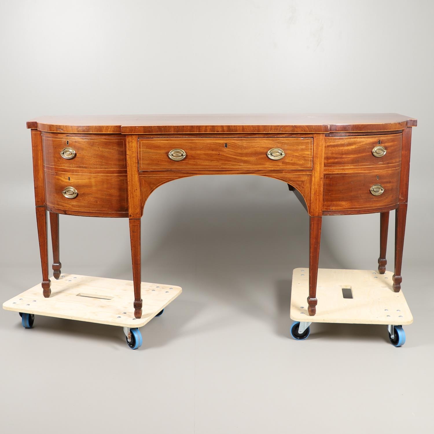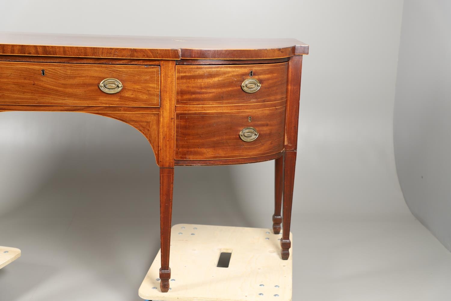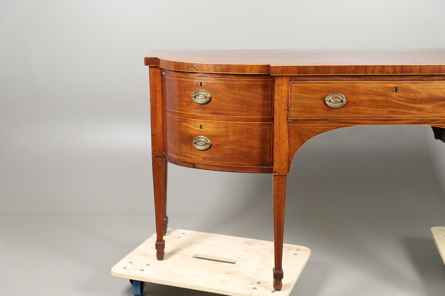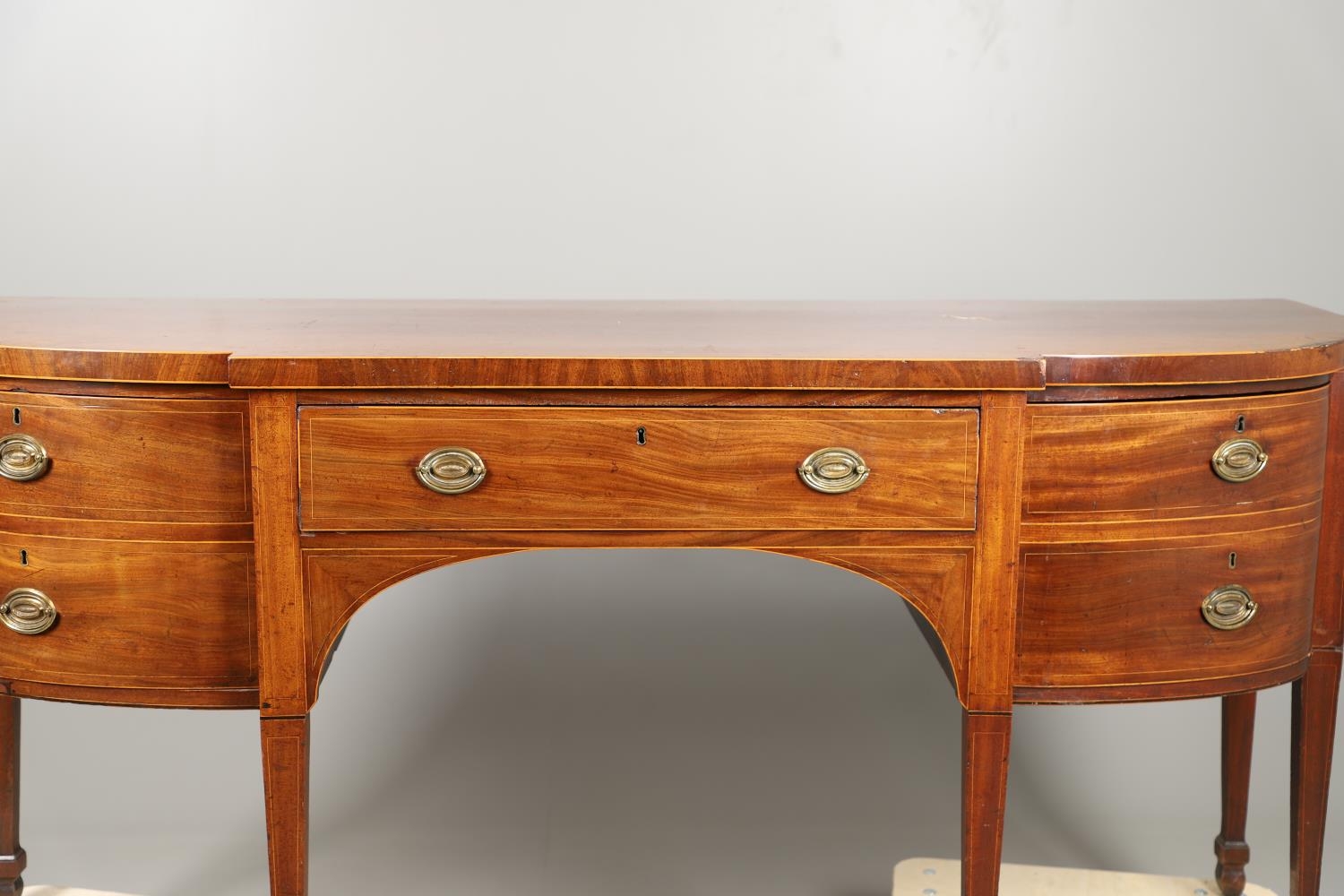 A GEORGE III INLAID MAHOGANY SIDEBOARD. of bow and breakfront form, with an arched recess on tapering square section legs, height 95cm, width 198cm, depth 70cm. ** general wear and tear, scratches and marks throughout, damage and losses to the beading, missing veneer, stains and marks.