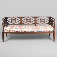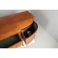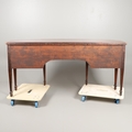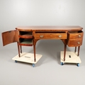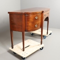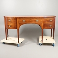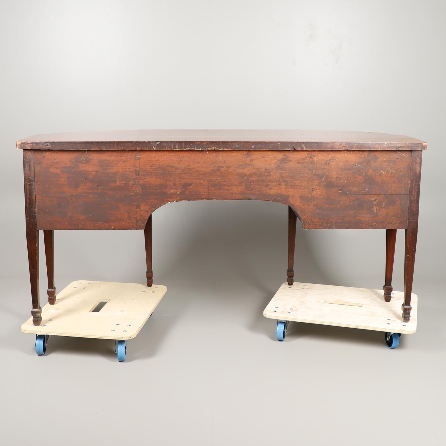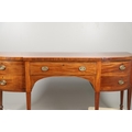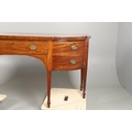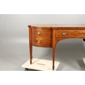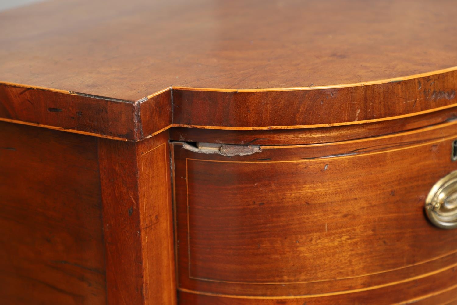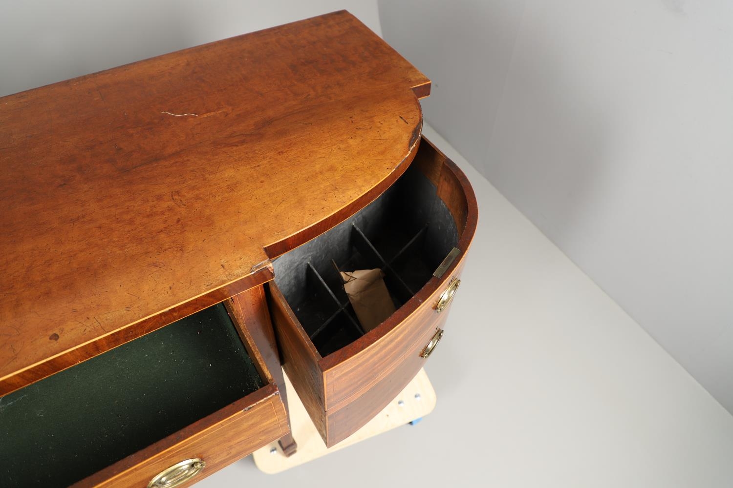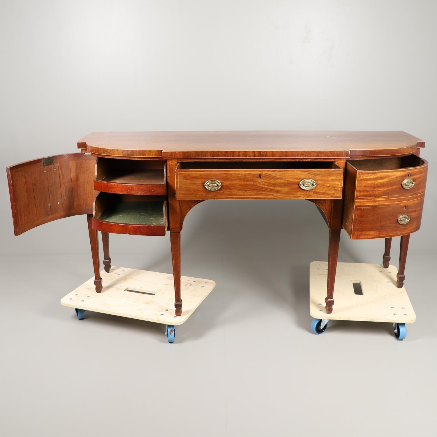 A GEORGE III INLAID MAHOGANY SIDEBOARD. of bow and breakfront form, with an arched recess on tapering square section legs, height 95cm, width 198cm, depth 70cm. ** general wear and tear, scratches and marks throughout, damage and losses to the beading, missing veneer, stains and marks.