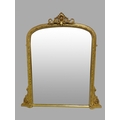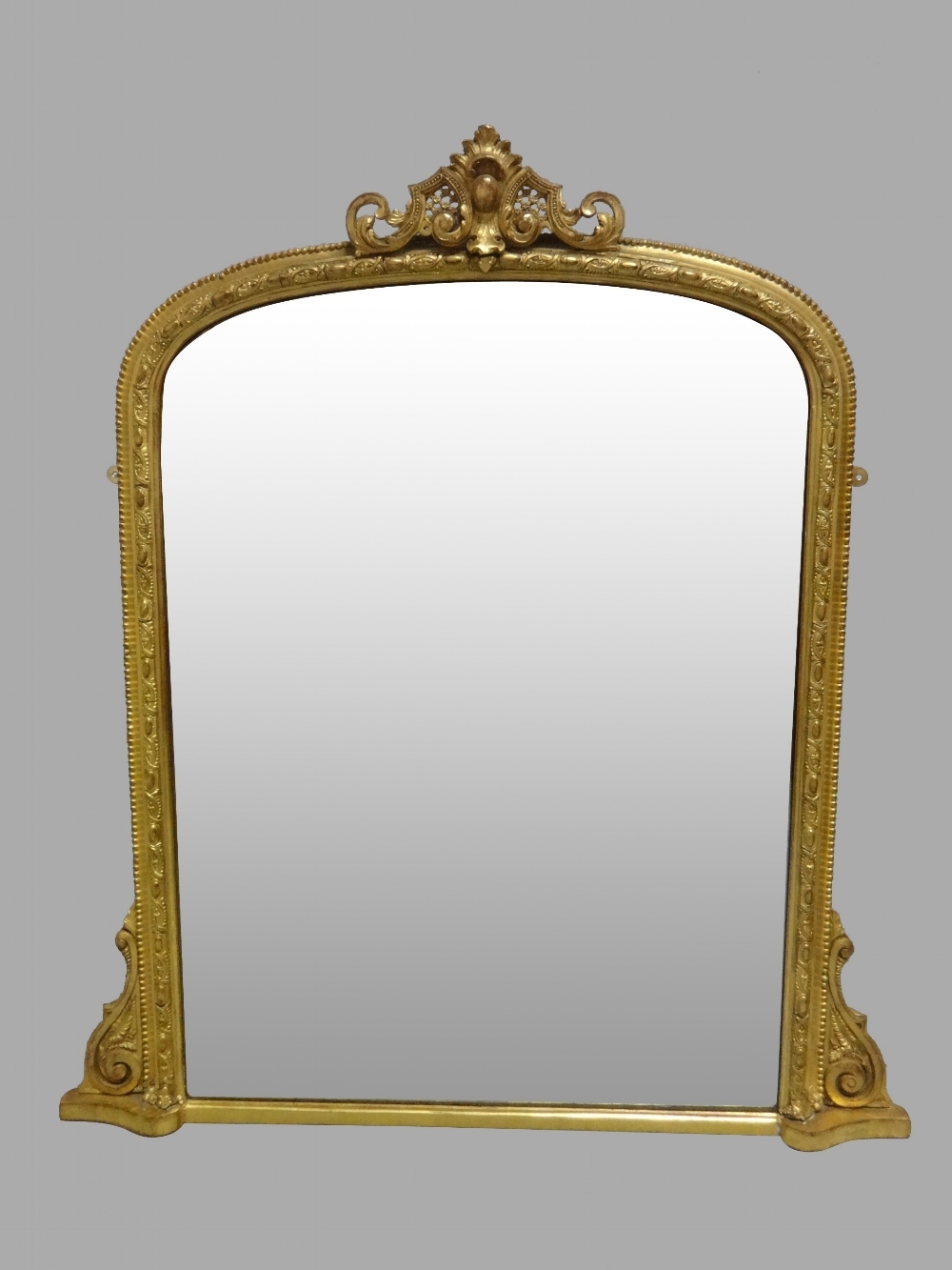 A VERY GOOD QUALITY 19TH CENTURY GILT OVER MANTLE MIRROR, fully restored, having an arched top with beaded detail to the edge, gadrooned motif to the frame, mounted with a carved central decoration and scroll detailed corners to the base, 51" (h) x 46" (w) approx