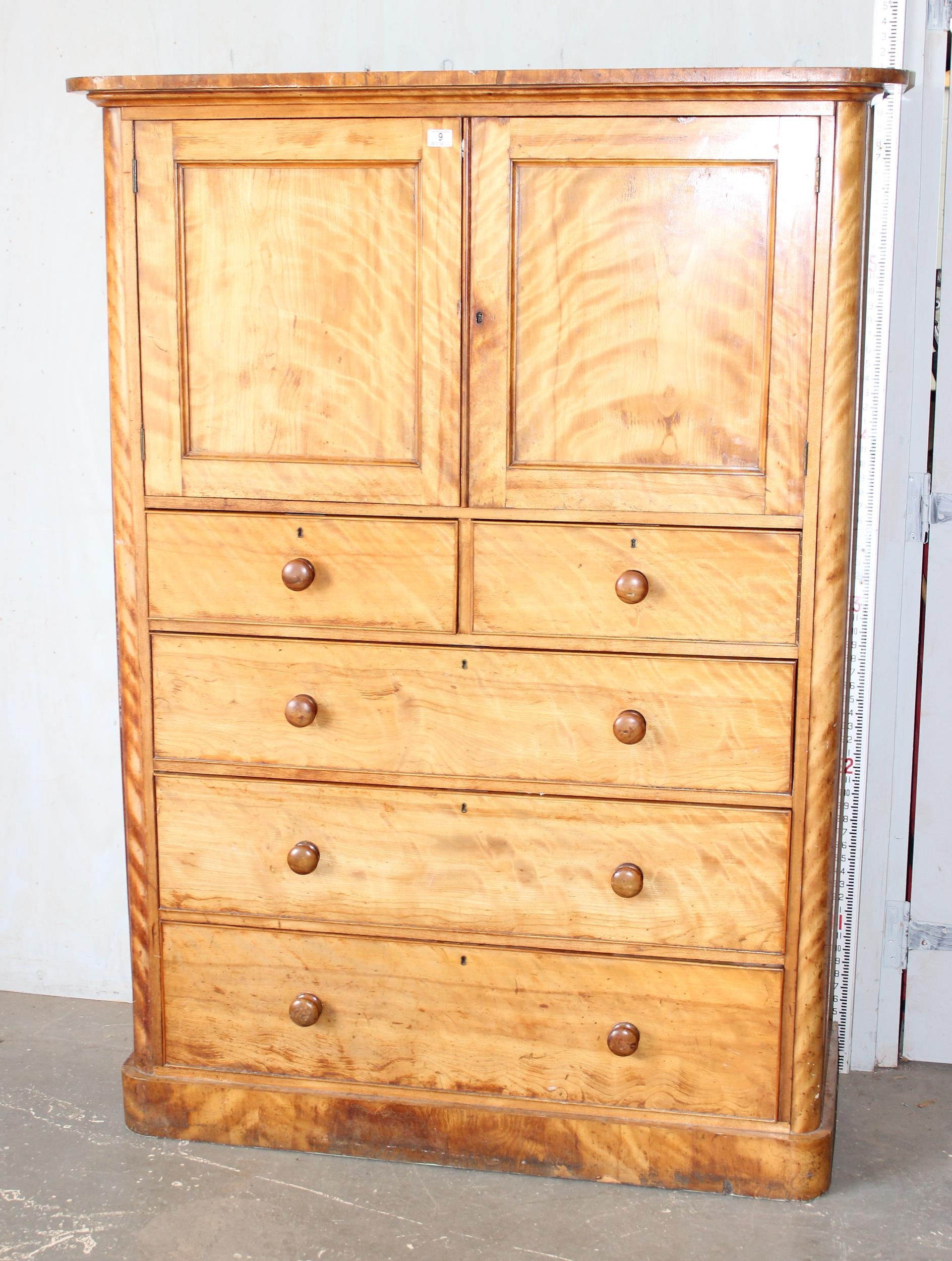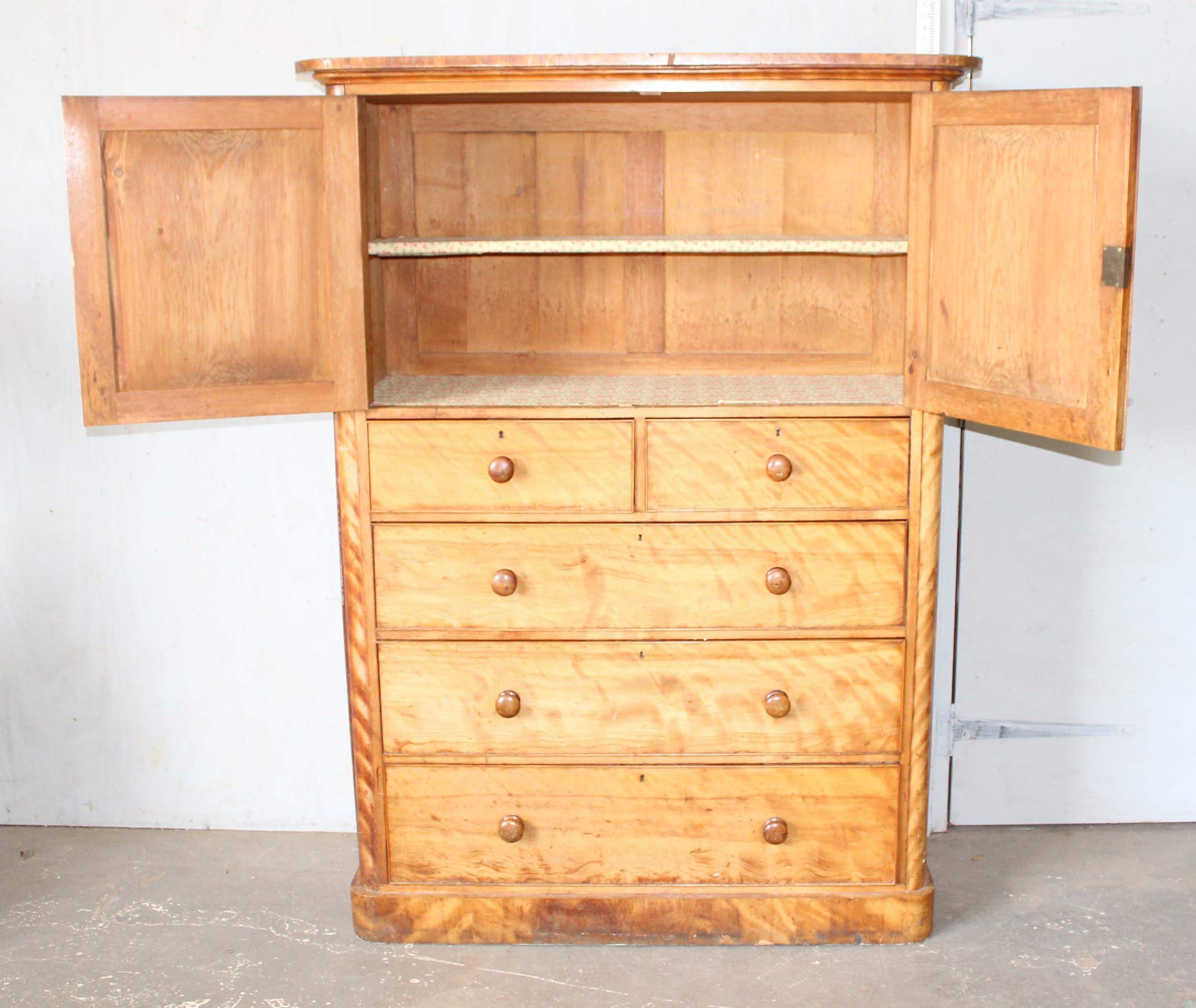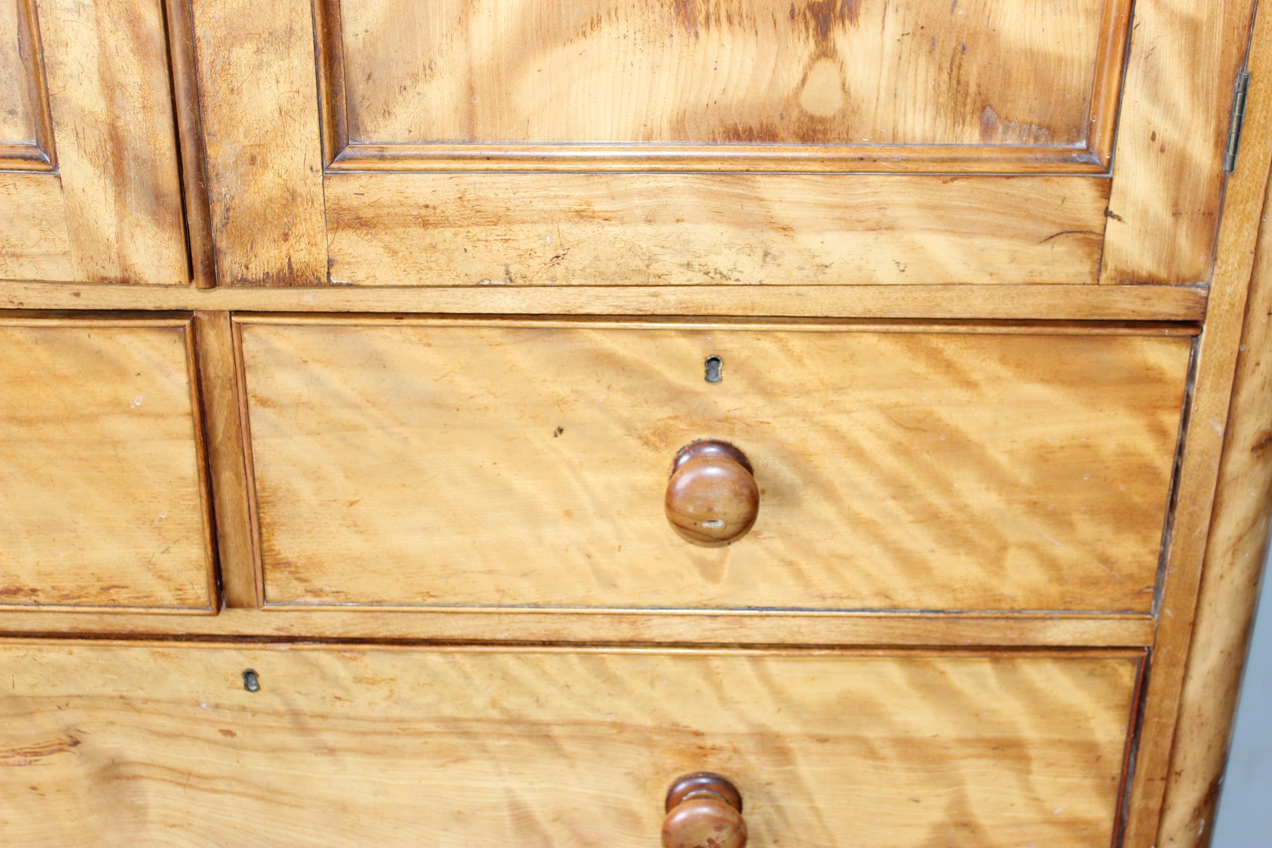An antique satinwood linen press type cupboard standing on over 2/3 drawers