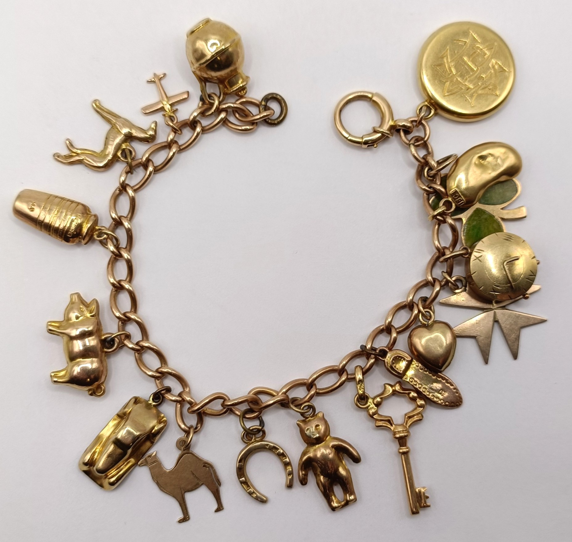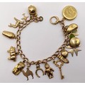 A 9ct gold bracelet, with assorted 9ct and yellow metal charms, 27.7 g all in