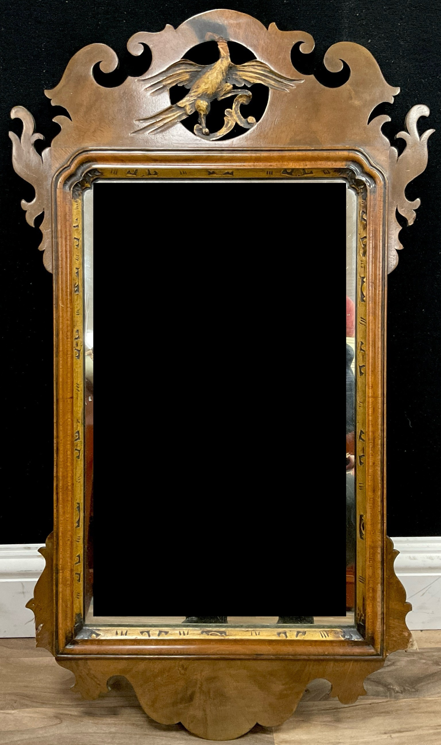 George II style parcel gilt walnut Vauxhall mirror, 80cm high.