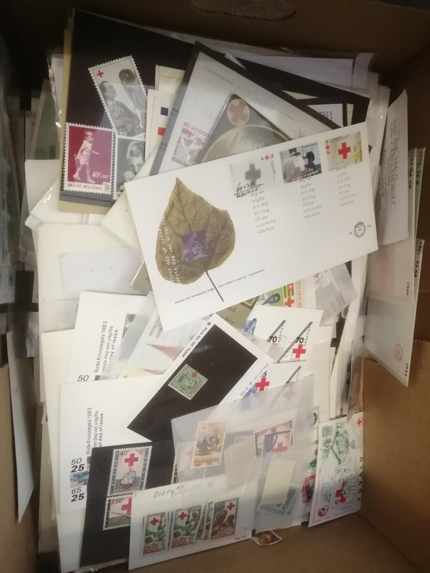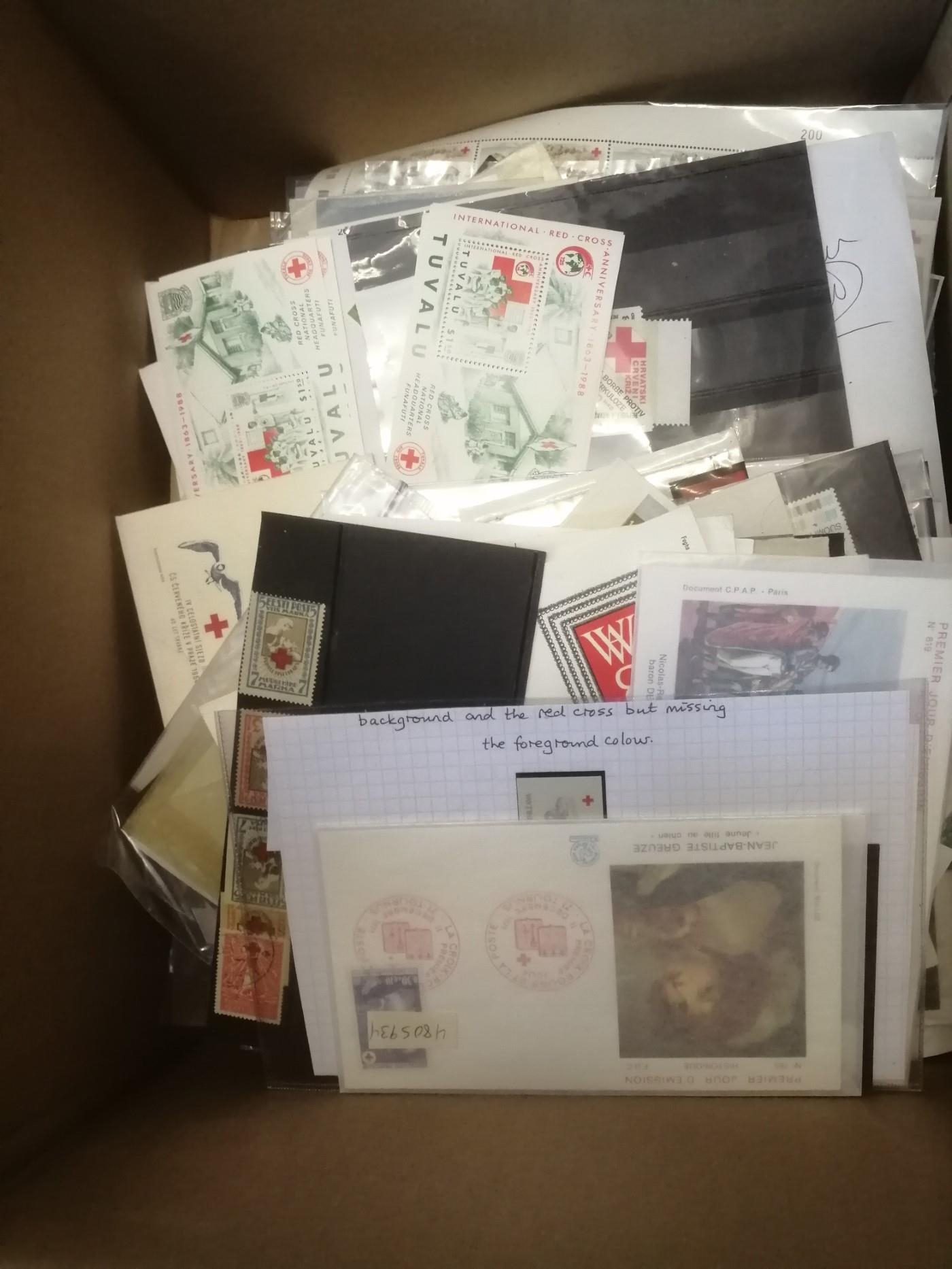 Red Cross. Varied worldwide early to modern loose accumulation, incl items, sets, vals in mint blocks, bklts, covers, postcards, airmails etc. Noting M/U coln Jamaica WW1 & WW2 Red Cross labels incl on 1917 cover. Requires sorting. (½B)