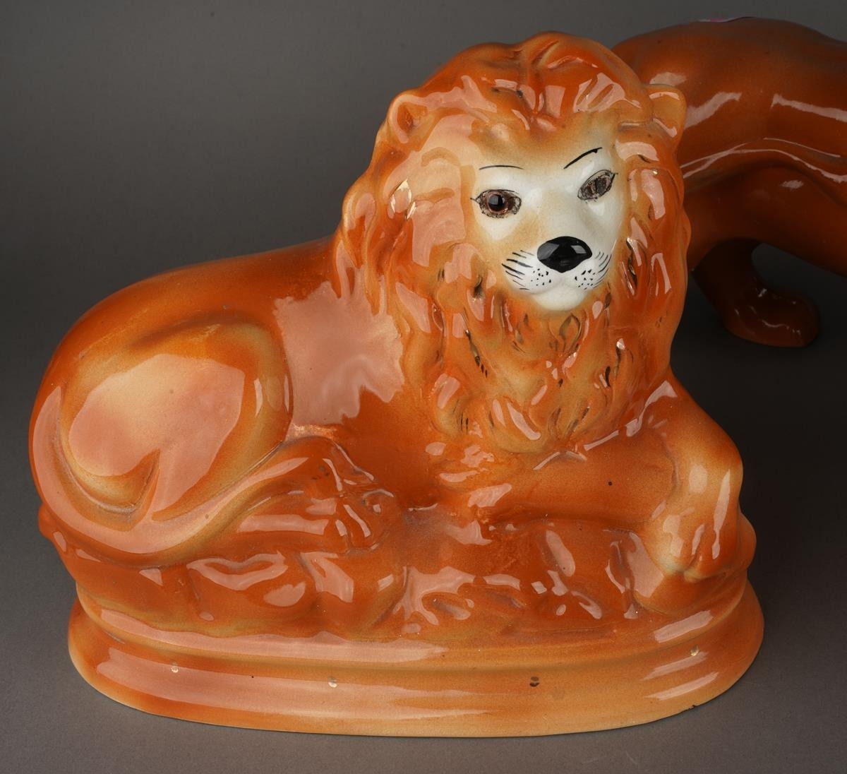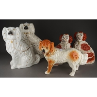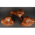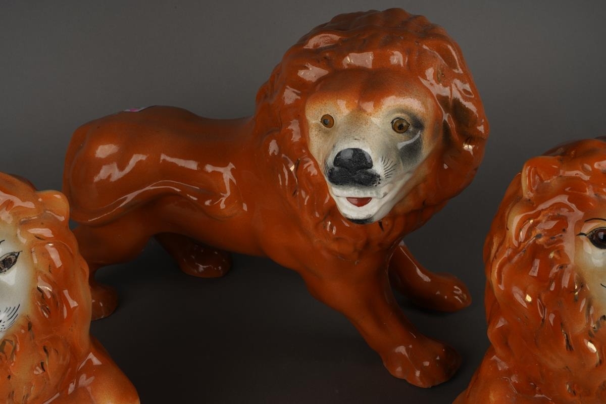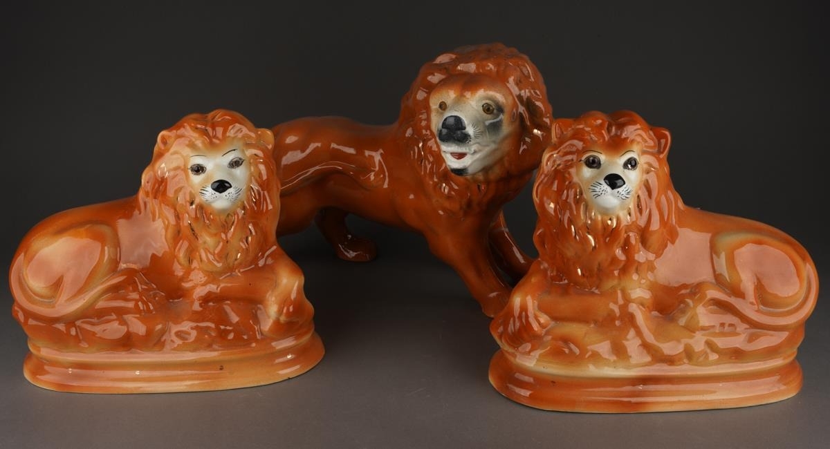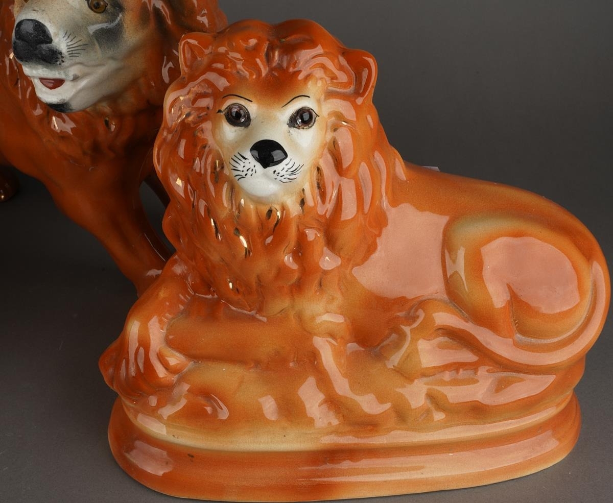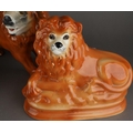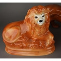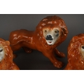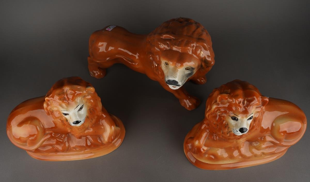 A large Staffordshire style model of a standing lion, approx 27cm high together with a pair of Staffordshire large recumbent lions, approx 27cm long [3]